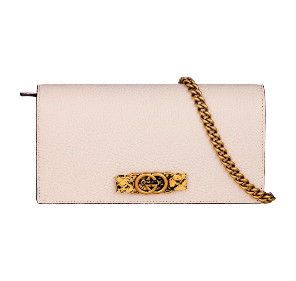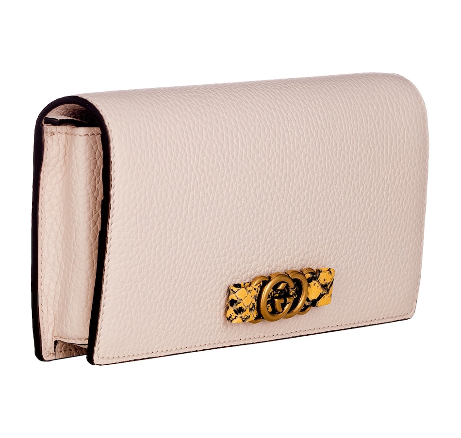 At the center of the wallet, the iconic Interlocking G logo in gold-tone metal adds a signature touch of Gucci's unmistakable style. The combination of the iconic logo, the rich leather, and the python leather bow elevates this wallet to a truly luxurious accessory.