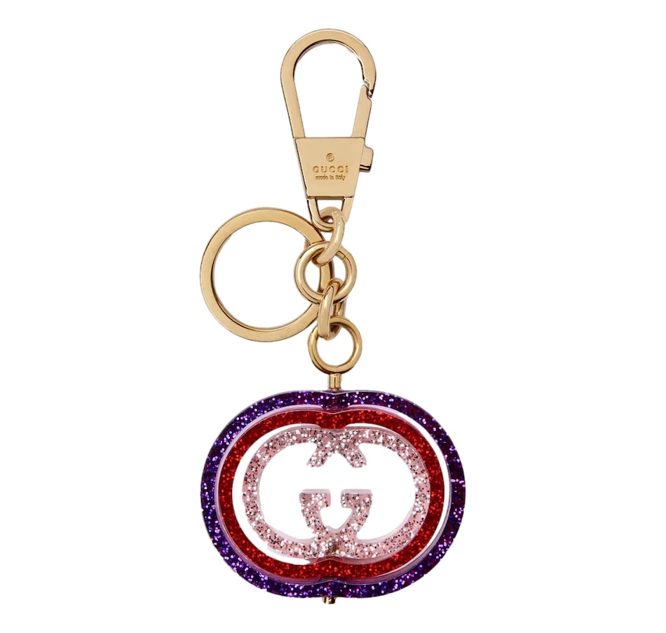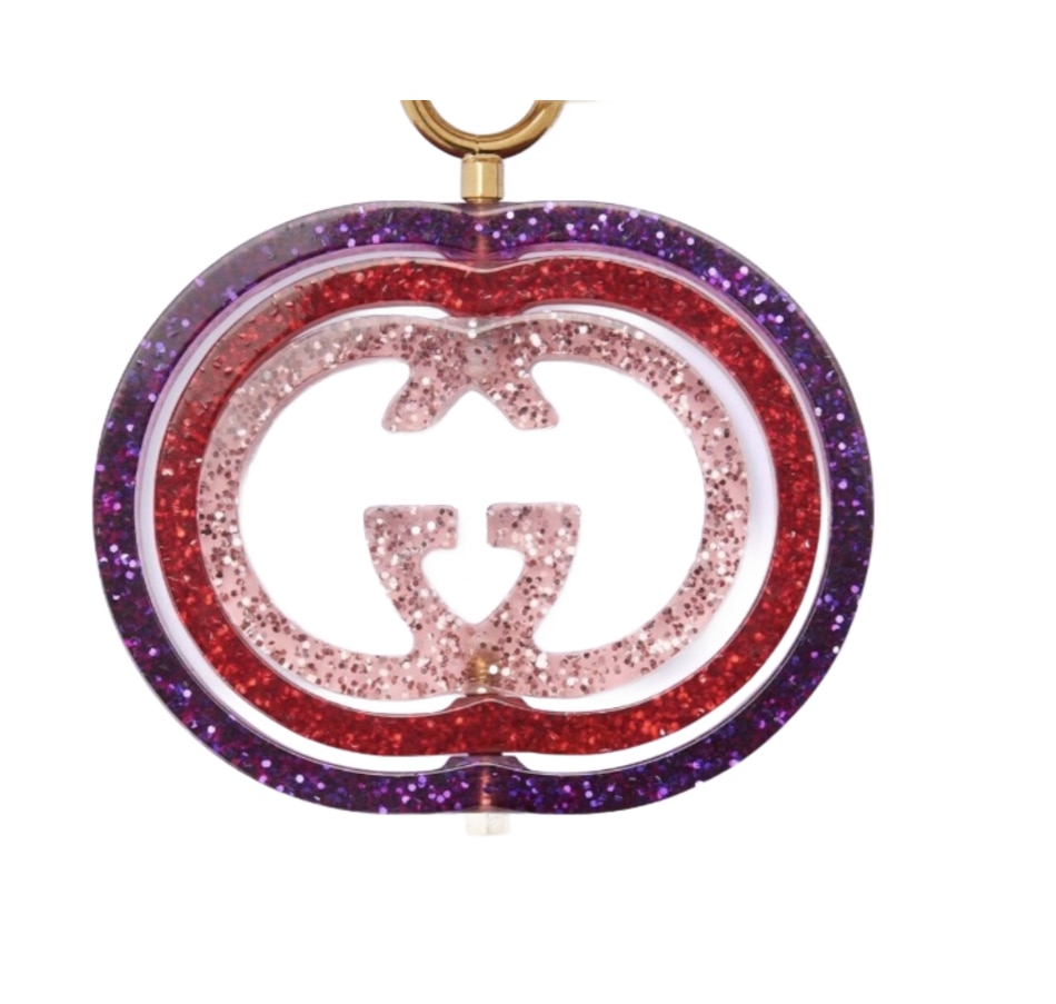 The Gucci Interlocking G Purple and Red Glitter Keychain Handbag Charm is the ideal choice for those who want to infuse their accessories with a fun, luxurious, and unique touch.