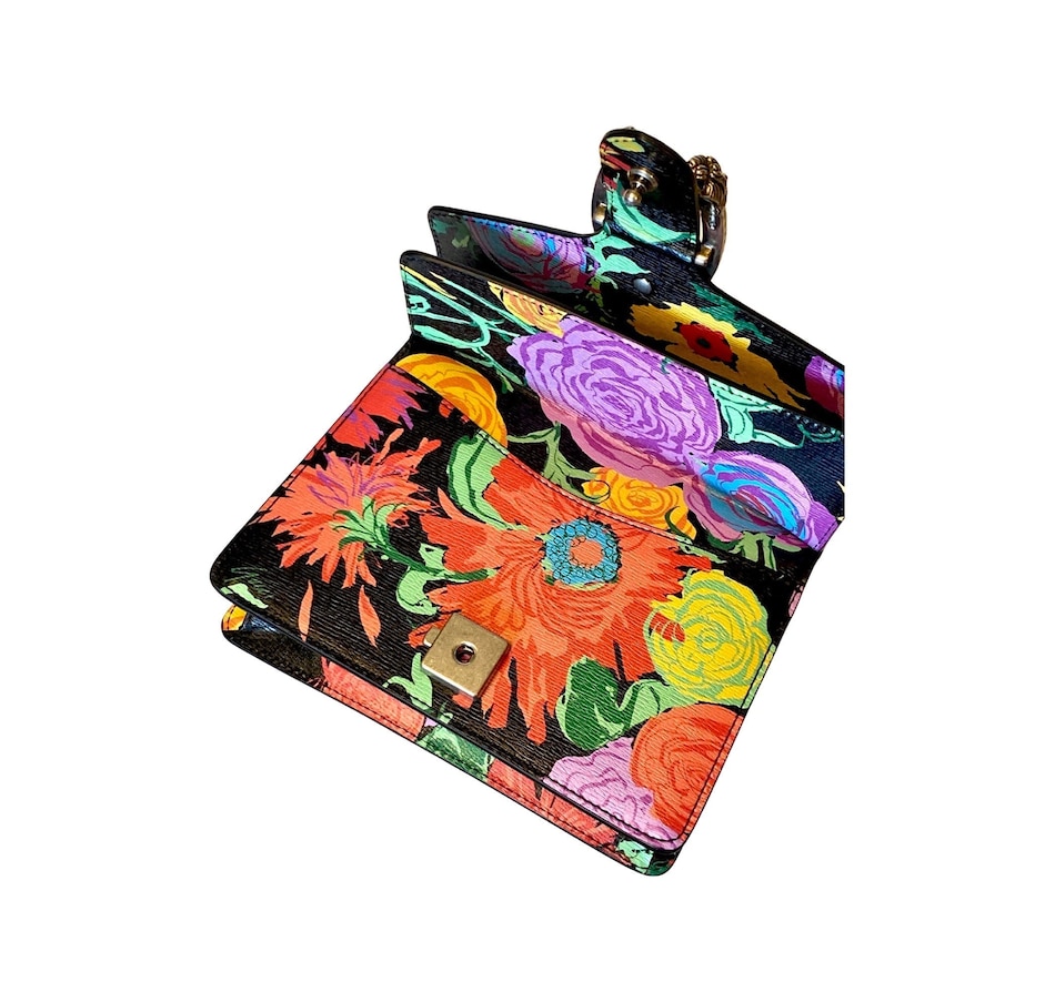 The Gucci x Ken Scott collaborations is one of our favorites. Featuring bold prints and colors you can't help but find your happy place.  This Gucci x Ken Scott Dionysus Floral Shoulder Bag has a black background that lets the bold floral colors shine.  This is the perfect statement bag for spring/summer and beyond.  This small shoulder bag features aged silver-tone hardware, the iconic horseshoe hardware and adjustable chain strap. This statement piece also features an interior flap pocket underneath the flap pocket Model: 421979 Dionysus Floral Print Calfskin leather Gucci x Ken Scott Leather interior lining Exterior flap pocket Adjustable chain strap Shoulder strap drop: 15" Measurements: 8" x 2" x 6" (LWH) Includes authenticity cards and dust bag Made in Italy