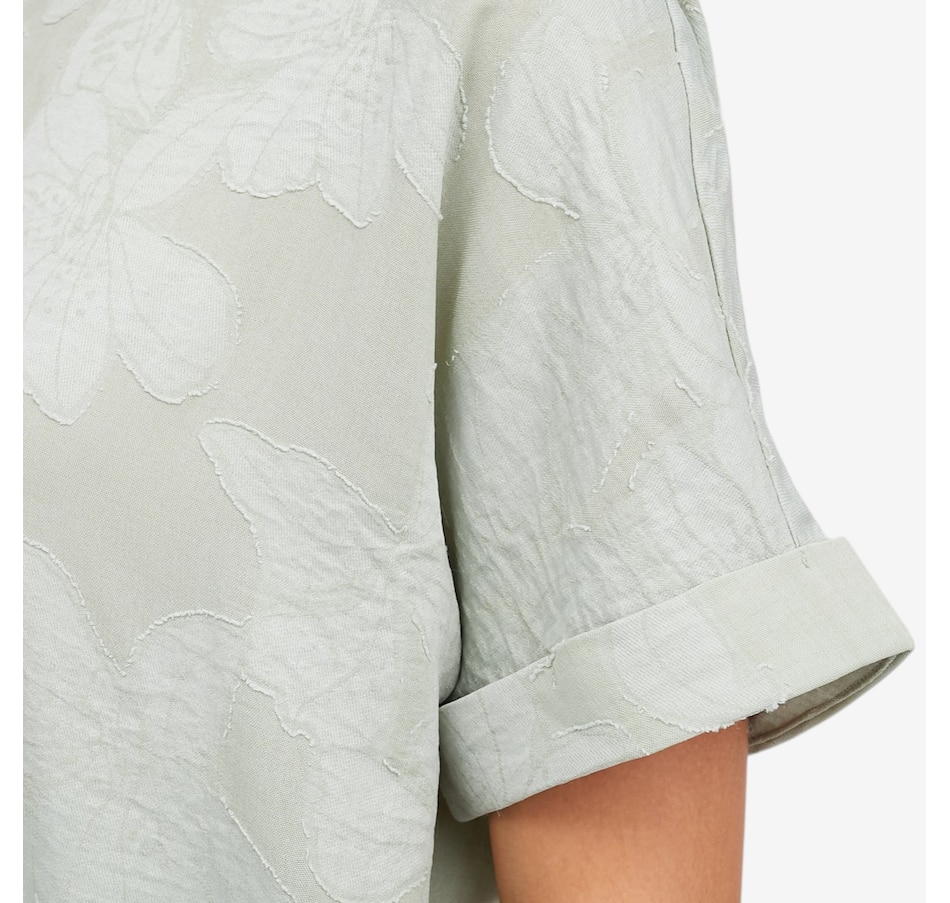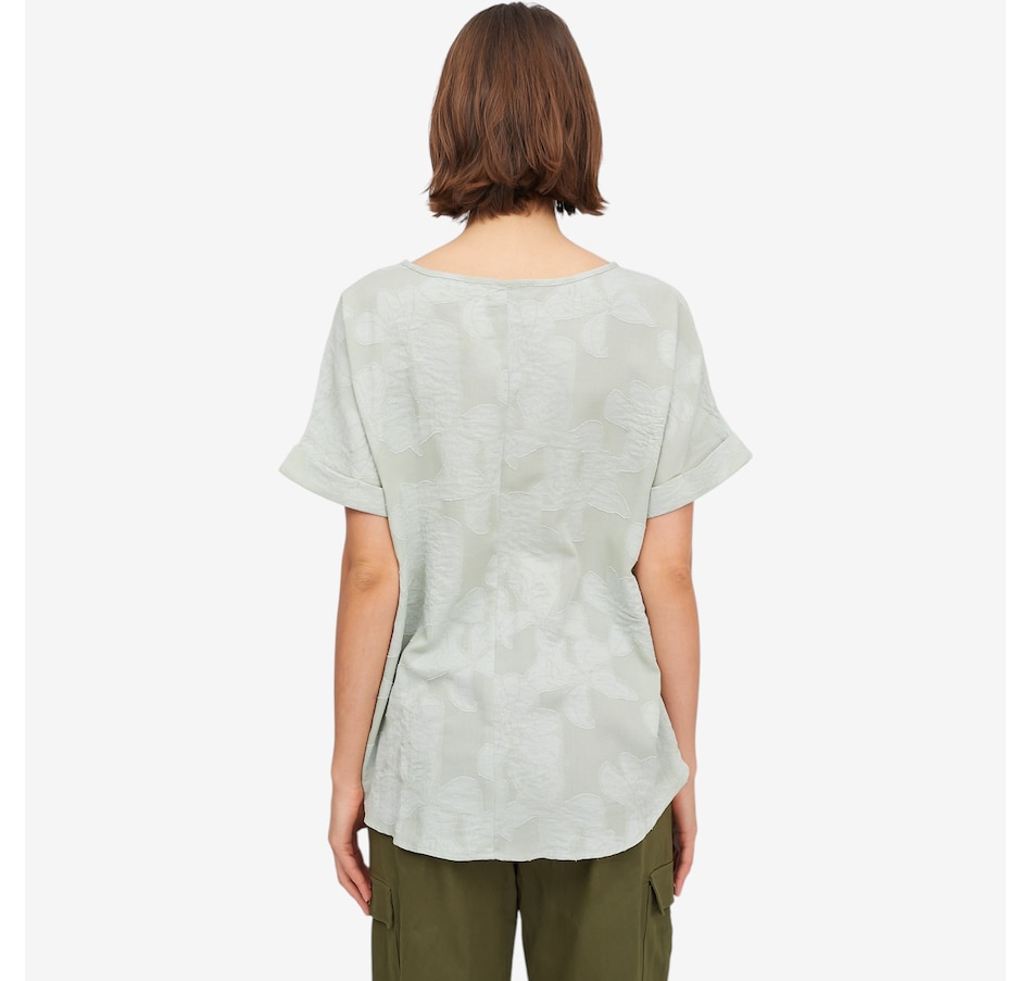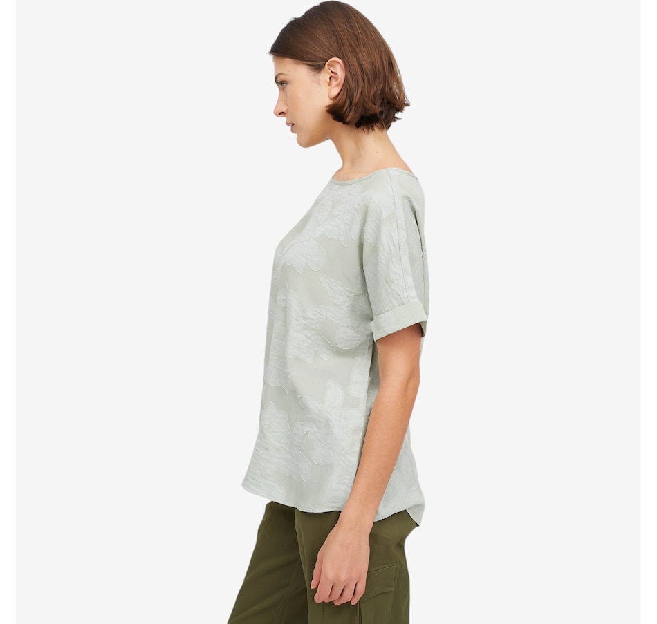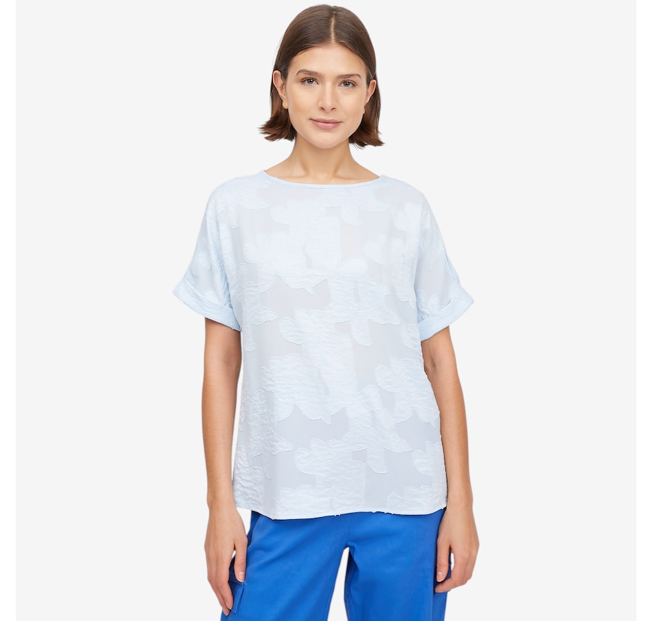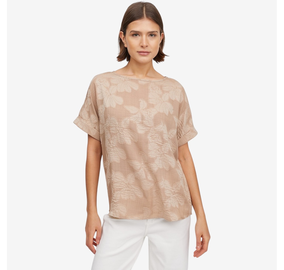 Bring effortless elegance to your wardrobe with the Guillaume boat neck applique top, a beautifully crafted piece elevated by a special floral appliqué technique that gives the fabric refined depth and dimension. Large, sculptural blooms add artistic interest to this classic silhouette, while the boat neckline and soft cap‑sleeve details create a graceful, flattering frame. Designed with a relaxed dolman cut and finished with a polished 3/5" three‑fold hem, this top offers easy sophistication for endless outfits and occasions.