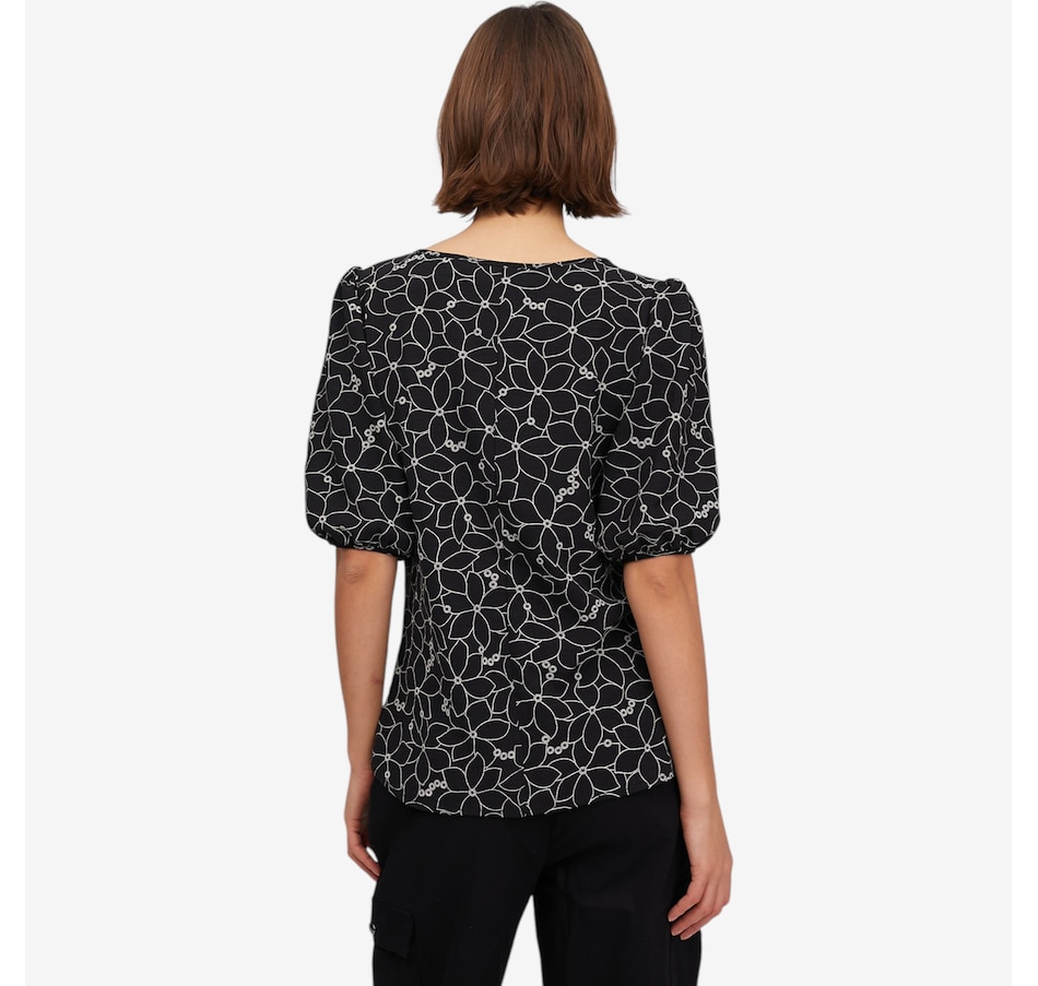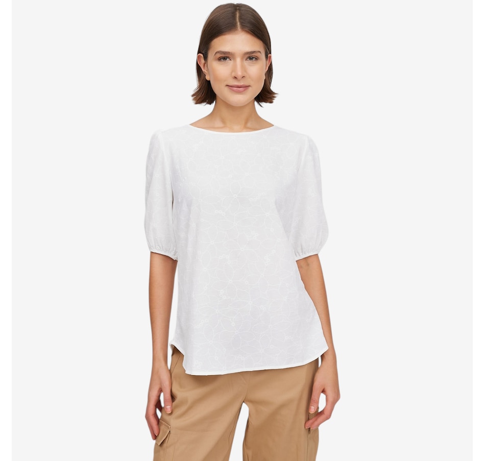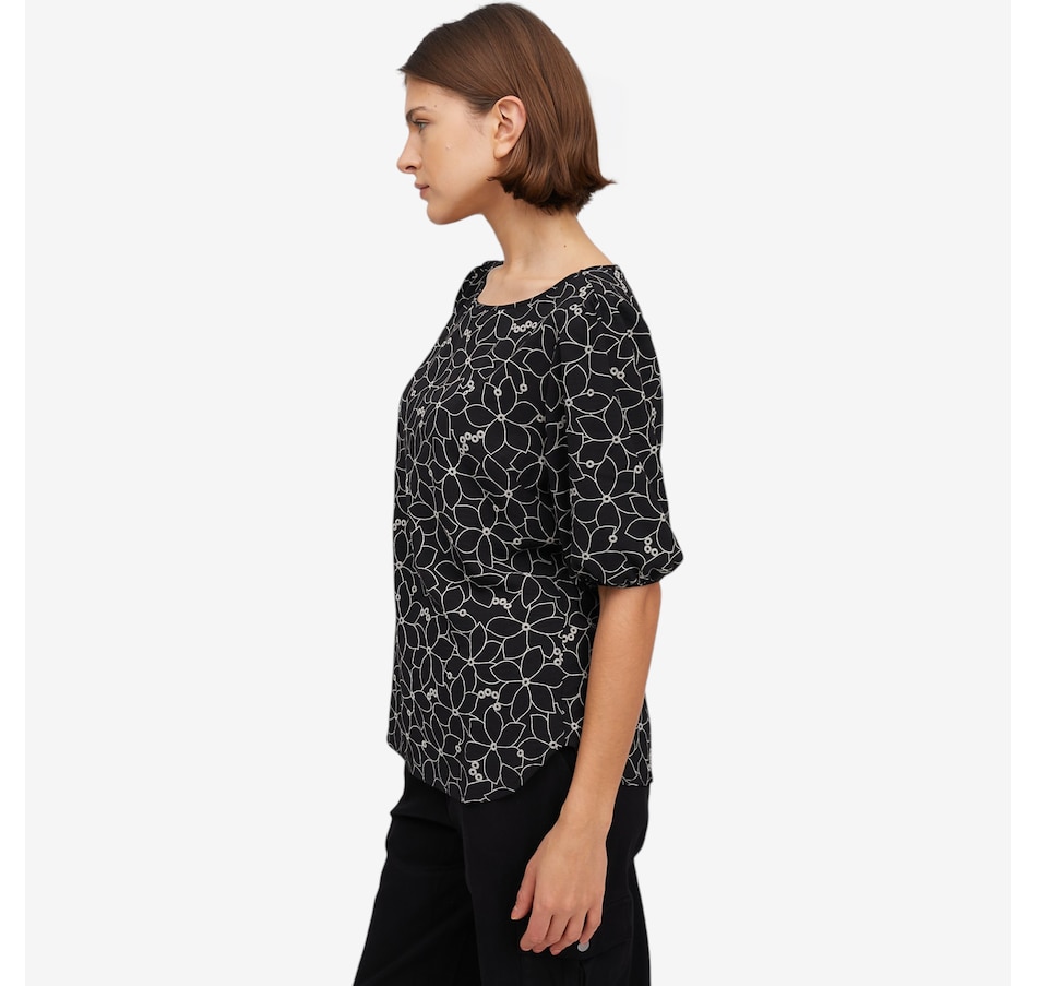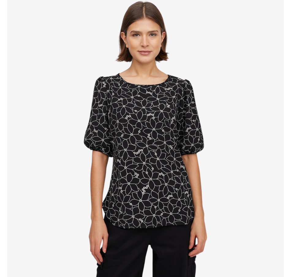 Bring refined, feminine style to your wardrobe with the Guillaume boat neck ruched sleeve top, a beautifully detailed piece elevated by delicate flocking that creates an elegant floral pattern that's ideal for spring and beyond! Designed with a graceful boat neckline, soft puffed blouson sleeves, and a flattering curved hemline, this top offers effortless sophistication in a loose, comfortable fit. Finished with a polished 3/5" hem, it drapes beautifully and pairs seamlessly with trousers, skirts, or denim.