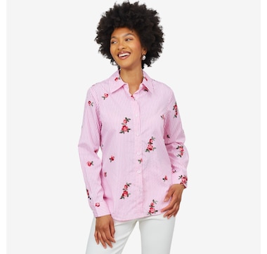 Crafted with a breezy and refined eyelet textile, this classic shirt is updated with artistic touches and elegant details. Offered in a variety of colours ranging from classic to bold, including watercolor floral motifs. A matching layering tank is also available. Get yours today at a fantastic showstopper value, right here at TSC!