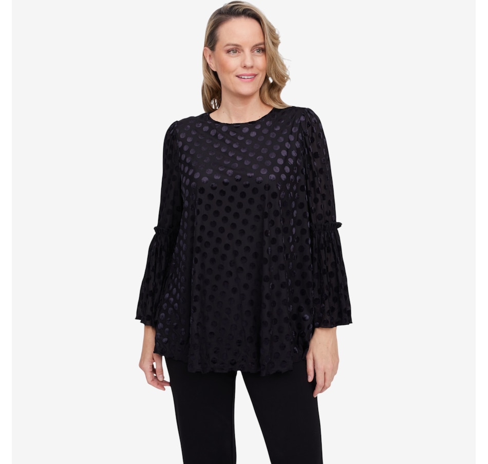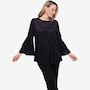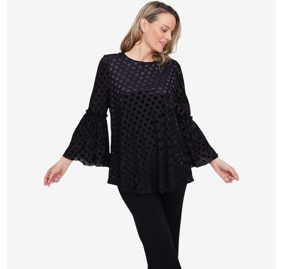 Indulge in the luxurious elegance of this flocked velvet bell sleeve top from Guillaume, a piece that feels as exquisite as it looks. Crafted in rich black velvet with a delicate flocked design, it offers a subtle play of texture and sophistication. Fully lined for comfort and structure, this top glides effortlessly over your silhouette, while the pull-on design makes dressing simple and graceful. Perfect for evenings that call for a touch of drama, it pairs beautifully with sleek trousers or a flowing skirt.