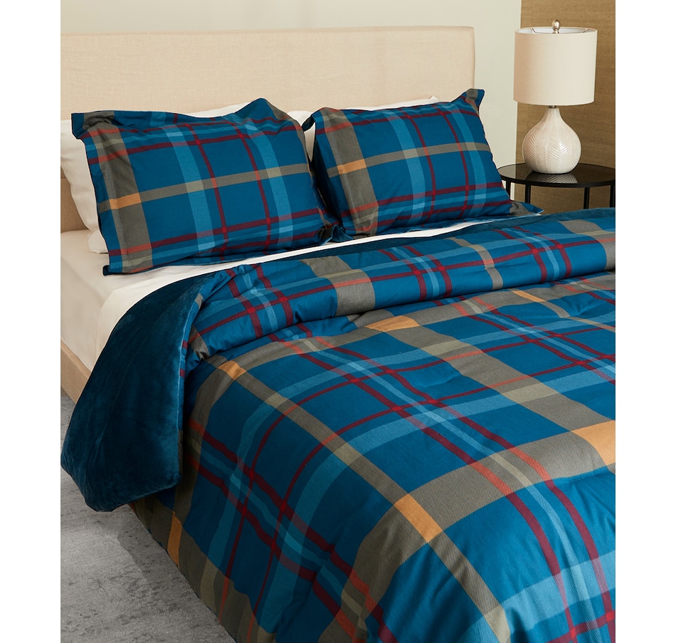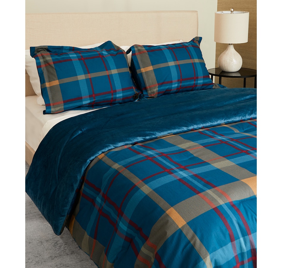 The Guillaume Home 100% cotton plaid three-piece comforter set is as attractive as it is versatile, with a navy ground and striped plaid in light blue, tan and burgundy. Its 100% cotton is natural and breathable, and will continue to get softer after