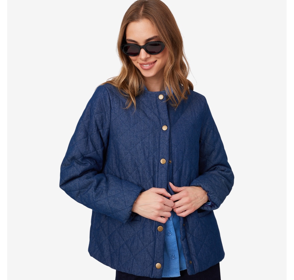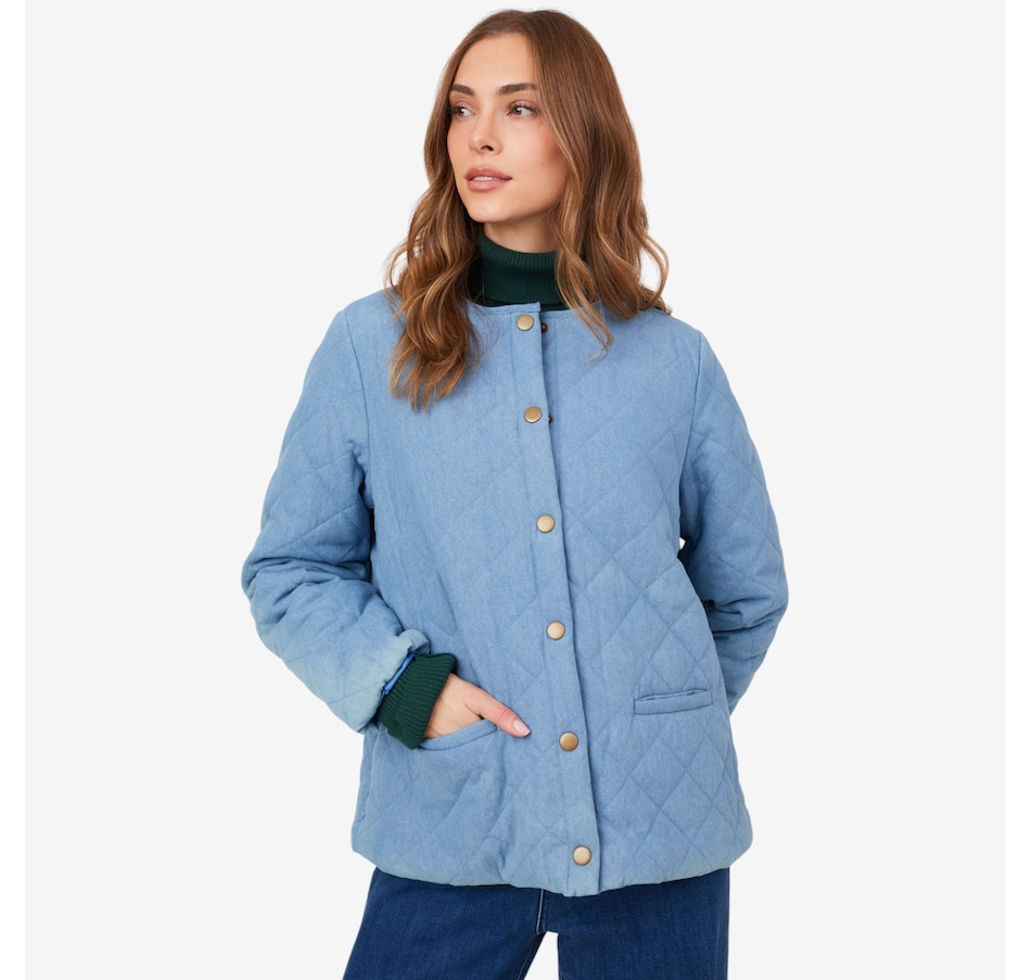 You'll finish your fall look in attractive style wearing this quilted soft denim jacket from Guillaume. This take on the classic barn jacket is collarless and combines a lightly filled diamond-quilted construction with lightweight denim in a medium