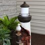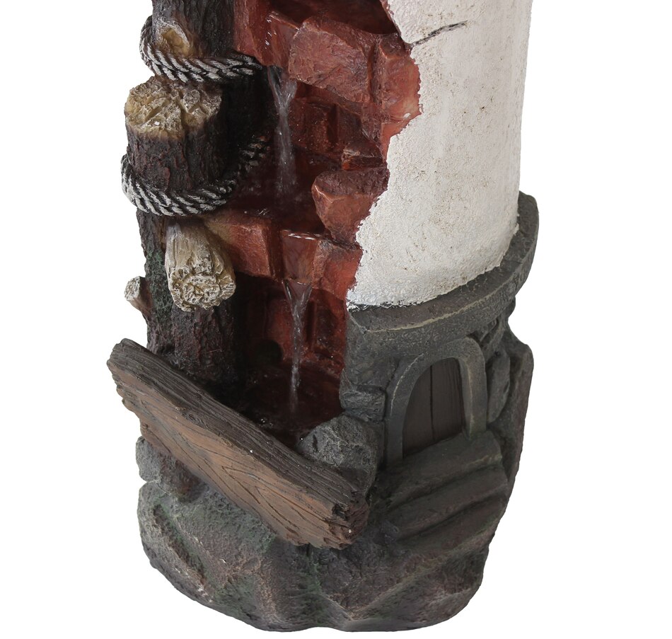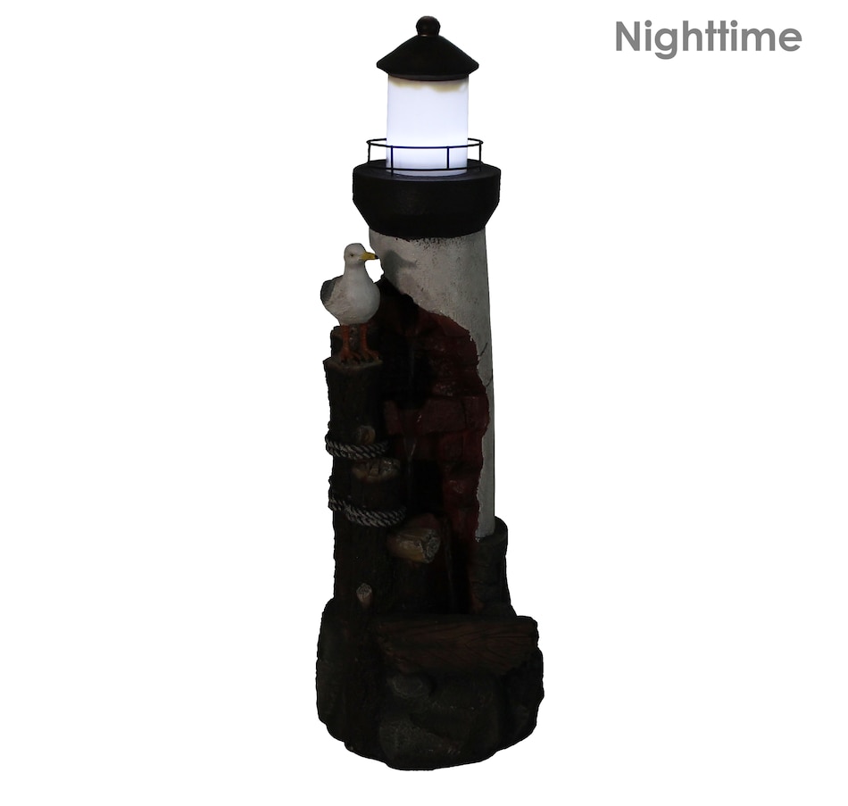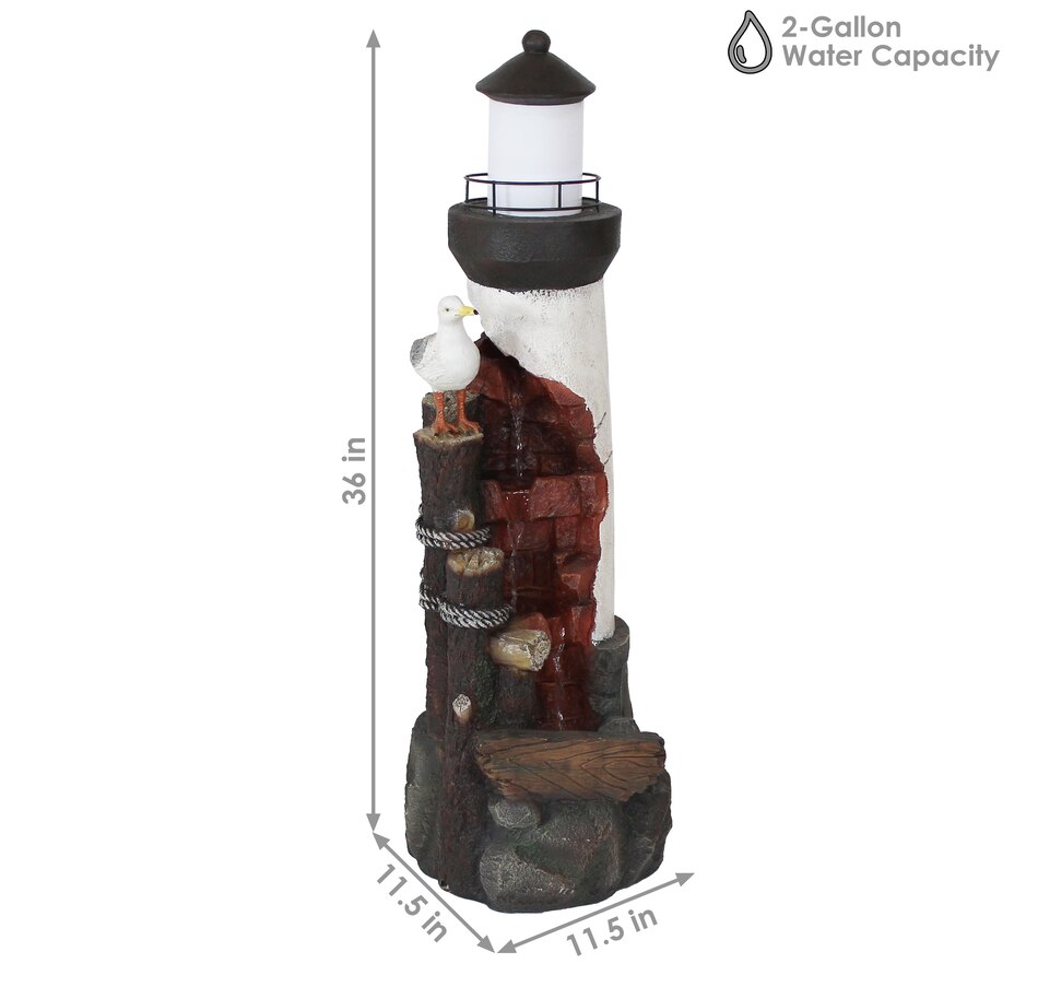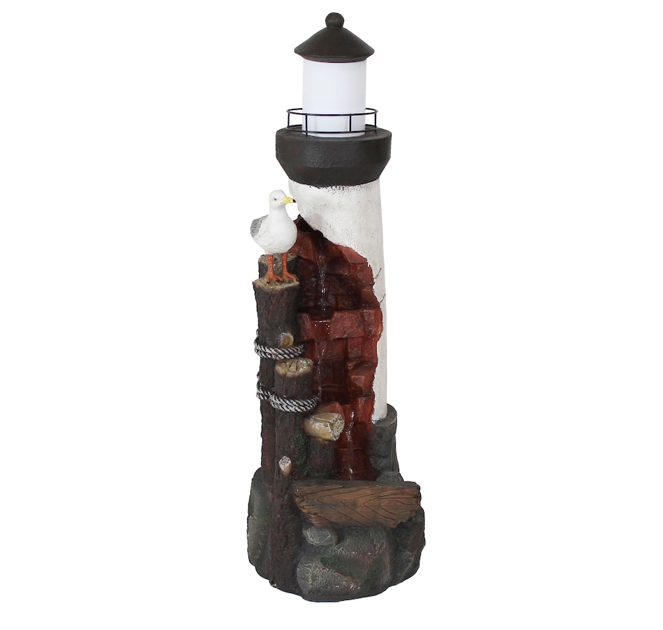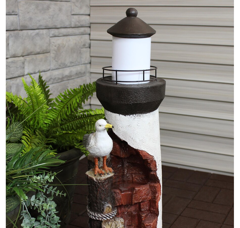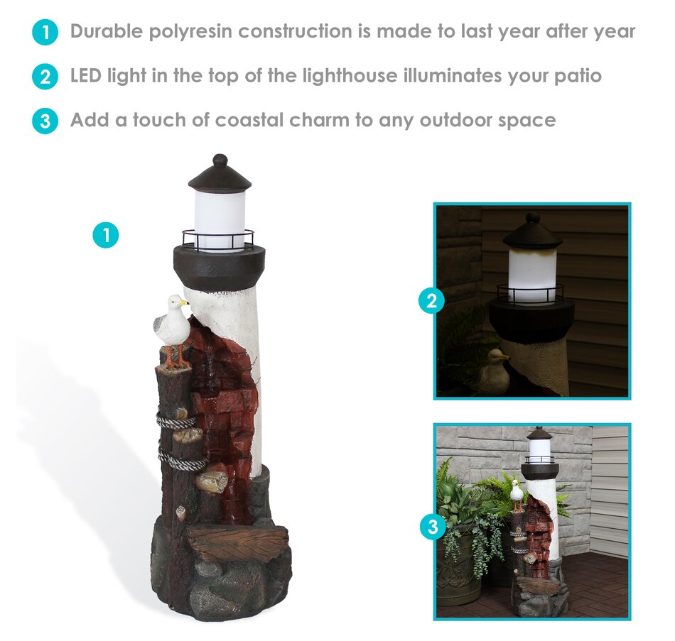 Lead guests to the home with this elegant, gull's cove lighthouse water fountain with LED lights. This beautiful water fountain features a bright LED light which is great for guiding people up the driveway or front porch steps in the dark. Made of durable yet lightweight polyresin, this colorful fountain features a unique lighthouse design complete with a friendly sea gull. Polyresin is easy to maneuver wherever desired with its lightweight material and is also easy to clean. Enjoy the relaxing sound of running water as it trickles through the fountain. It is circulated through the fountain thanks to a submersible electric pump. This makes the fountain easy to set up with no plumbing required. Simply set this fountain wherever desired, fill the bottom basin with water, plug in to the nearest electrical outlet, and transform any outdoor area with soothing sounds. Turn on the LED lights at night to enjoy in the evening as well.