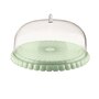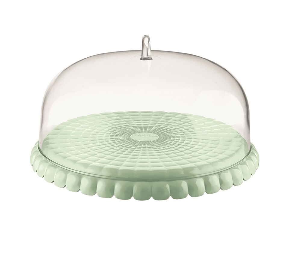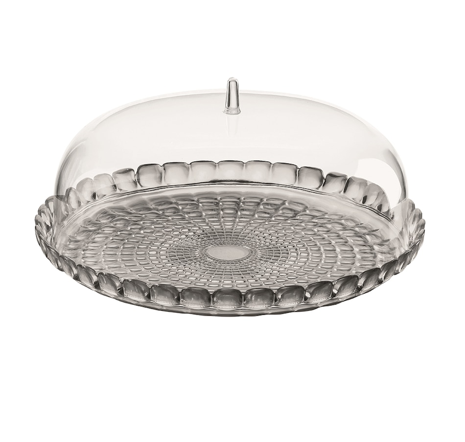 This is a cake serving set, featuring a smooth dome and a dish with the distinctive Tiffany relief checkered pattern. The reversible dish is designed for serving soft cakes on the side with raised edge and dry cakes or tarts on the flat side.