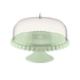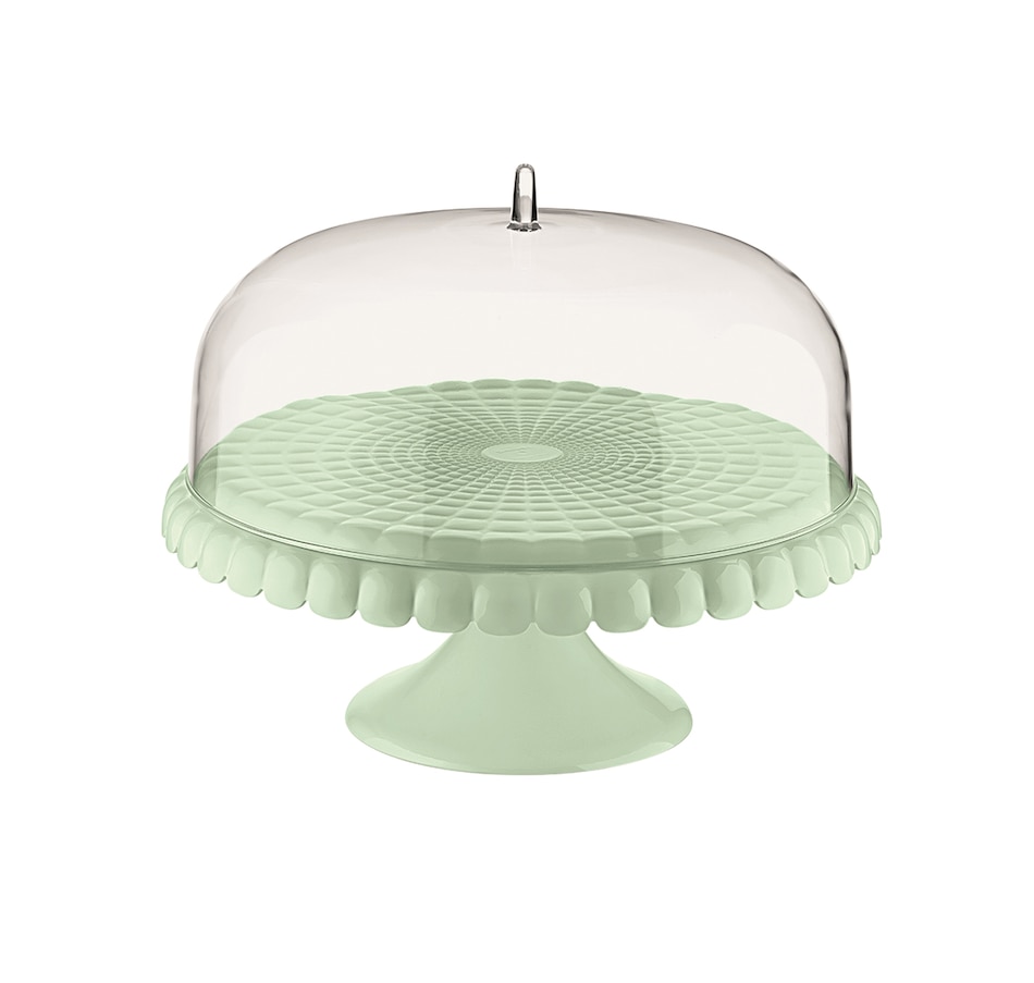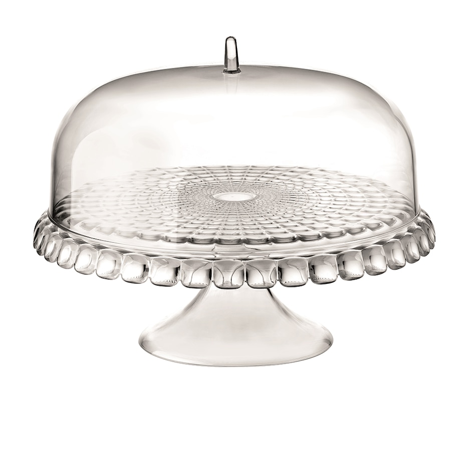 This is a cake stand with dome, featuring a smooth base and dome and a dish with the distinctive Tiffany relief checkered pattern.