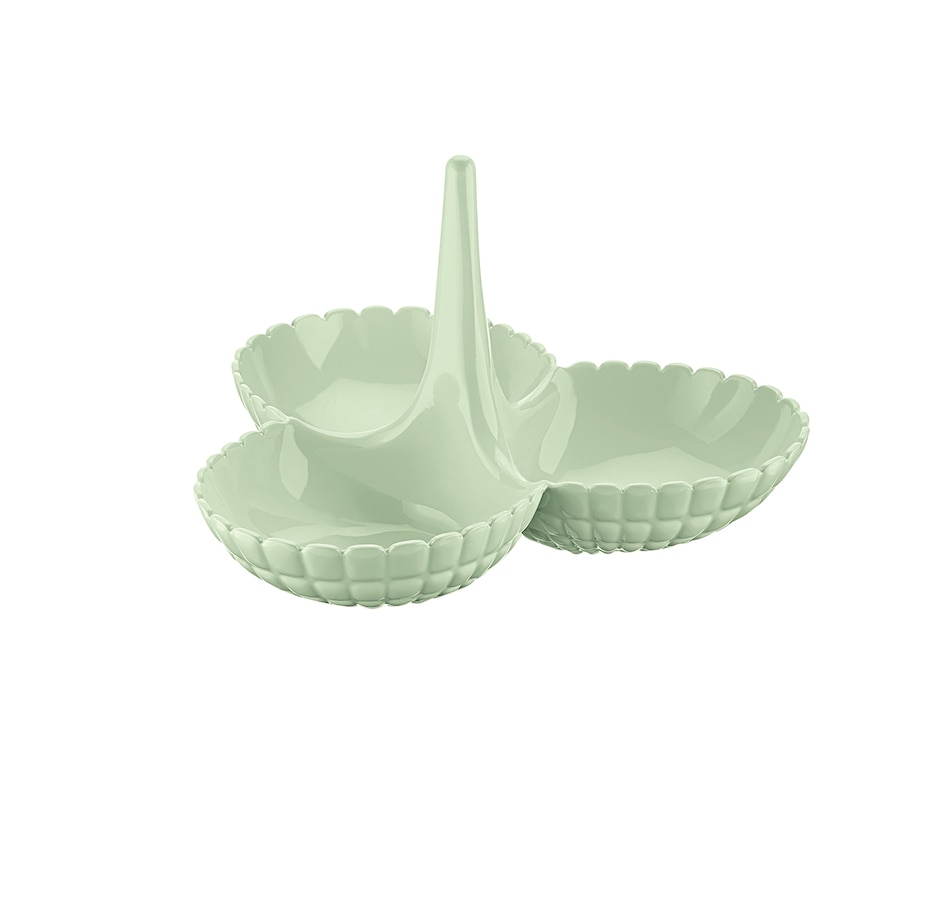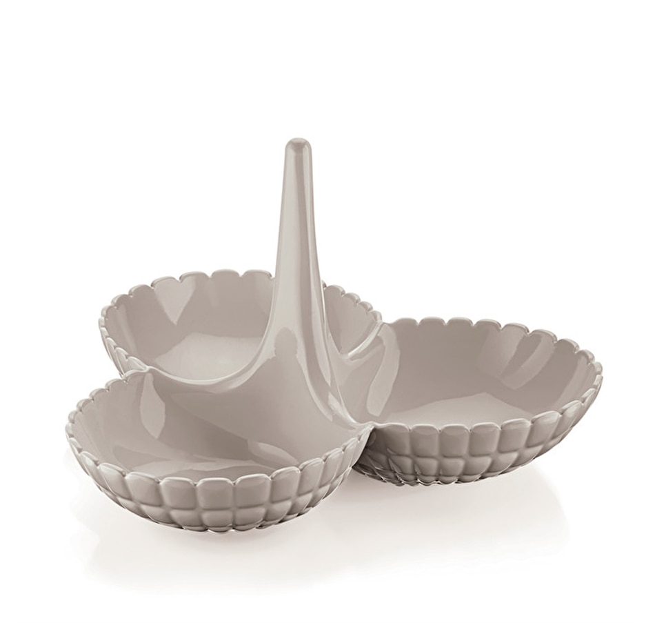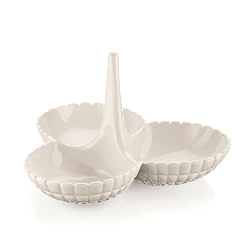 This is an original hors d'oeuvres dish, which can be sold either as a single piece or as two modular pieces. It comprises a vertical stand supporting three bowls designed to take crisps, pistachio nuts, peanuts and small snacks, while a special fitting system allows another hors d'oeuvres dish to be placed on top of the first, to create a six-bowl version.