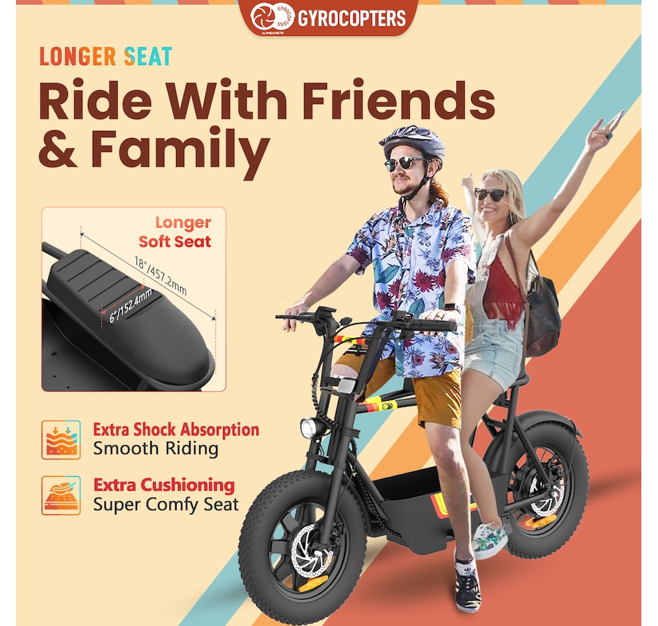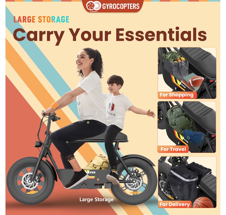Convenience meets fun with our innovative storage carriage feature. Upgrade your ride today and discover the convenience and fun of our e bike for adults with a built-in storage carriage. Redefining the classic mini bike experience, the Gyrocopters Vortex e bike delivers the thrill of retro charm with modern performance. UL-2272 safety-approved ebikes for adults/ youth.