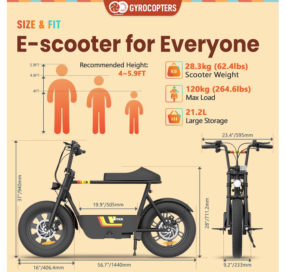 Stand out with the Gyrocopters Vortex e-scooters for adults featuring a 16 * 3-inch fat tire e bike design, ensuring both superior performance and a stylish retro appearance. Experience the versatility and if you love electric scooters this e bike will elevate your ride across various terrains including city roads, sandy beaches, rugged mountains, off-roading, and snow rides ensuring a thrilling ride wherever you go.