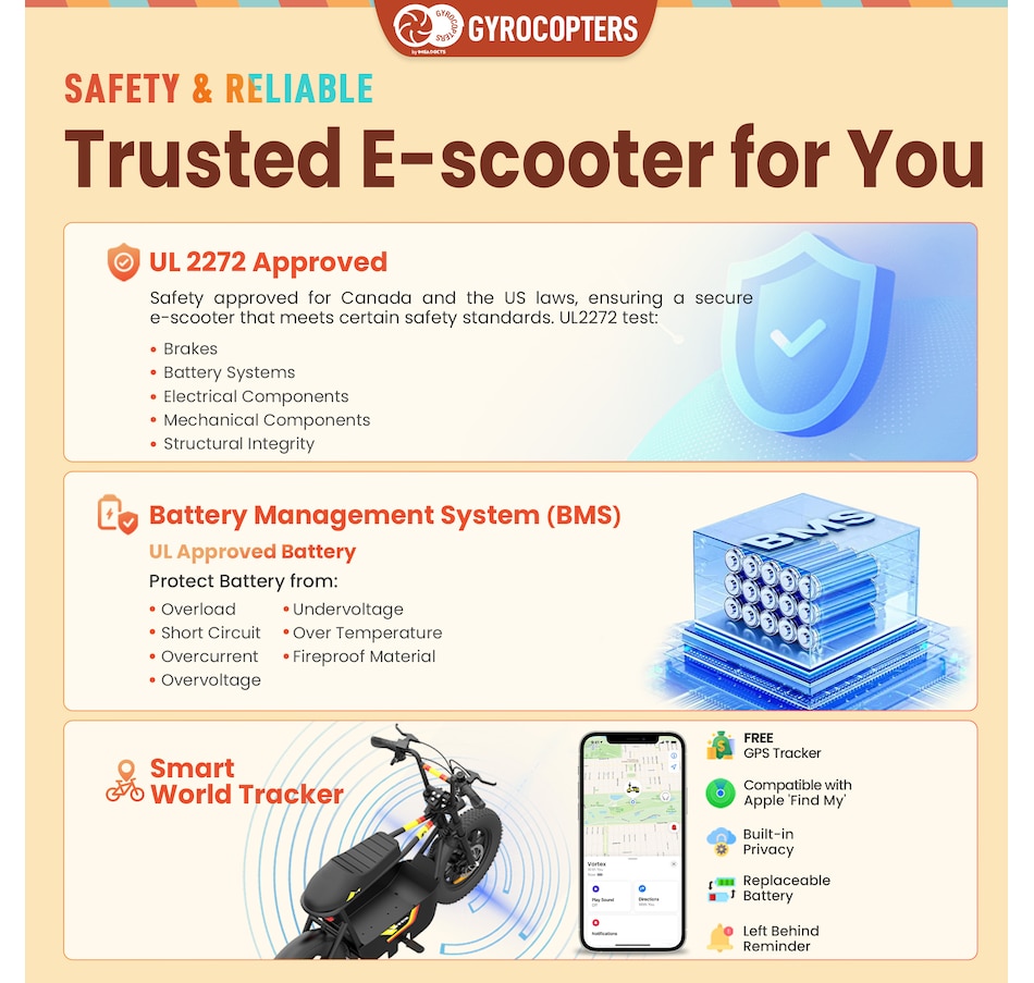 The Gyrocopters Vortex e-scooter is UL-2272 approved to ensure rider safety. Featuring a bright LED headlight for enhanced visibility and safety, this electric ride for adults ensures you can navigate with confidence. Crafted from iron metal and featuring a luxurious black leather seat, this electric beach bike promises durability and resilience for all your adventures. Additionally, the scooter comes equipped with a key and lock for added safety and security. The Gyrocopters Vortex electric scooter features a built-in GPS tracker, enhancing security and allowing users to monitor their ride's location easily. This innovative addition ensures peace of mind while enjoying the ride's retro charm and modern performance capabilities.