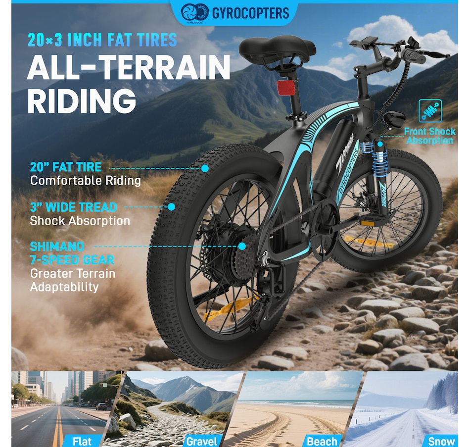 All-Terrain Fat Tires: The 20×3 inch fat tires offer excellent grip and shock absorption, providing a smooth and stable ride across dirt paths, gravel roads, or city streets.