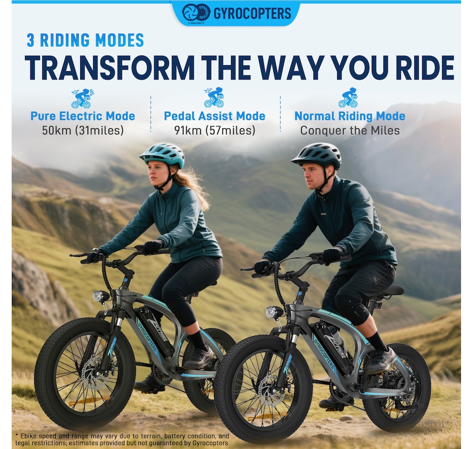 The Gyrocopters Zapphire Mountain E-Bike is your ultimate ride for daily commutes, weekend trails, and off-road adventures. Built for performance and versatility, this high-powered electric bike combines a robust motor, long-lasting battery, and rugged all-terrain design. Whether you're navigating city streets or tackling mountain paths, the Zapphire delivers safety, reliability, and style in one sleek package.
