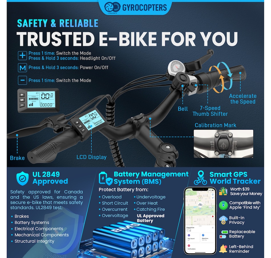 Whether you're heading to work, exploring off-road trails, or cruising through the city, the Gyrocopters Zapphire Mountain E-Bike offers a safe, powerful, and exhilarating ride. It's the perfect companion for riders who demand performance, comfort, and adventure—all in one electric package.