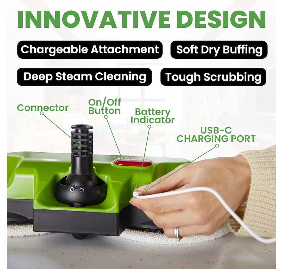 Designed for sealed hardwood floors, tiles and other hard surfaces, this robust attachment combines polishing, scrubbing and steaming into one powerful tool. With dual steam outlets and a wide 14.5-inch cleaning path, dirt and stains are lifted while floors are reinvigorated with a streak-free shine. Powered by a rechargeable battery with USB-C charging, this cordless head gives you up to 25 minutes of continuous cleaning, making it convenient for quick touch-ups or full-room refreshes. The included soft, washable microfibre pads trap dirt and buff surfaces smoothly, and they're reusable for easy maintenance. Whether polishing everyday spills or giving your floors a seasonal deep clean, this attachment boosts your steam mop's capability with chemical-free performance and hassle-free operation.