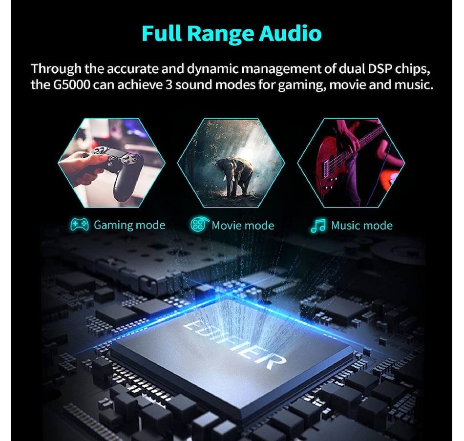 【three sound effects】through the accurate and dynamic digital management of dual dsp chips, the g5000 can achieve 3 different sound modes (gaming, movie and music ). These have been carefully adjusted by the edifier's professional acoustic team to ensure each mode is finely tuned for its specific use.