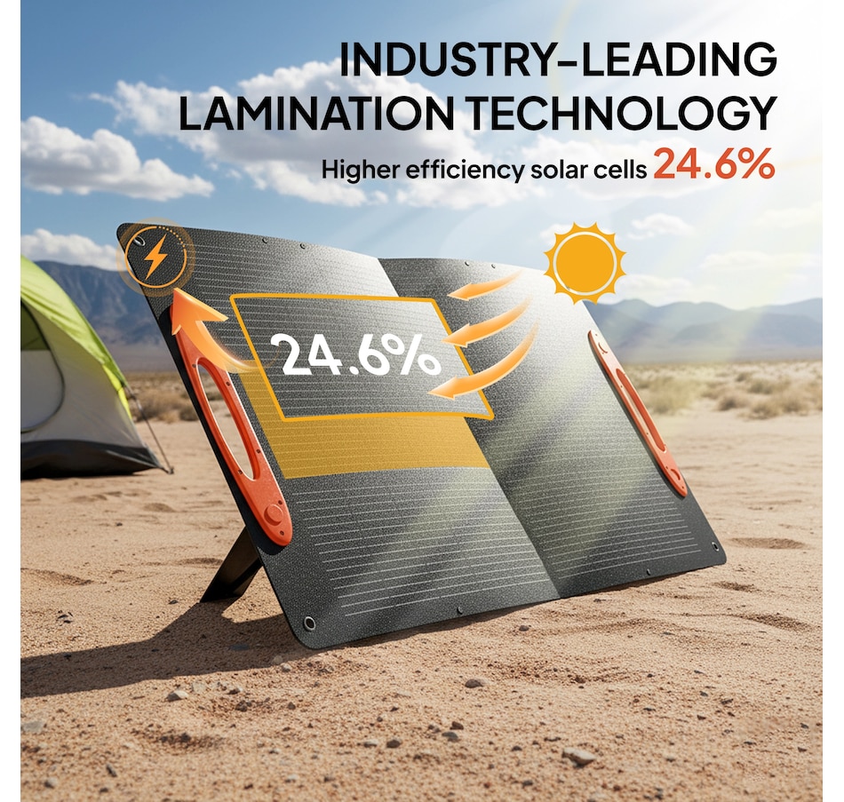 ● Boasts 24.6% efficiency with large panel, quickly refilling your power supply;