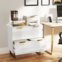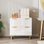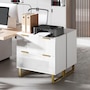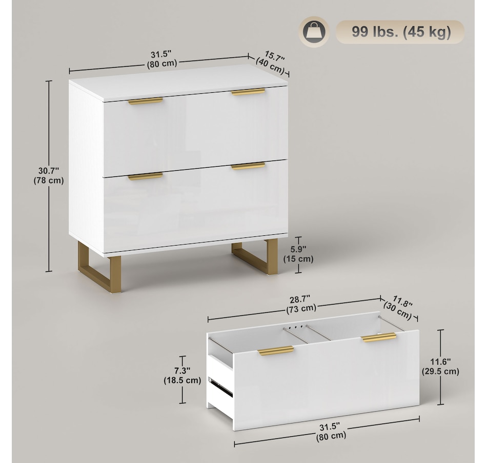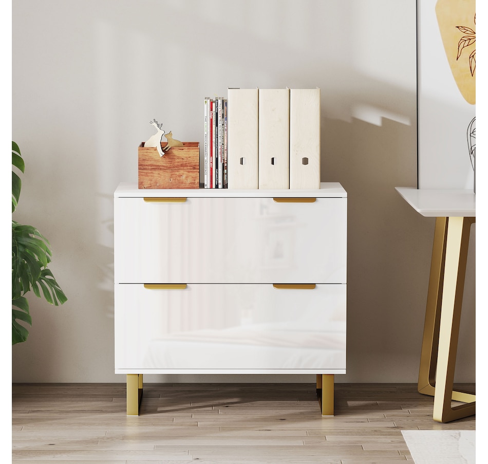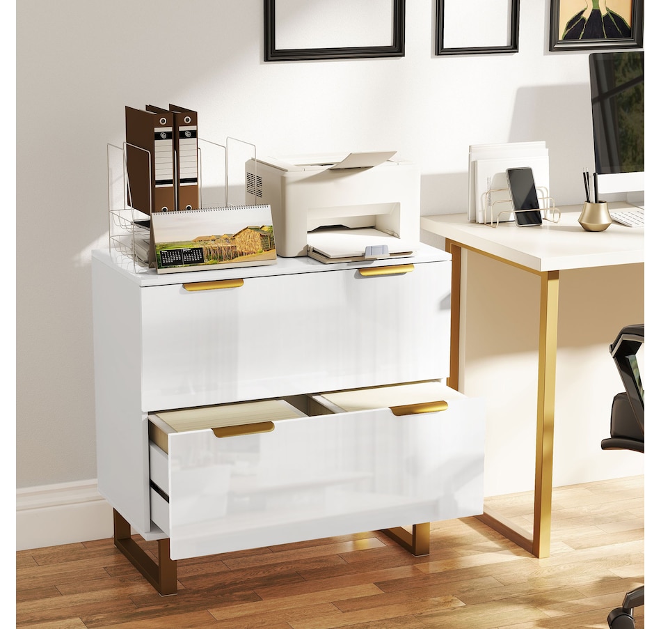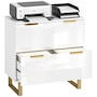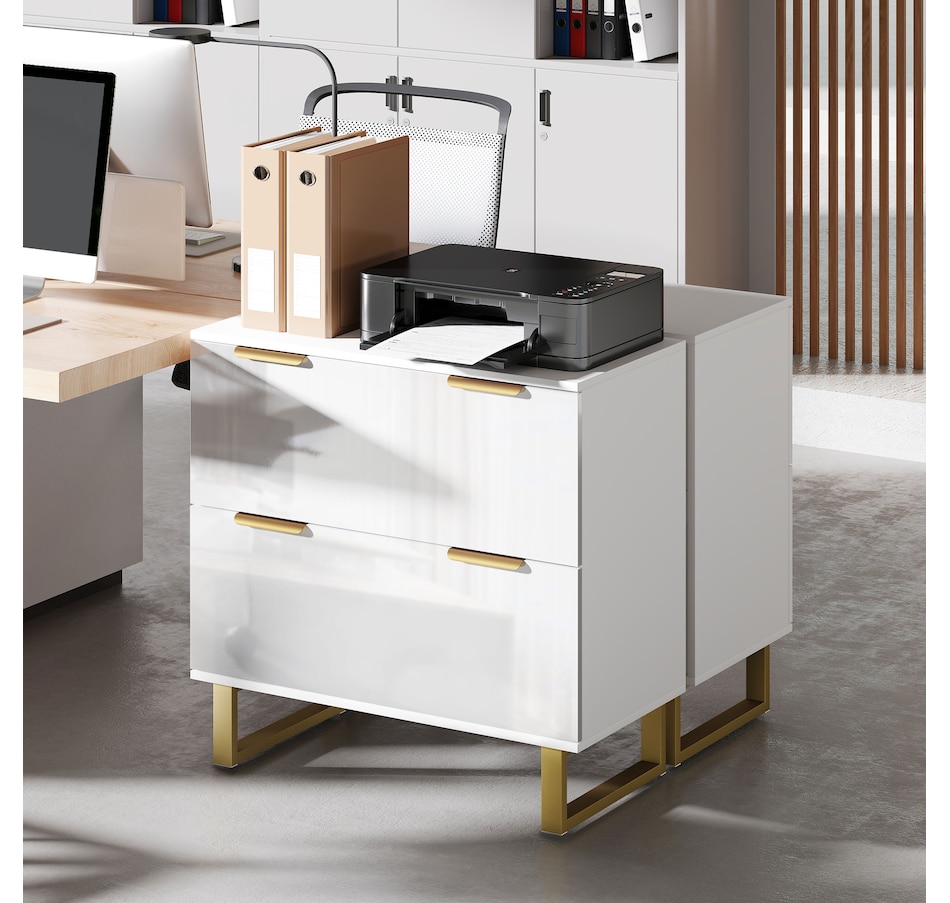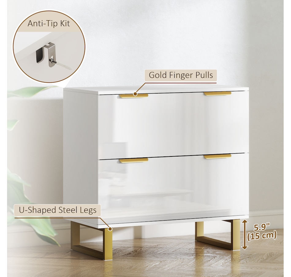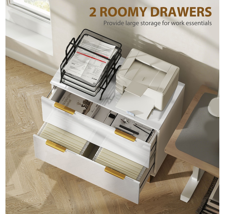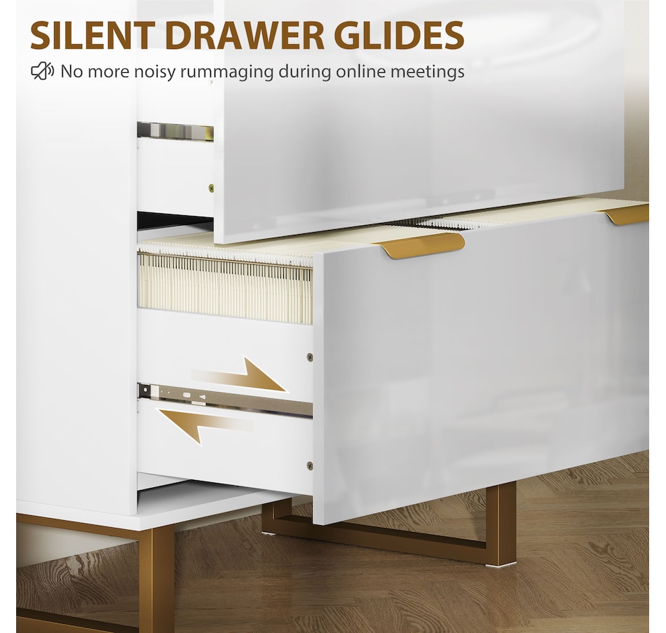 Upgrade your office with HOMCOM's stylish file cabinet, blending modern luxury with functionality. This chic piece flaunts a high-gloss finish, gold detailing, and elegant legs, great for any home office, studio, or living space. It offers two large drawers with adjustable rails for various file sizes and a solid top for your printer or scanner. Enjoy smooth, silent drawer operation with quiet-glide technology.