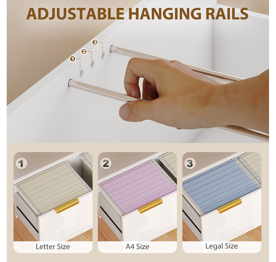 ● Accommodates letter, A4, and legal-size files in two drawers with adjustable rails;