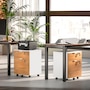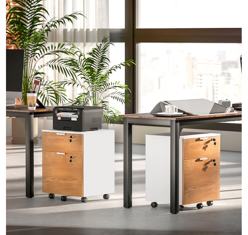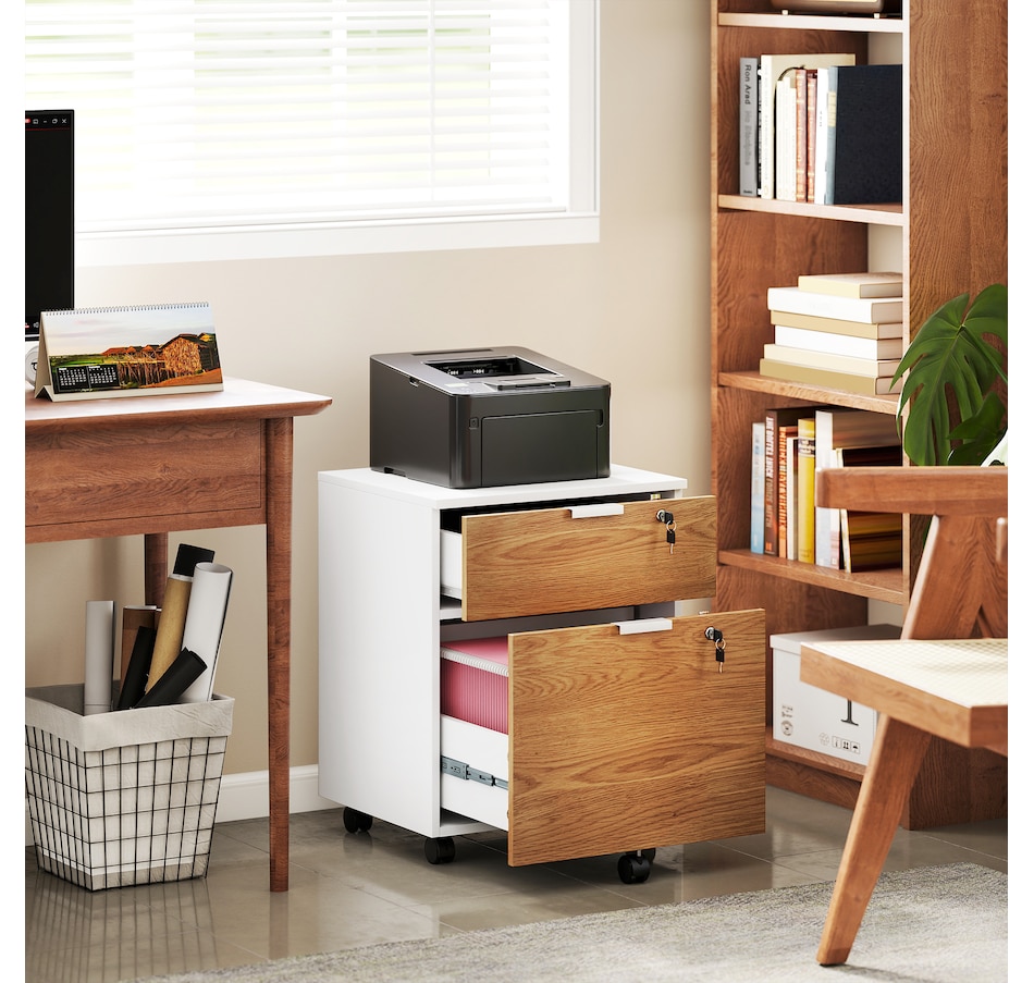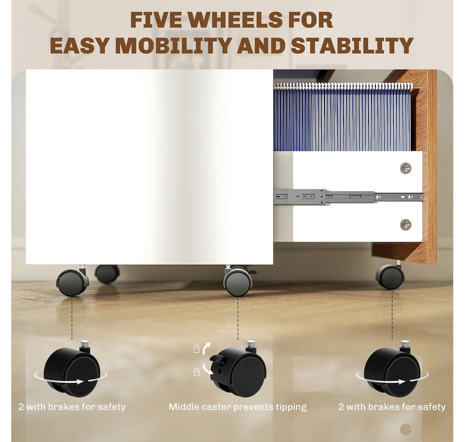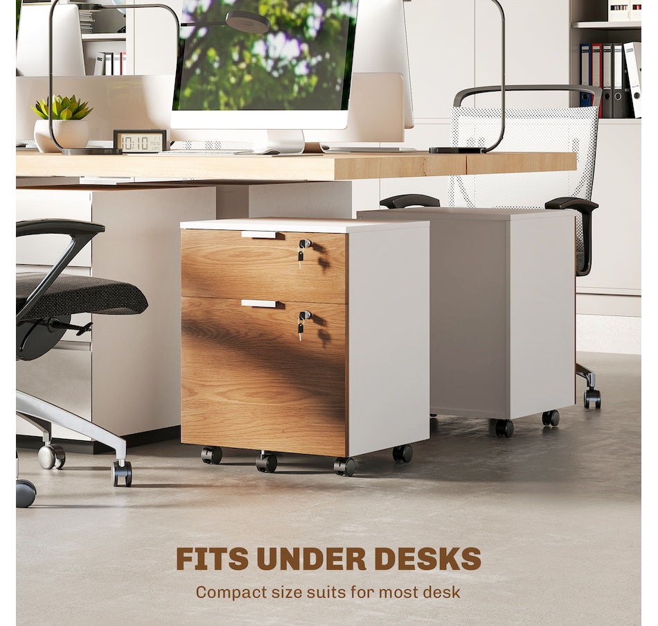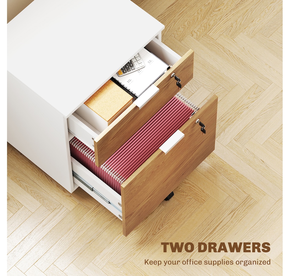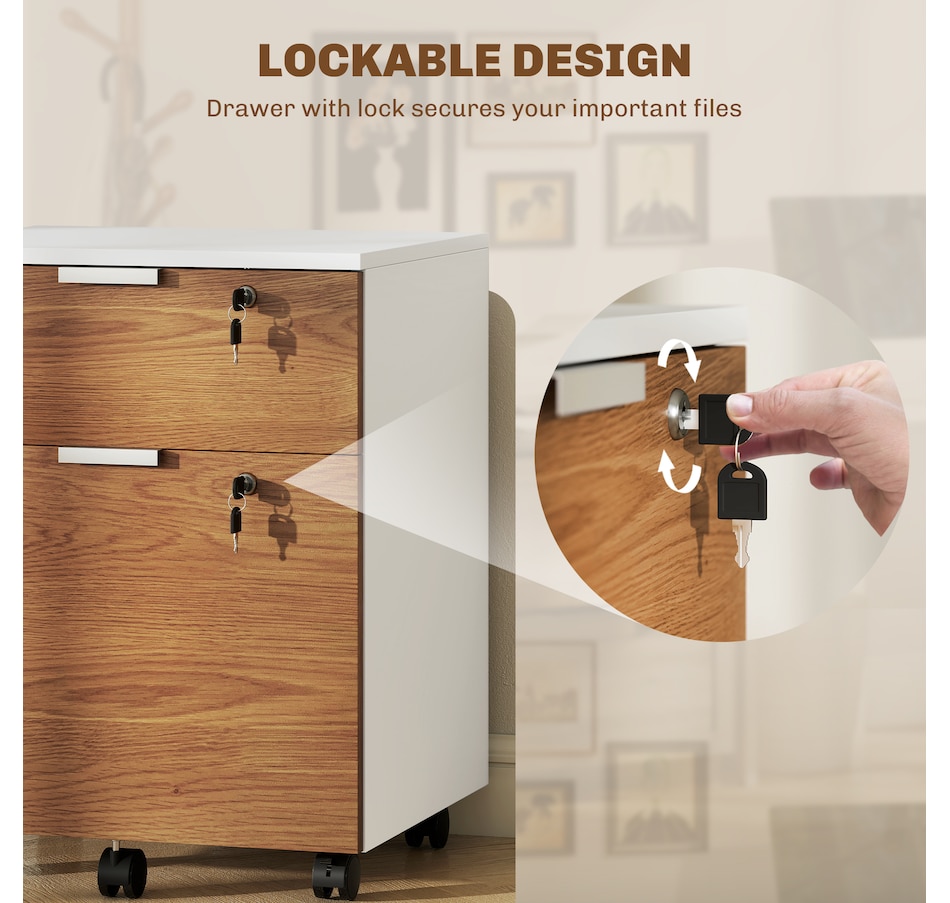 Transform your home office with the sleek HOMCOM locking file cabinet, doubling as a chic printer stand. This office storage cabinet features a compact design, including a small drawer and a big drawer with adjustable bars for all your A4, legal and letter-sized files. Secure sensitive documents in the lockable two drawers. What's more, it's a breeze to move around with five wheels and adds a touch of sophistication with under desk file cabinet's white and natural grain finish.