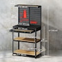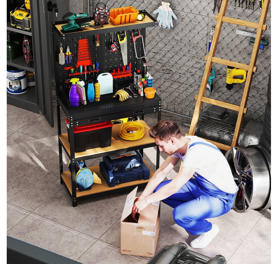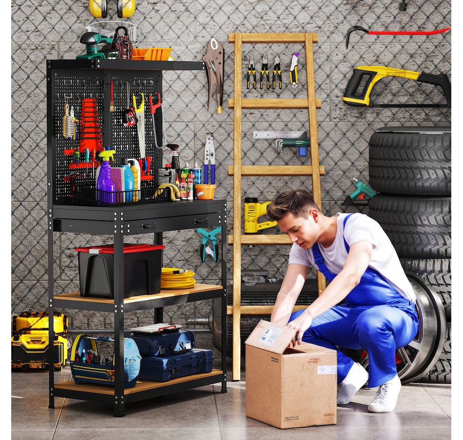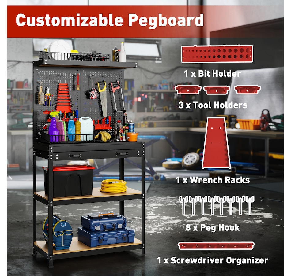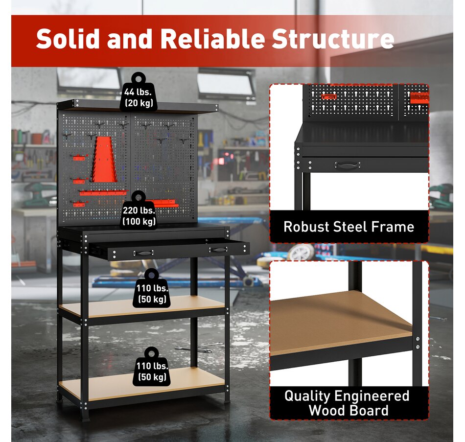 ● Weight Capacity: 529lbs (240kg) (Total), 220 lbs. (100 kg)(Tabletop), 110 lbs. (50 kg)(Each Shelf), 44 lbs. (20 kg)(Top Shelf), 44 lbs. (20 kg)(Pegboard);