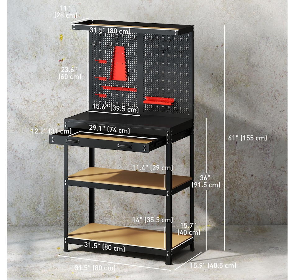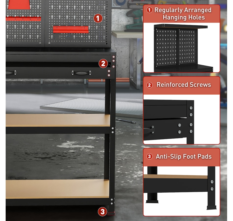 Tired of a chaotic workspace where tools are lost and projects feel unstable? A cluttered garage and a wobbly surface can turn any task into a frustrating ordeal. This HOMCOM work bench transforms your area into a haven of efficiency. Its solid frame provides a secure foundation, while the pegboard and multi-level storage on this work bench table keep every tool neatly organized and accessible, bringing order and confidence to your craft.Features: