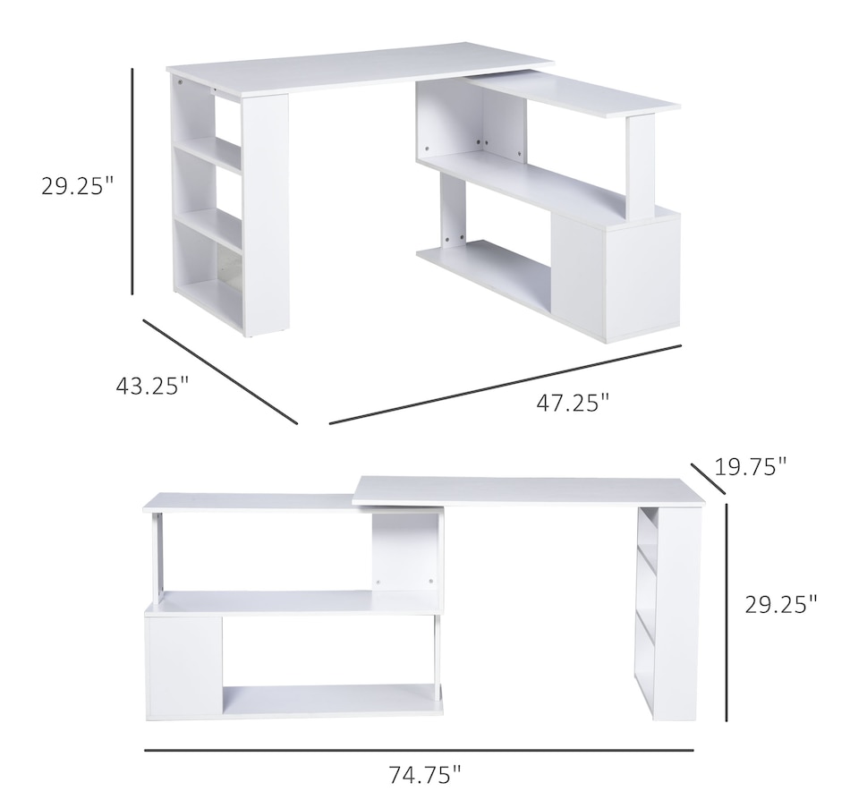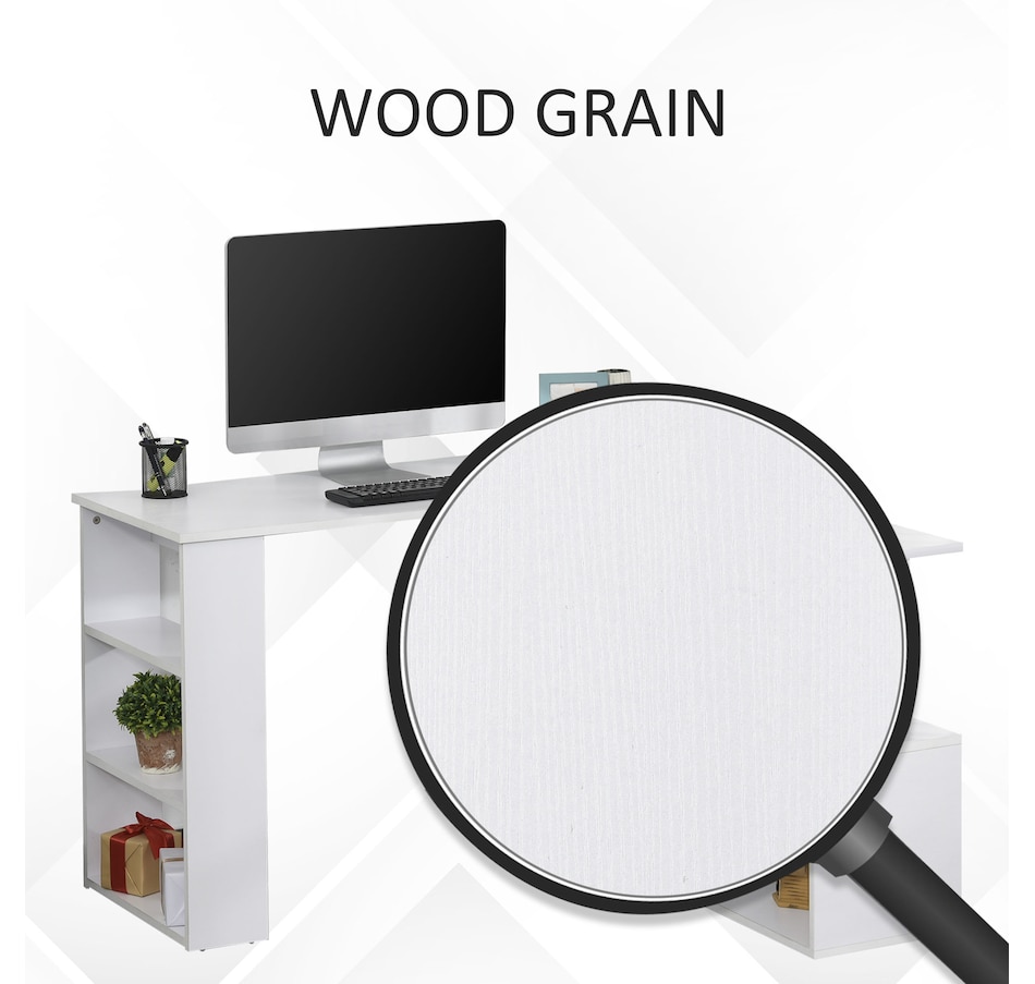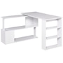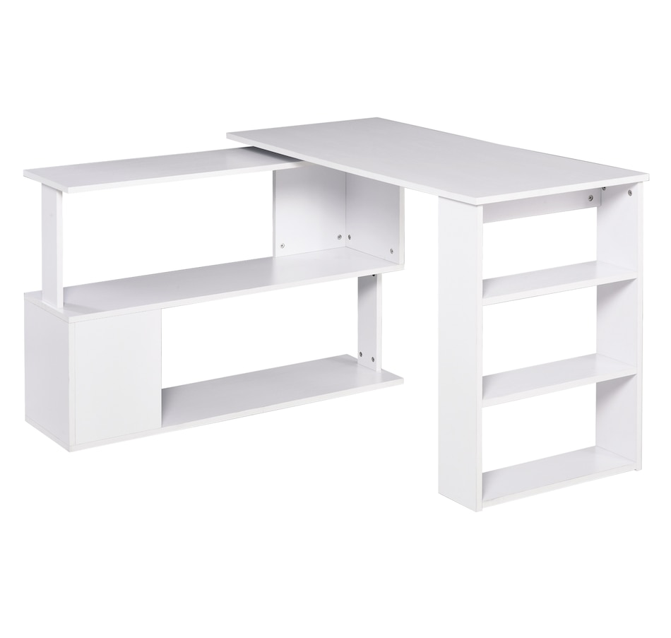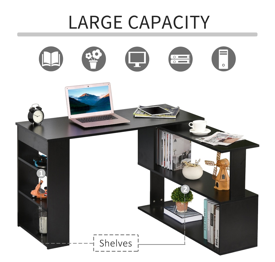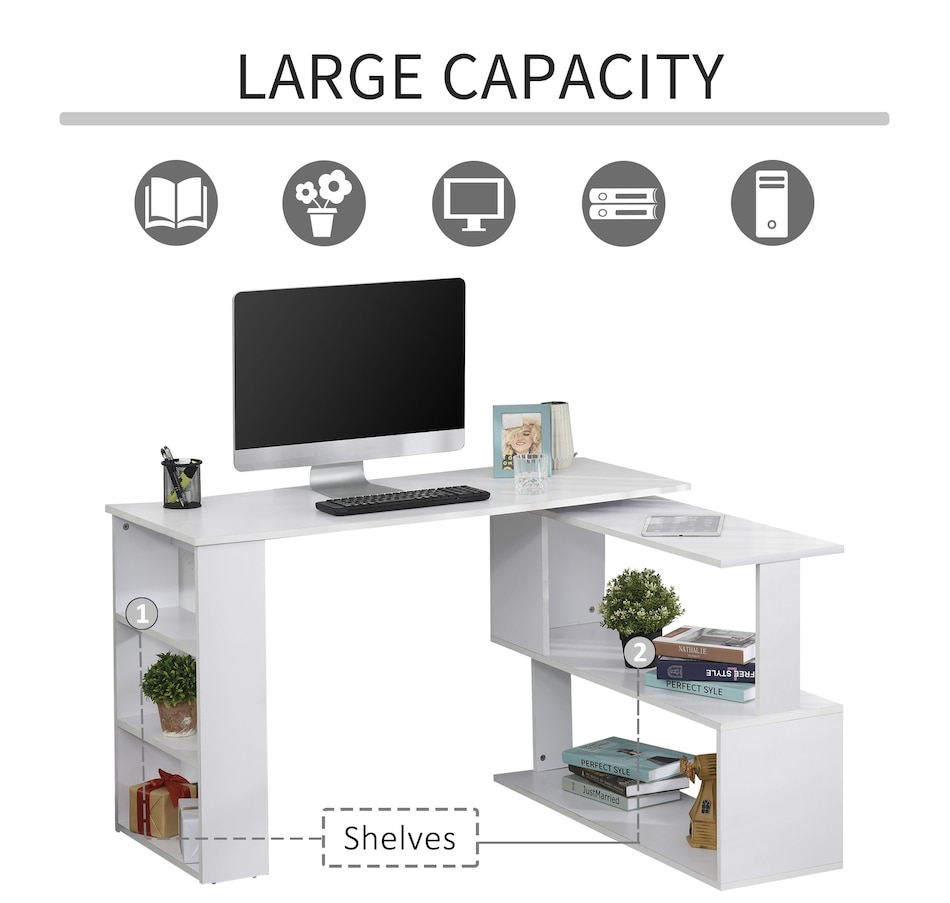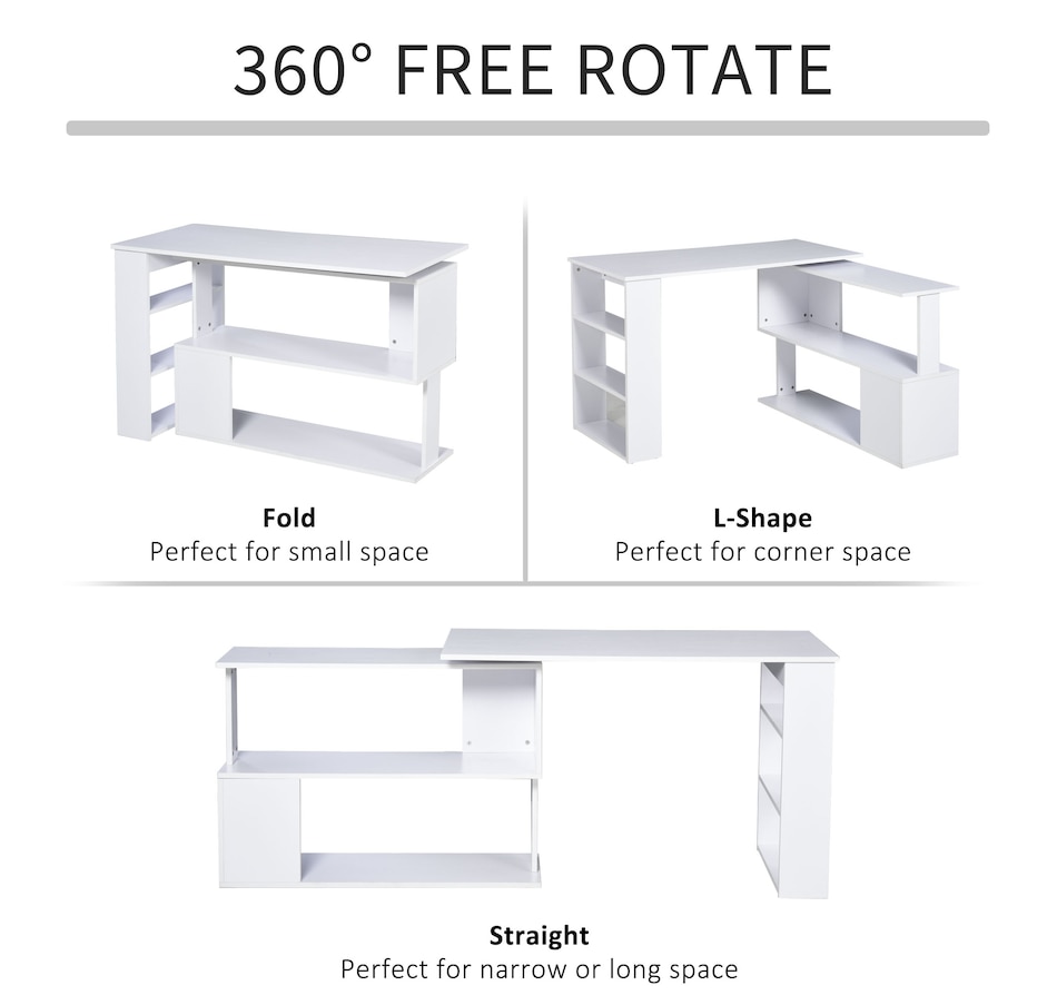 The HOMCOM L-shaped corner desk with storage features an original 360 degree rotating design that can be adjusted to your needs and contains plenty of storage space. The modern look adds a touch of class to your office or home and is crafted from high grade materials. Multi-tier shelves provide ample storage space. Create a stylish computer desk, storage unit, and display case with this unique piece from HOMCOM.