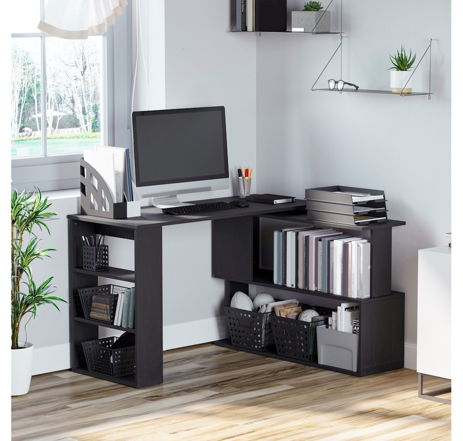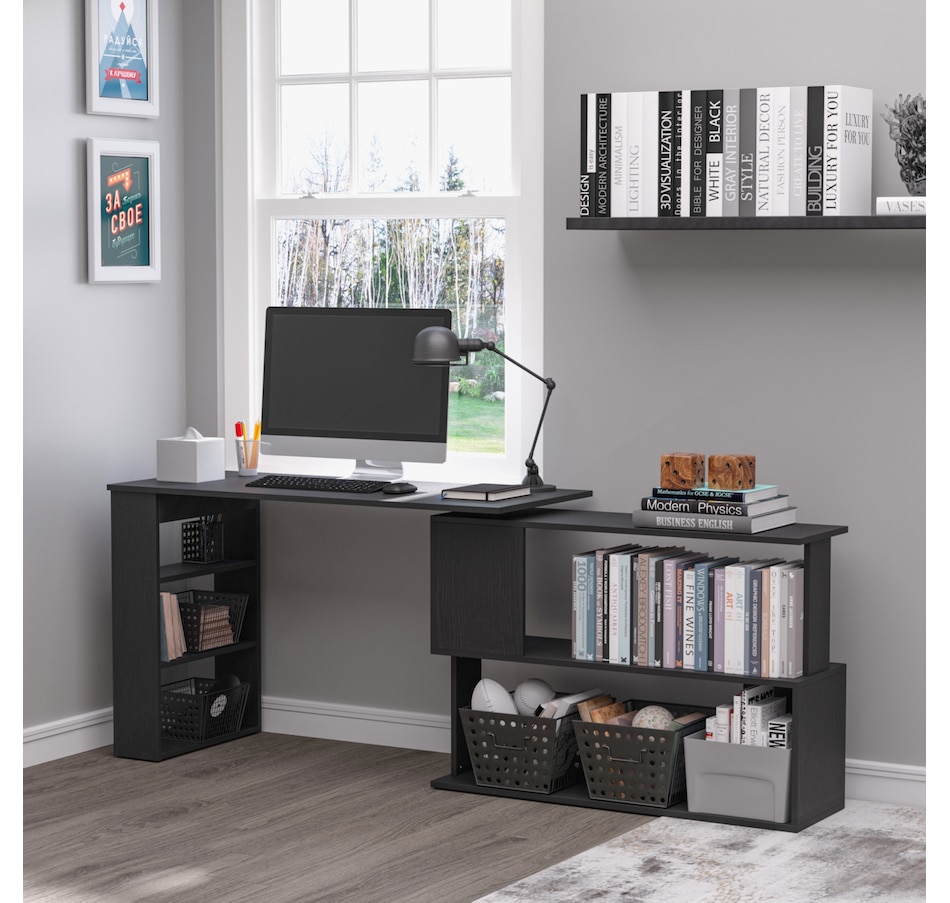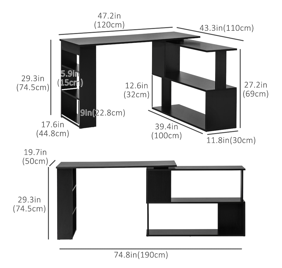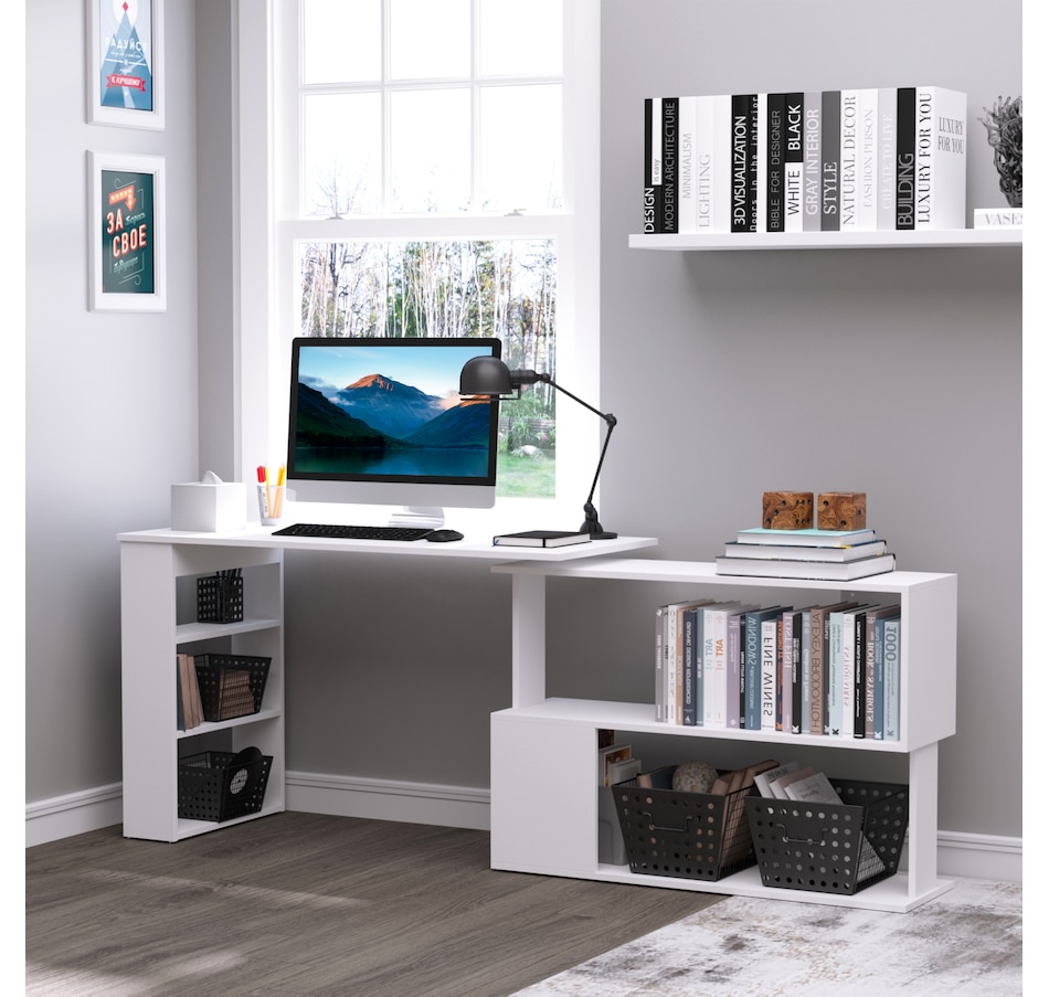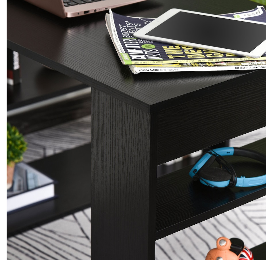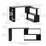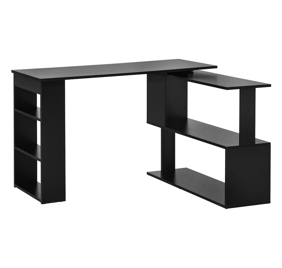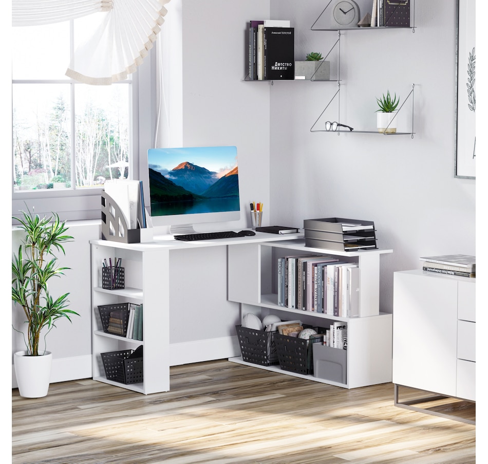 The HOMCOM L-shaped corner desk with storage features an original 360 degree rotating design that can be adjusted to your needs and contains plenty of storage space. The modern look adds a touch of class to your office or home and is crafted from high grade materials. Multi-tier shelves provide ample storage space. Create a stylish computer desk, storage unit, and display case with this unique piece from HOMCOM.