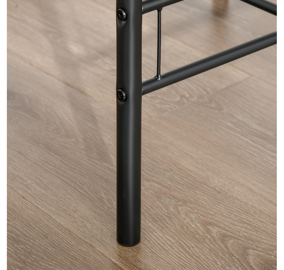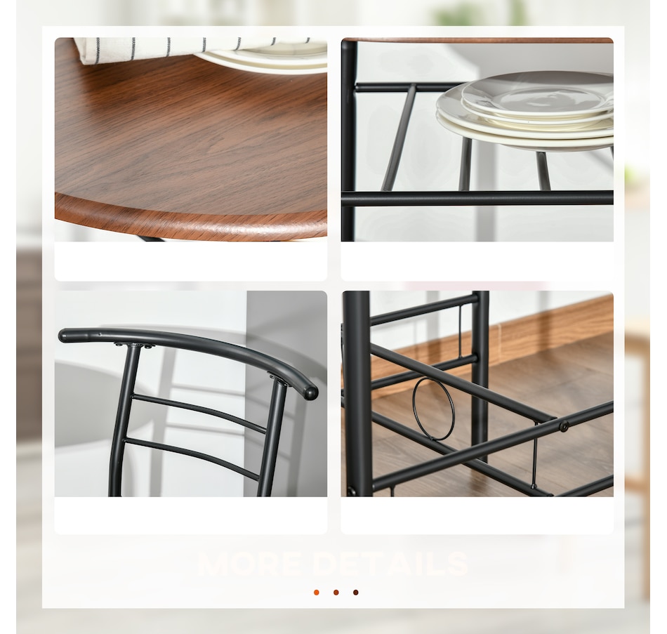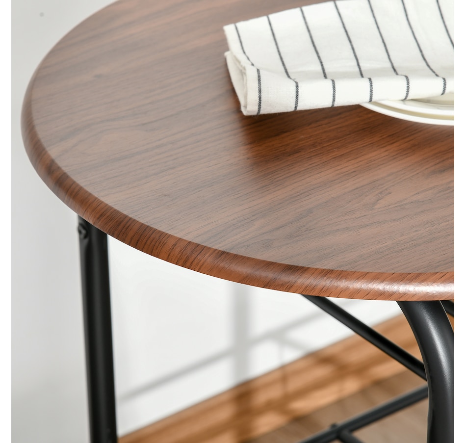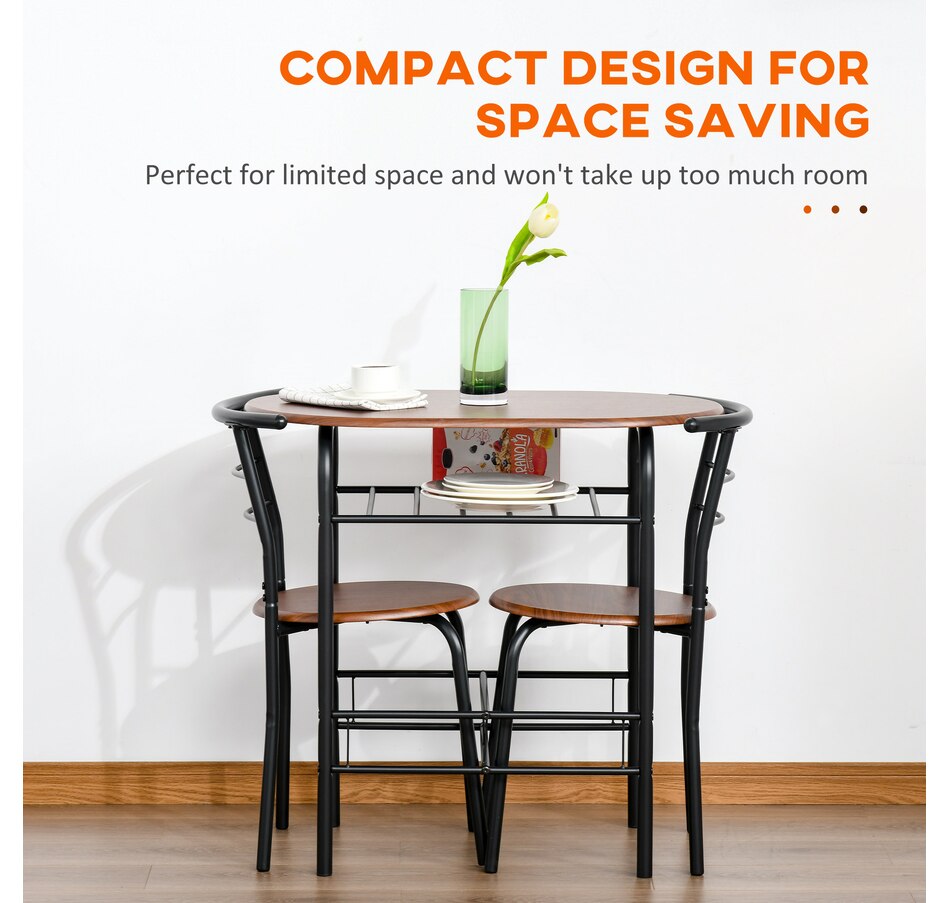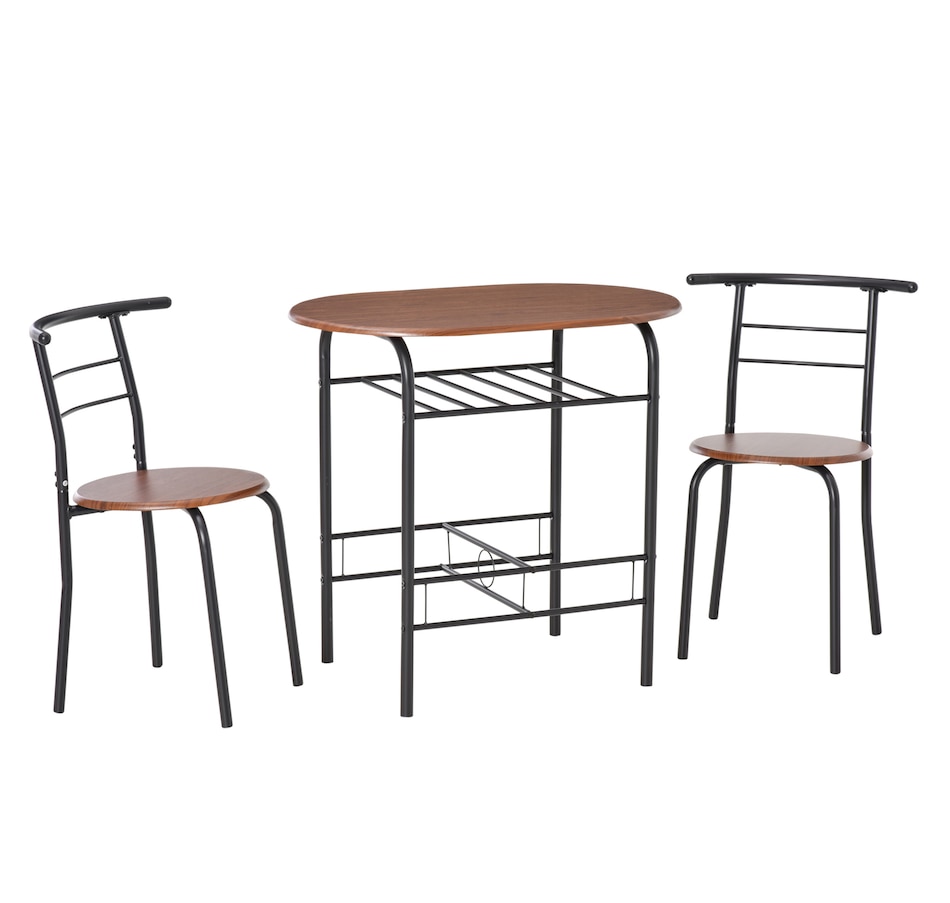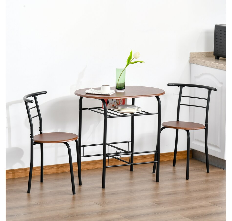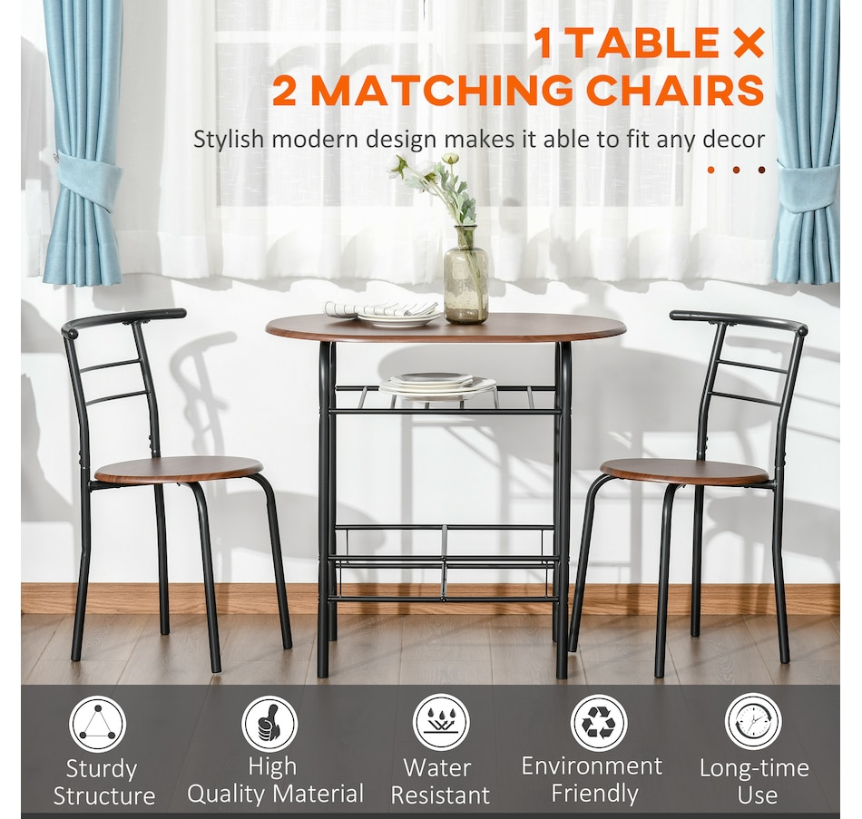 Transform your dining experience with the HOMCOM 3-Piece Kitchen Table Set, a sleek ensemble that includes a table and two chairs. Its wood-effect top and industrial vibe complement any modern home. Tuck the chairs under to save space and keep essentials handy with the integrated shelf—great for meals, work, or a cosy chat in any snug space.