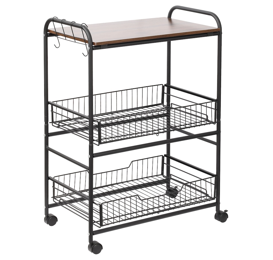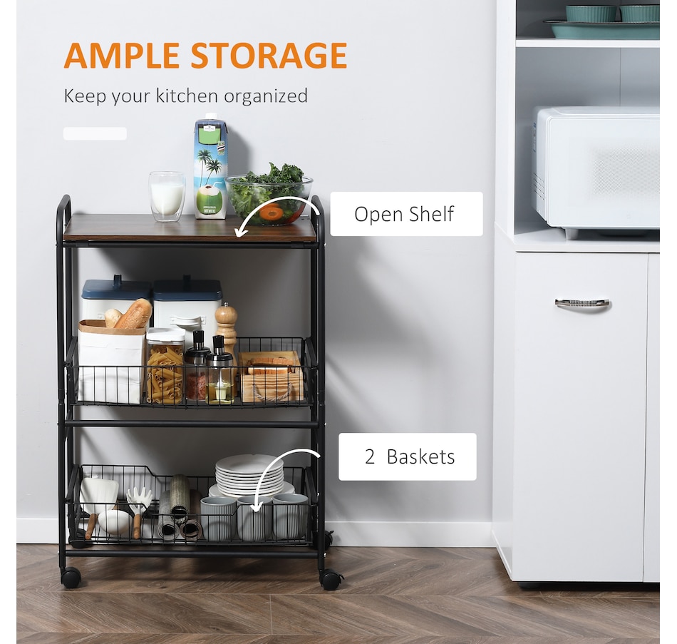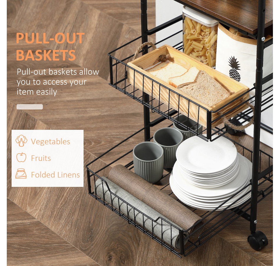 Do you want to make the most of your kitchen? Need a kitchen island with storage that won't take up too much space in your apartment or dorm room? This rolling cart has a compact and simple design that can be incorporated into various decorating styles. This portable kitchen island features an open shelf as well as two pull-out baskets. It will make the most of your money. HOMCOM can help you upgrade your kitchen right away.Features: