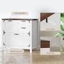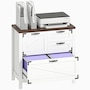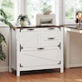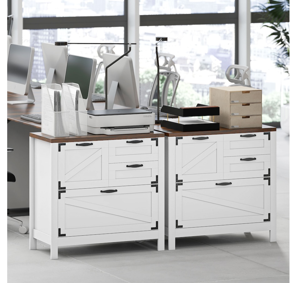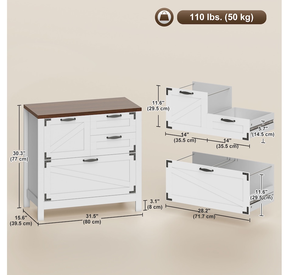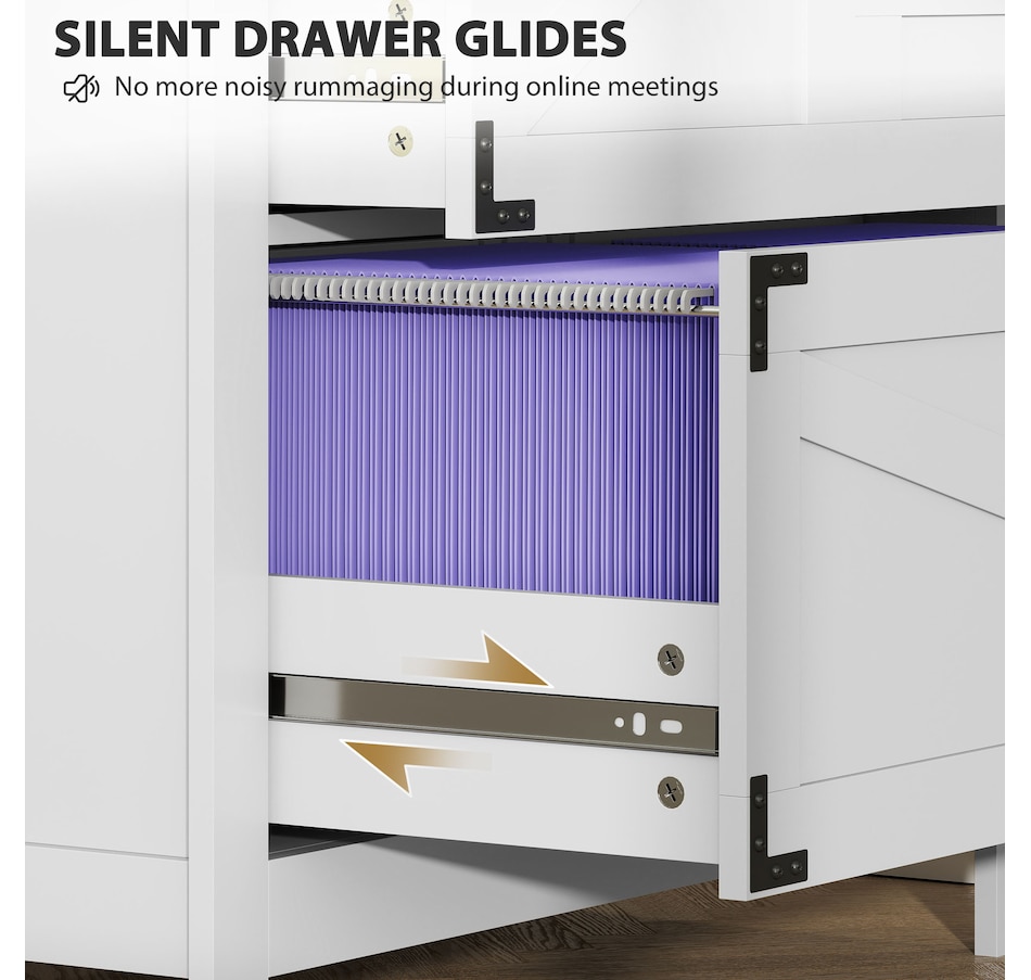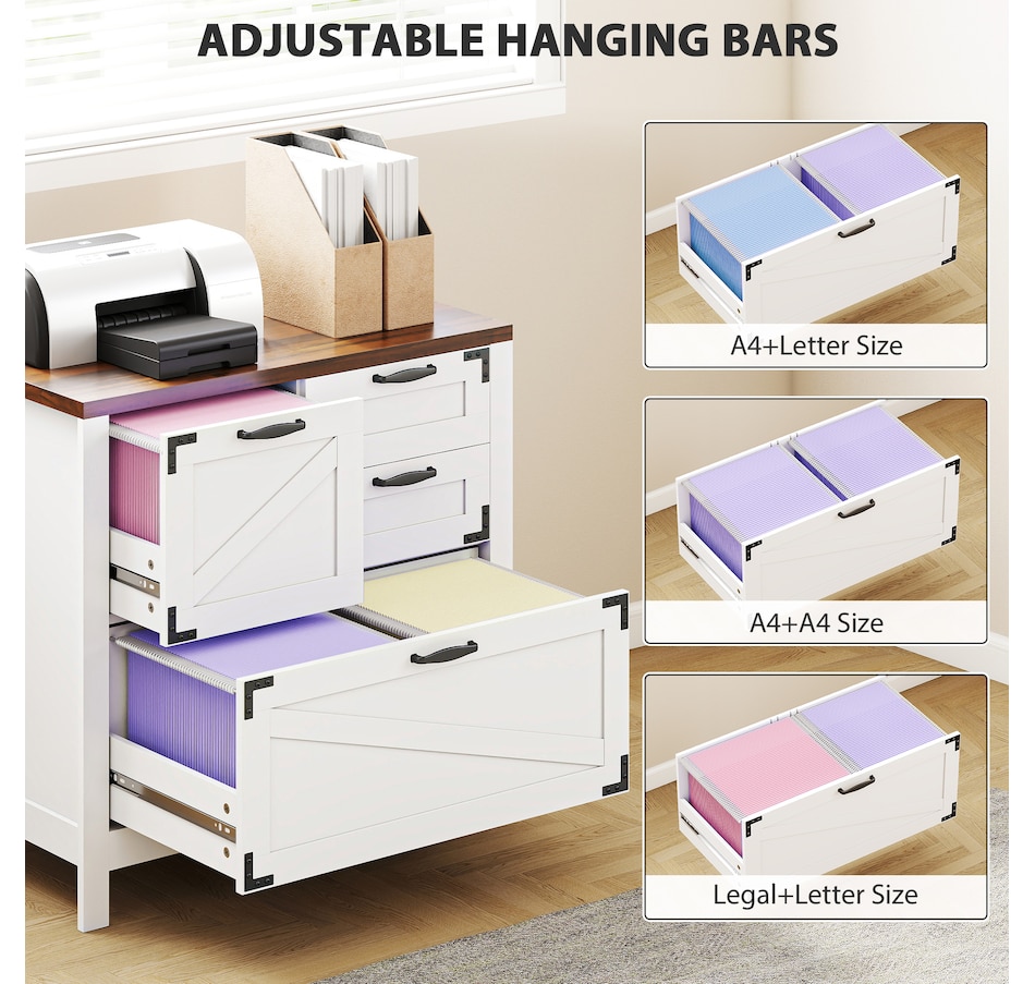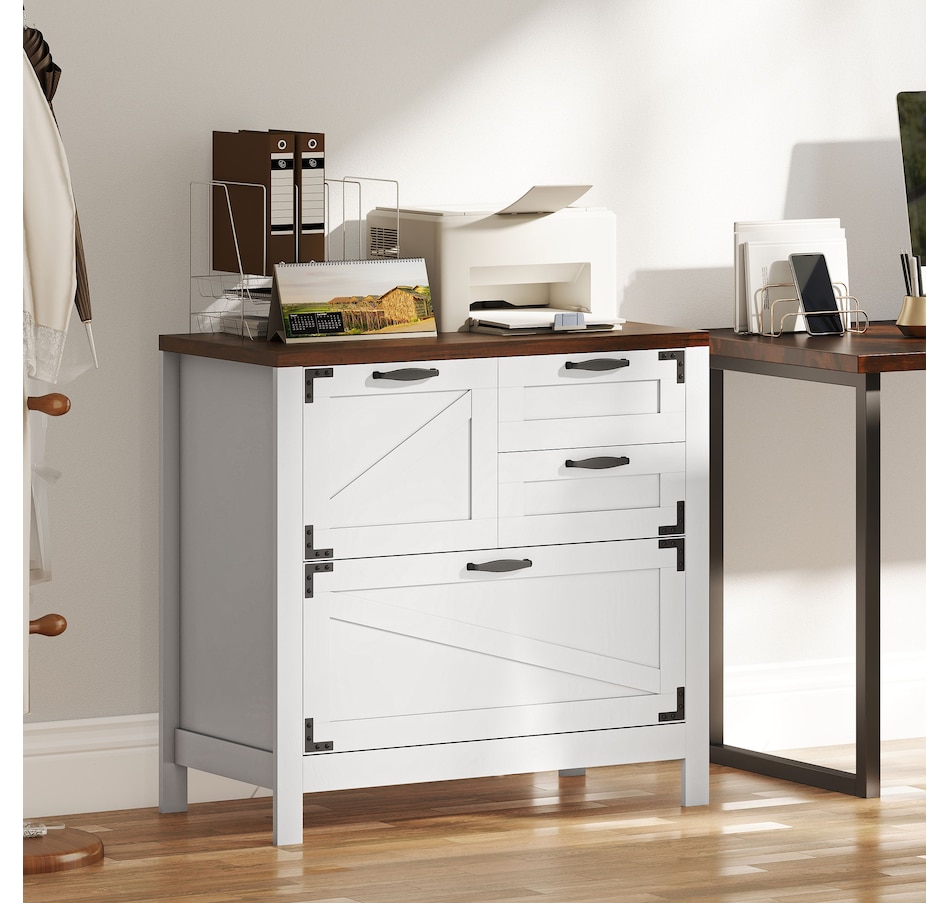Bring order and style to your workspace with this farmhouse-style file cabinet from HOMCOM. Featuring a mix of drawer sizes, it keeps documents and office supplies neatly organized, while silent drawer slides ensure smooth, quiet use. The thick tabletop offers a strong surface for a printer, scanner, or your favorite decor. With barn-style detailing, matte black handles, and metal accents, the lateral filing cabinet adds rustic charm and standout style to any home office setting.Features: