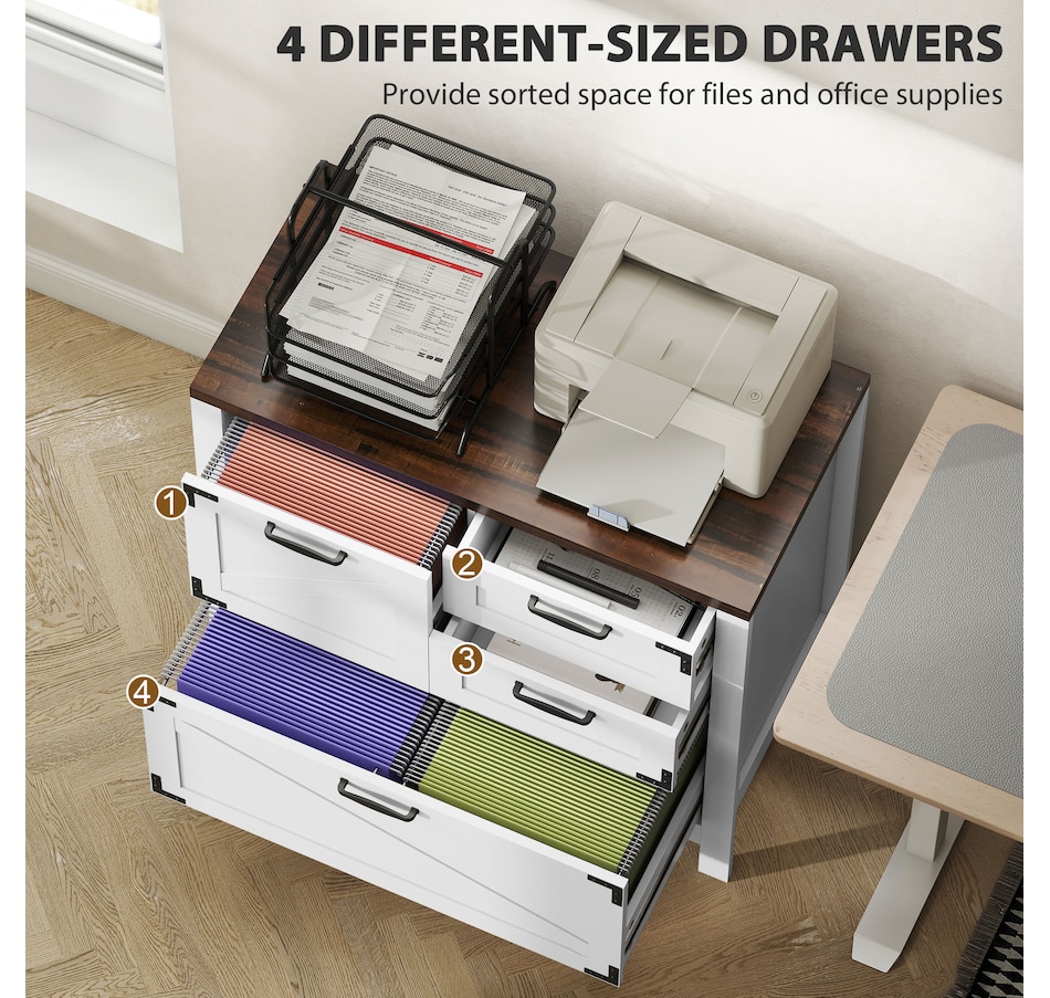 ● Four drawers with varied sizes keep files and office supplies neatly organized;