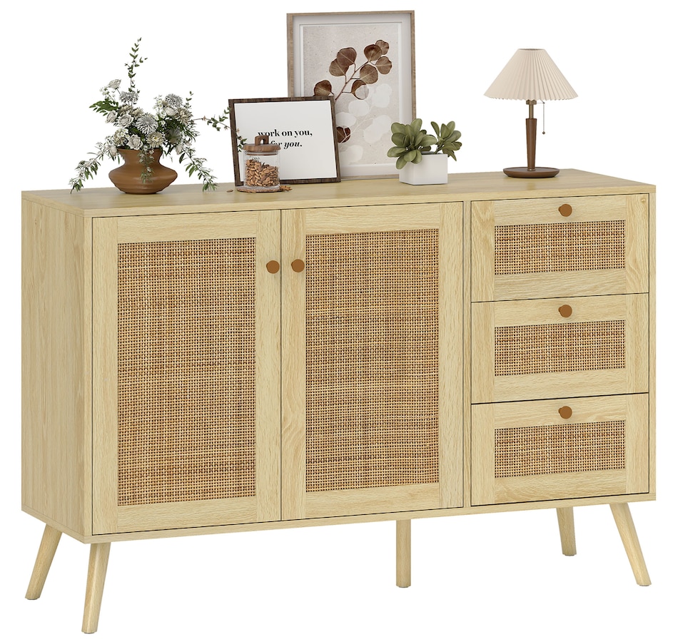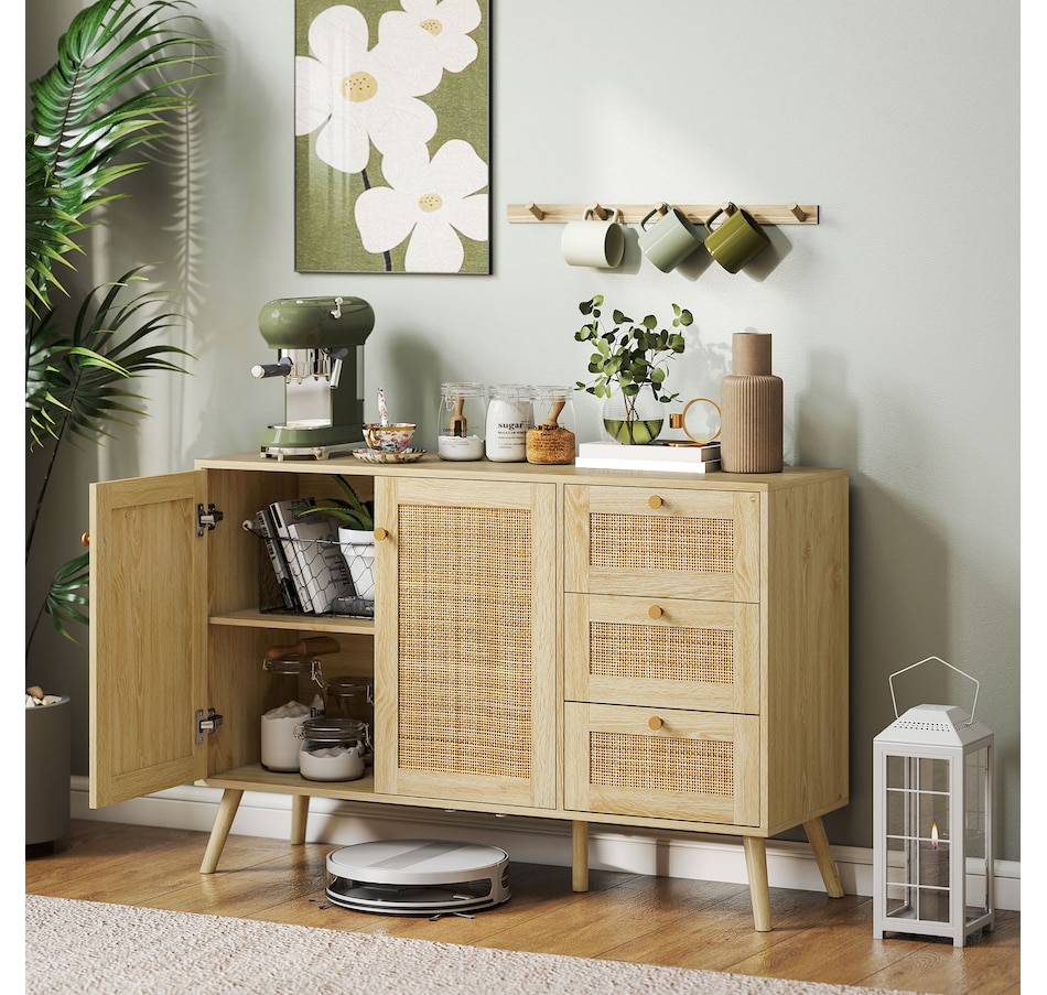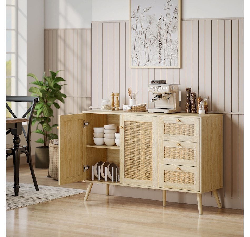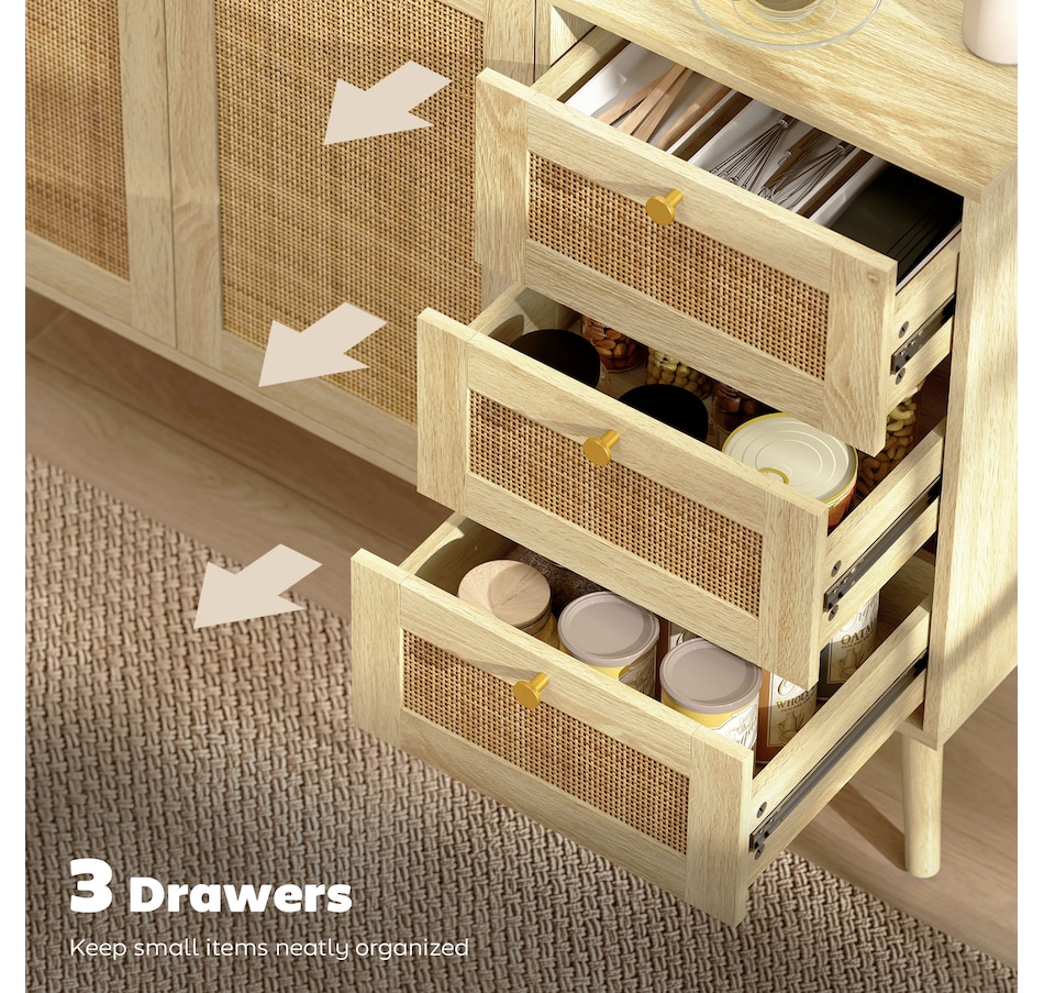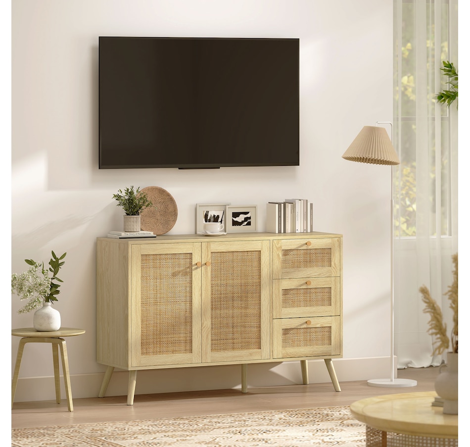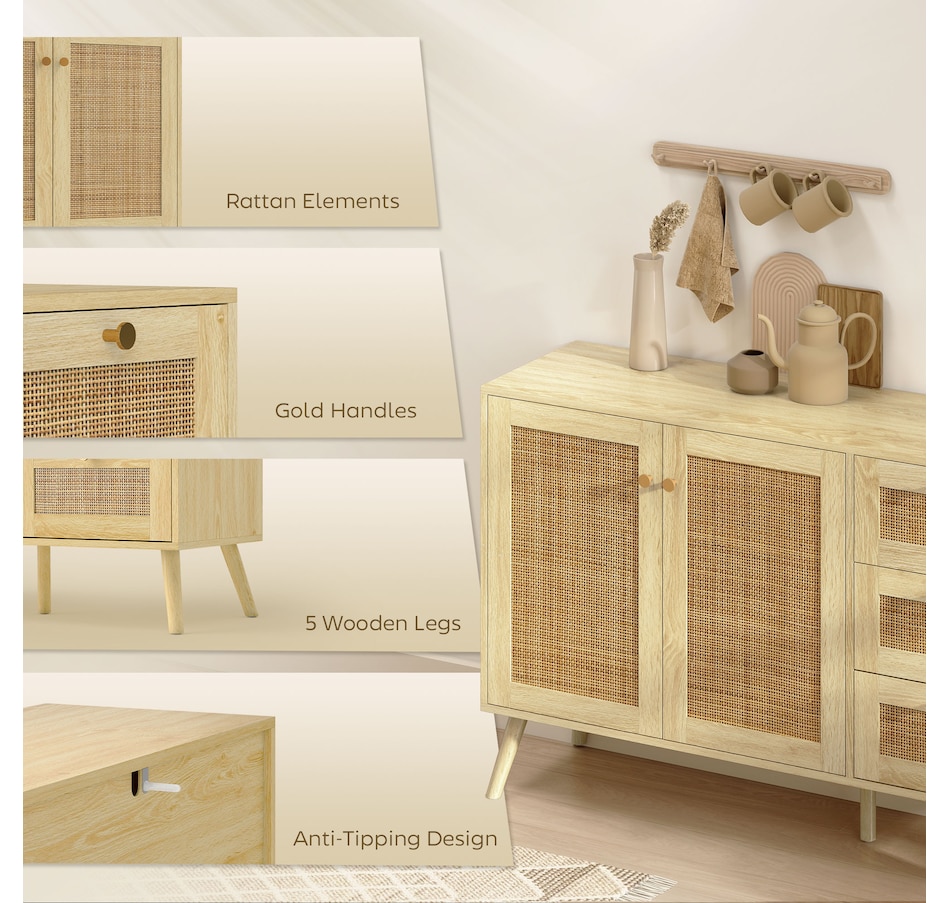 Bring warmth and function to your home with this boho-inspired sideboard from HOMCOM. The natural wood finish with decorative rattan details and gold handles add charm to your living room or entryway, while the spacious top, drawers, and adjustable-shelf cabinet keep everything beautifully organized. Whether displaying decor or storing daily essentials, it's a great blend of style and purpose.Features: