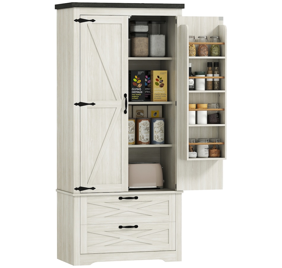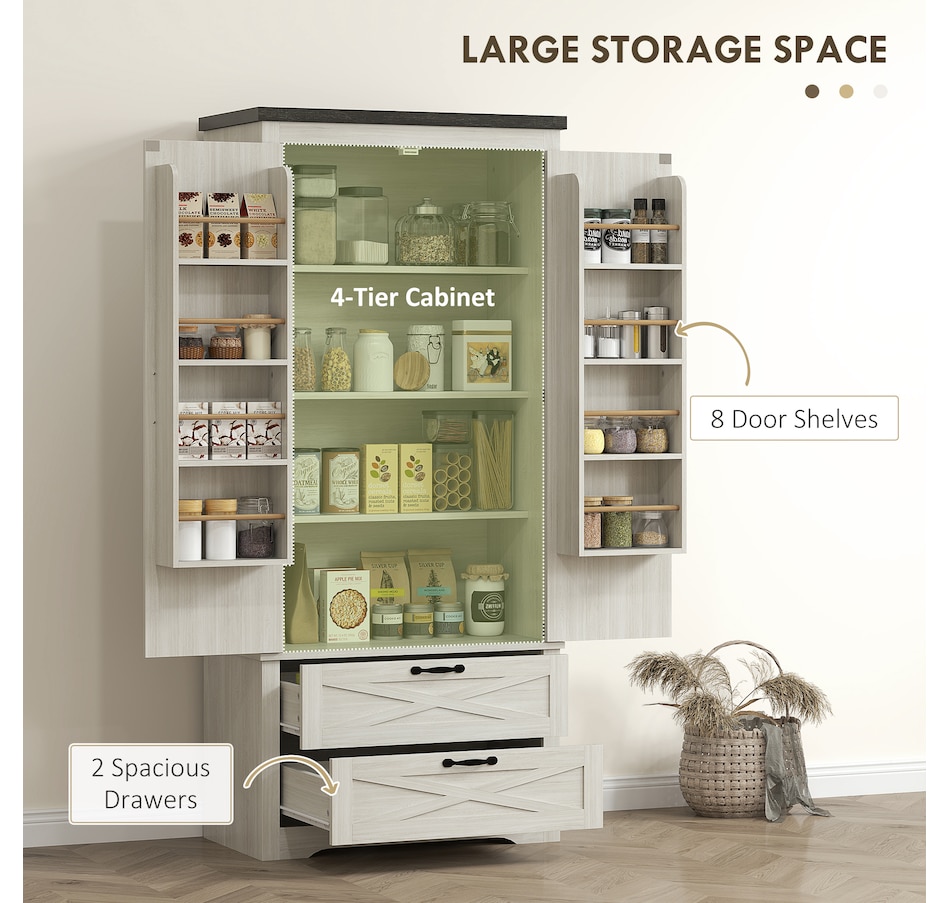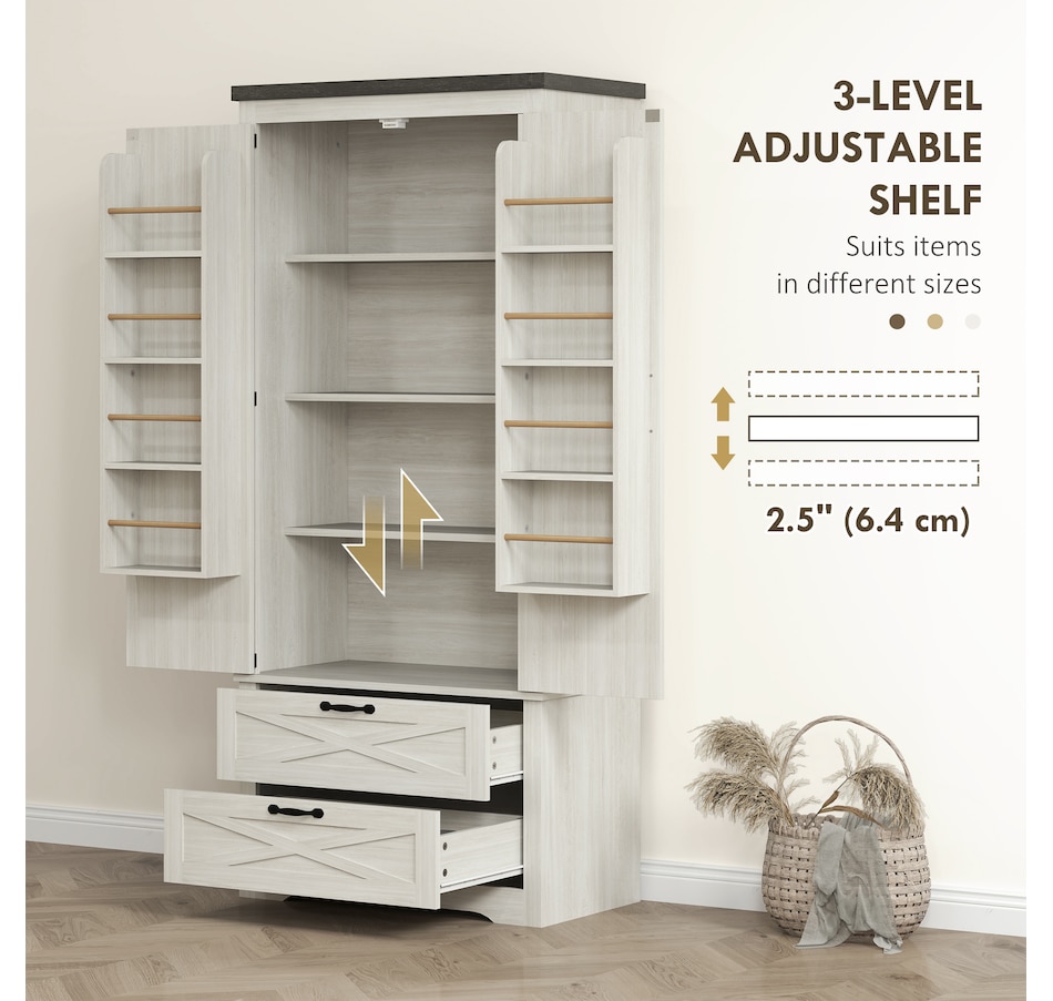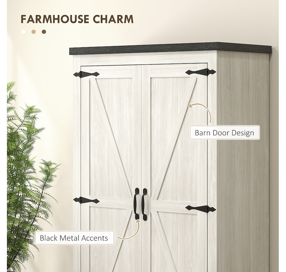 Add a touch of farmhouse flair to your kitchen with the HOMCOM kitchen pantry storage cabinet. Featuring a distressed white finish and charming barn doors, this kitchen pantry blends style with functionality. Organize effortlessly with a four-tier cabinet featuring adjustable shelves for flexible storage and two spacious drawers for tableware, along with eight door shelves for small items. Suitable for any kitchen needing extra storage with a hint of charm.Features: