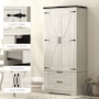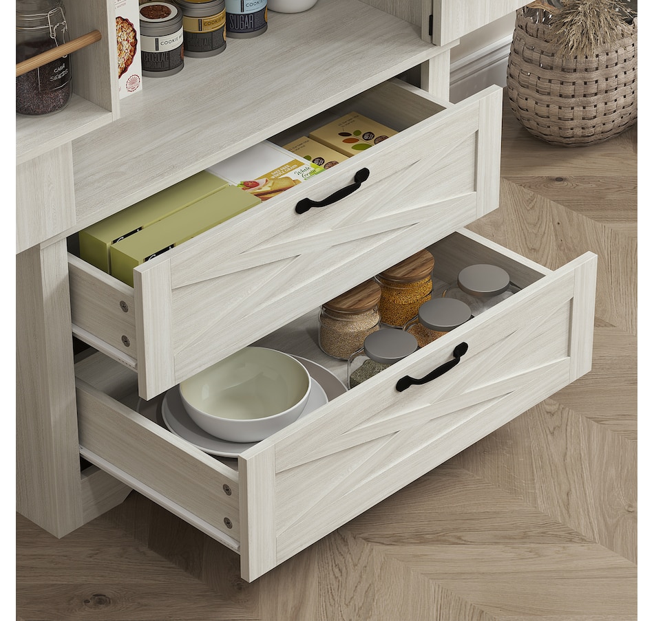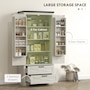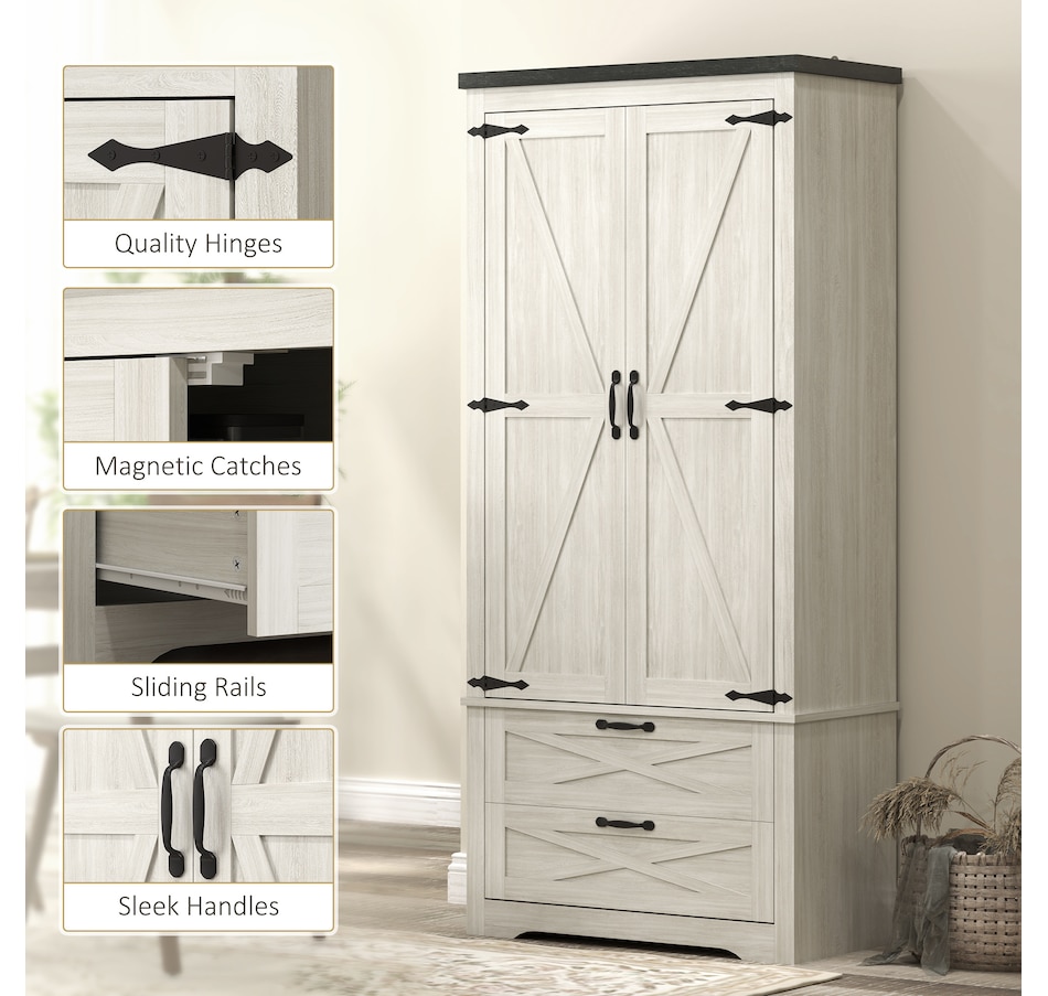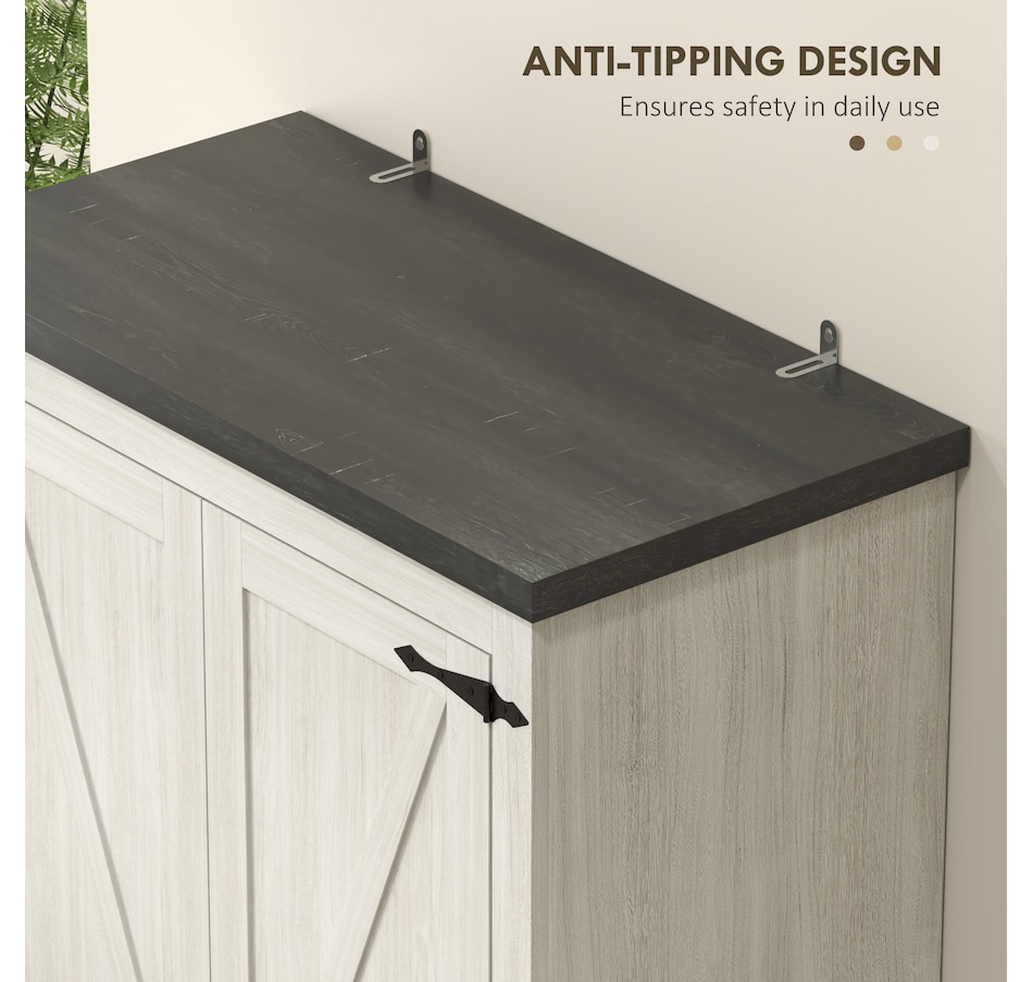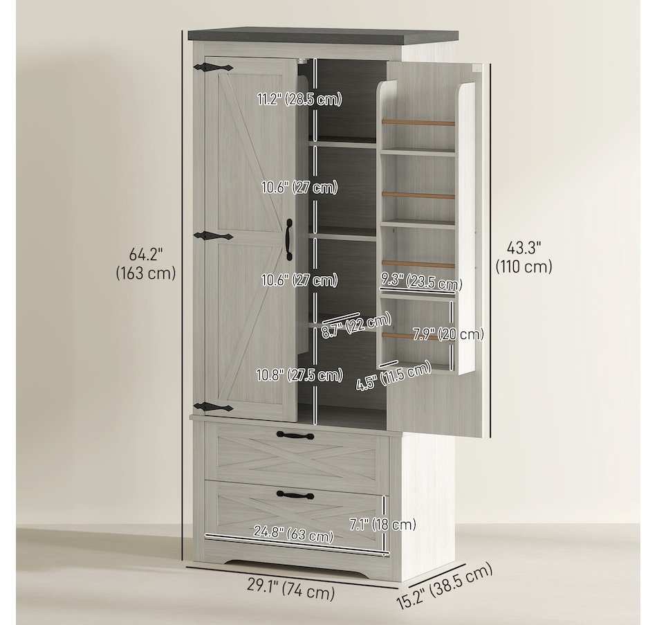 Add a touch of farmhouse flair to your kitchen with the HOMCOM kitchen pantry storage cabinet. Featuring a distressed white finish and charming barn doors, this kitchen pantry blends style with functionality. Organize effortlessly with a four-tier cabinet featuring adjustable shelves for flexible storage and two spacious drawers for tableware, along with eight door shelves for small items. Suitable for any kitchen needing extra storage with a hint of charm.Features: