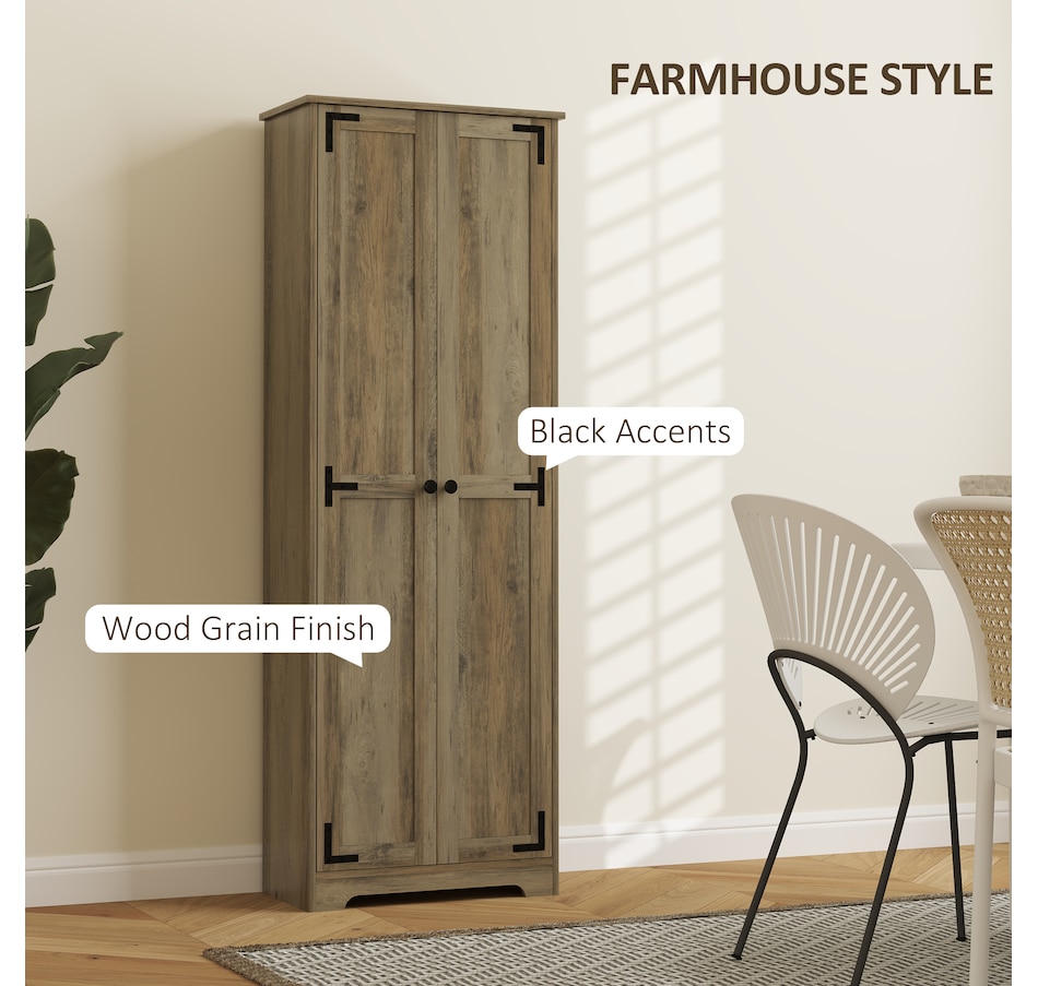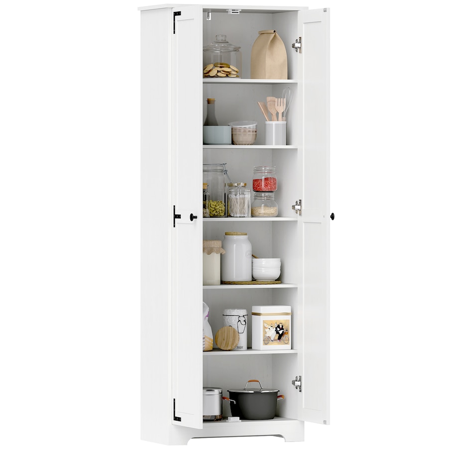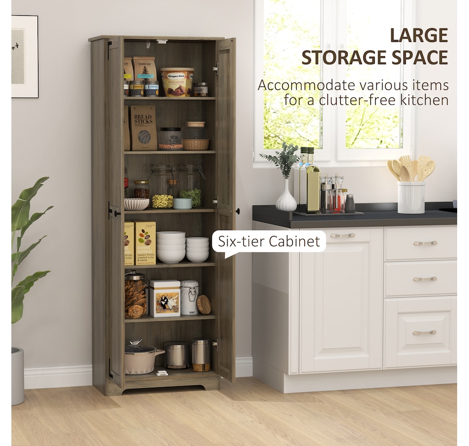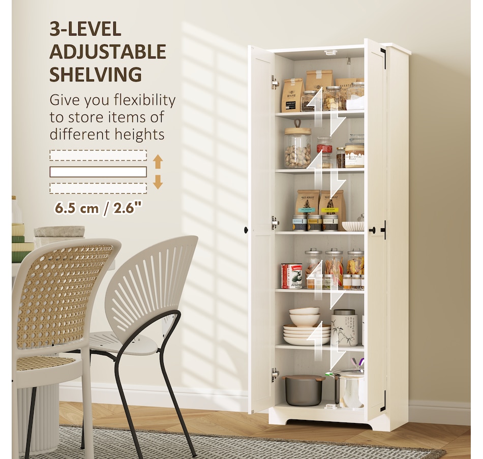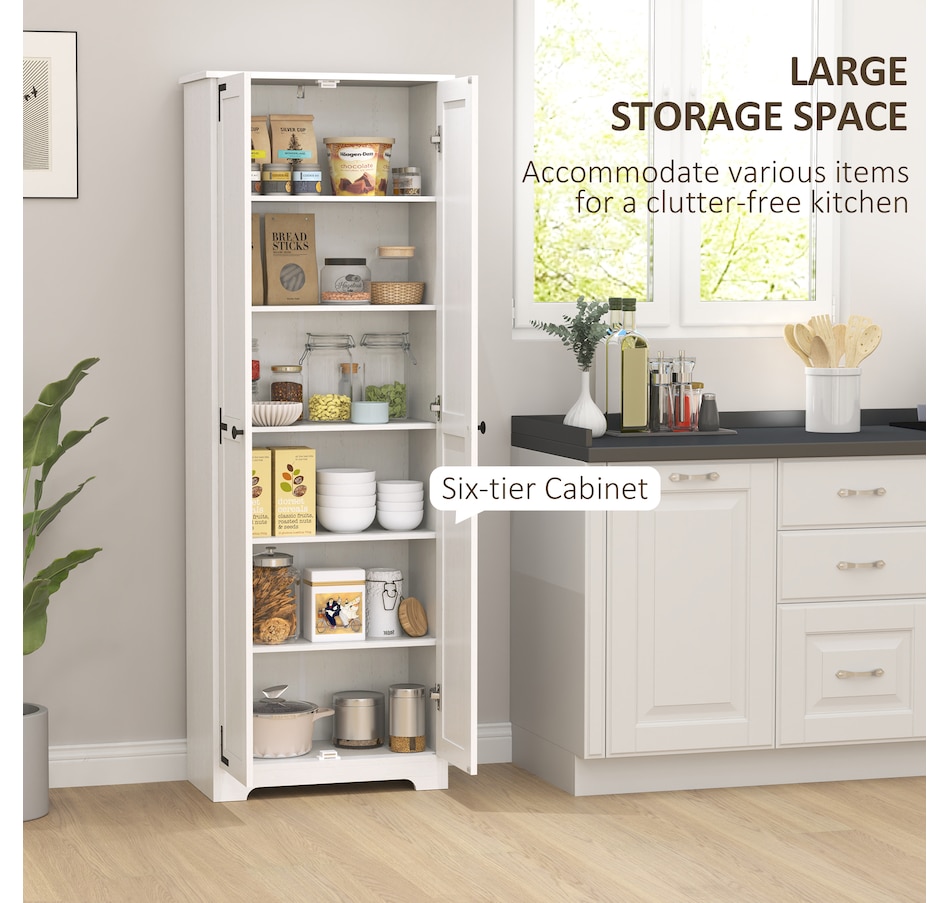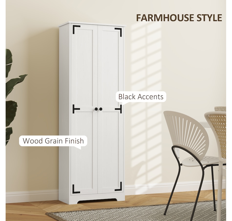 Discover the charm of the HOMCOM Kitchen Storage Cabinet, blending vintage elegance with functional design. This kitchen cabinet features a six-tier, two-door layout and four adjustable shelves, suitable for organizing your kitchen. Black accents add a modern touch to this farmhouse tall cabinet, ensuring style meets practicality in your home.Features: