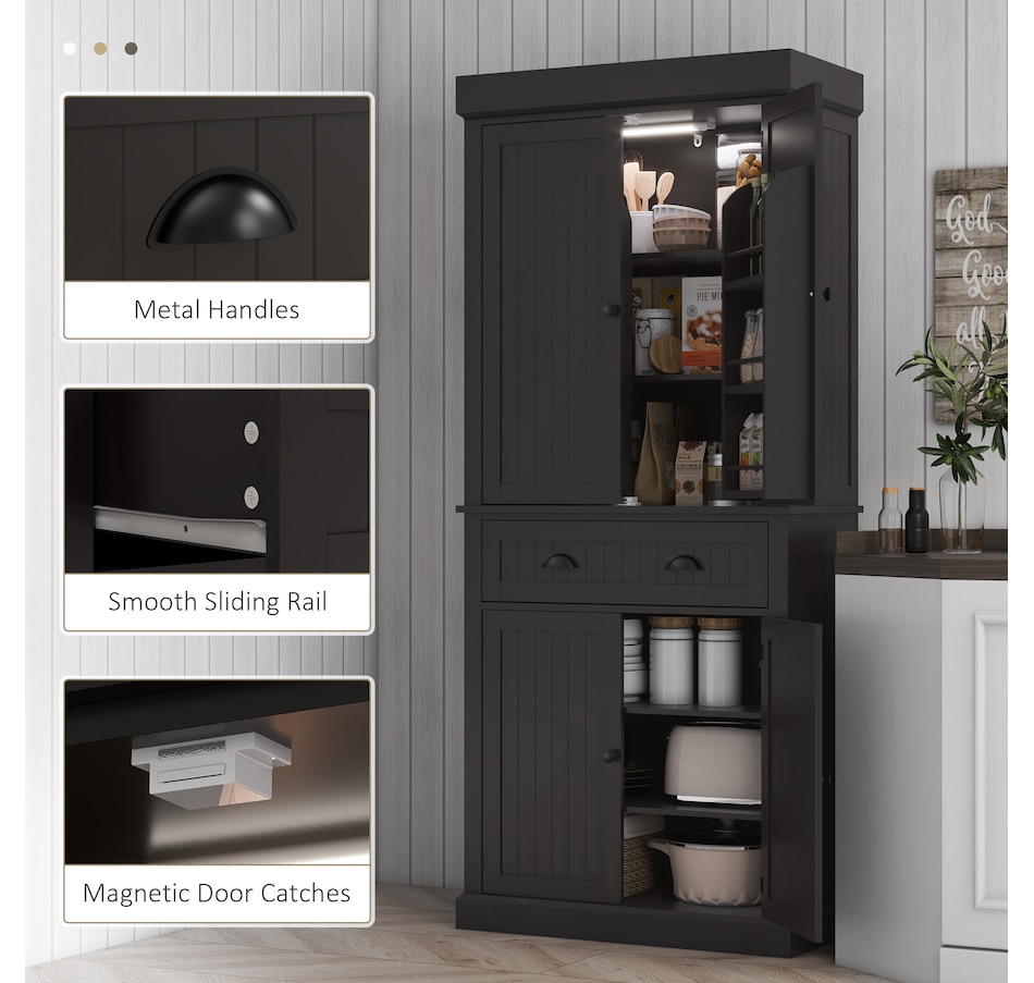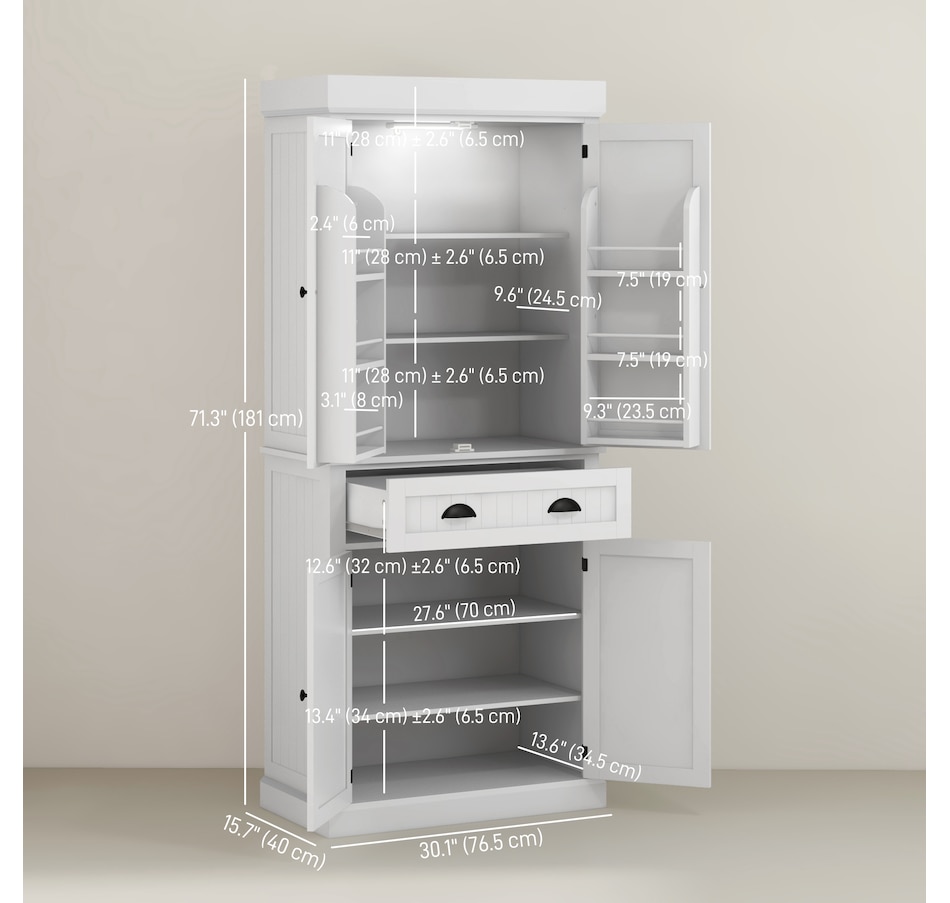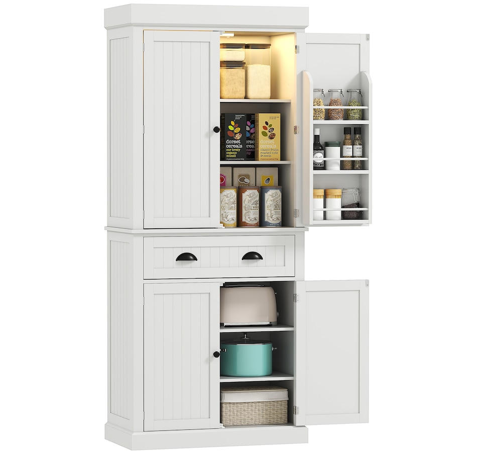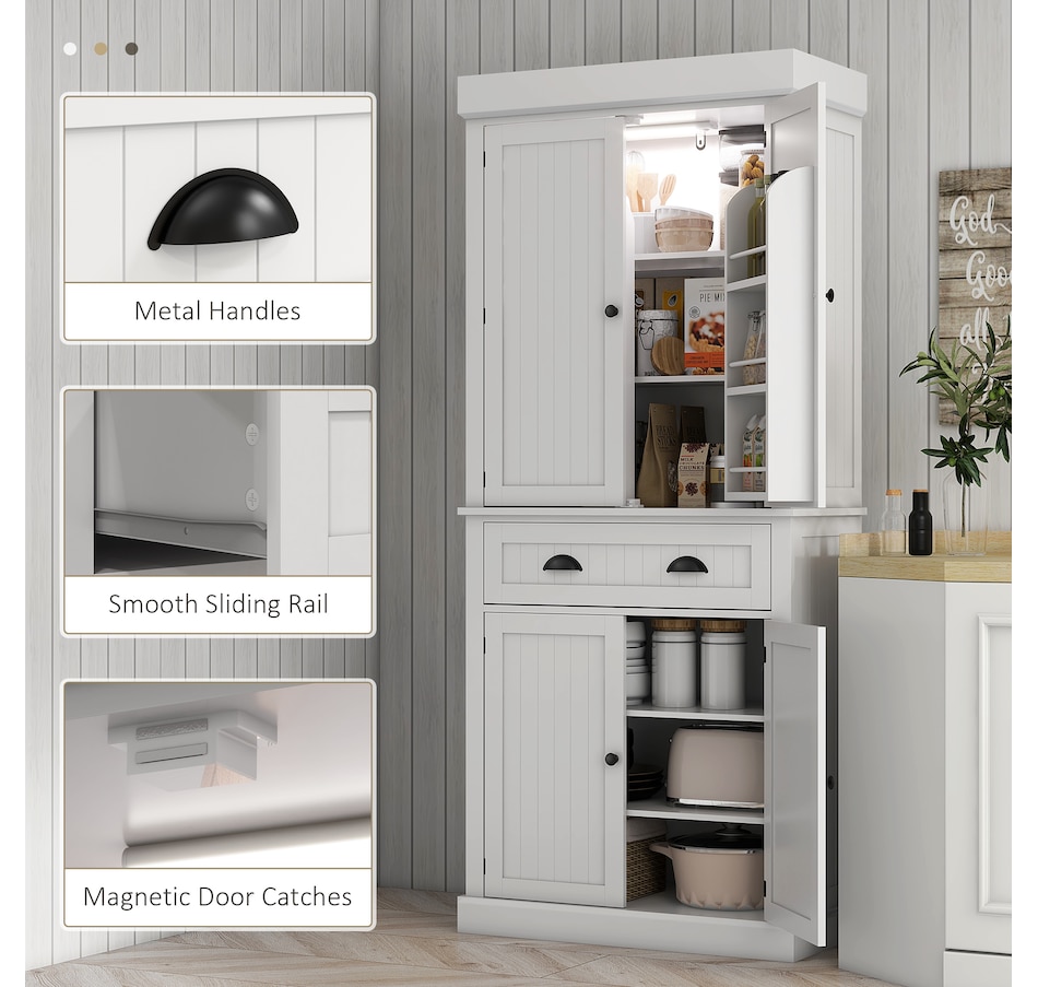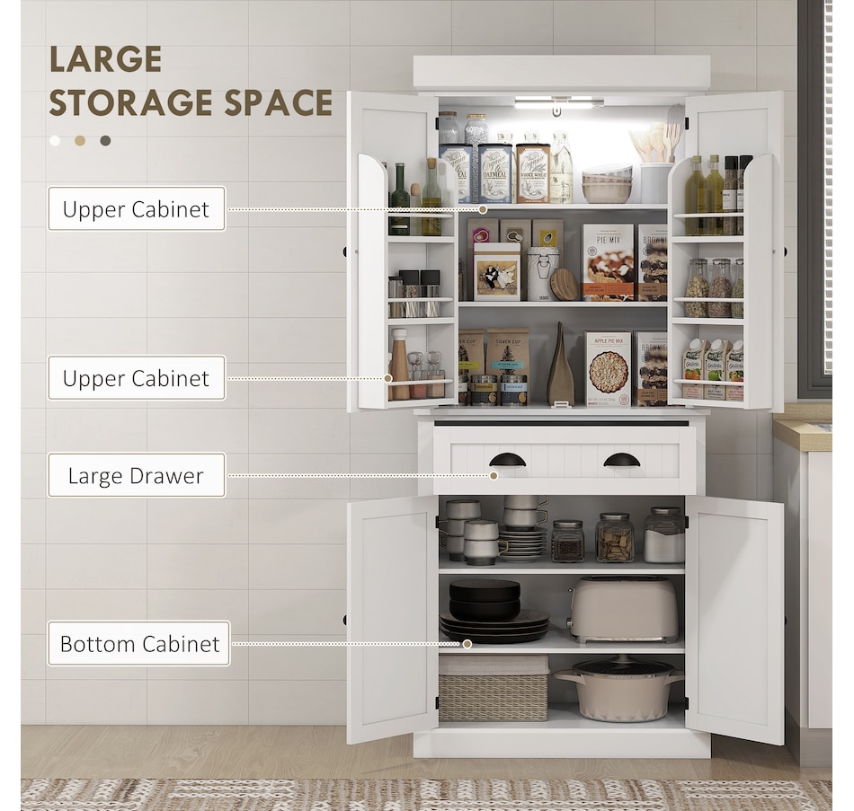 Light up your kitchen organization with the HOMCOM storage cabinet with doors and shelves! Featuring adjustable LED lights with motion and light sensors, this tall cabinet offers customizable illumination. Enjoy ample storage with a drawer, four adjustable shelves, and six side door racks, all secured with magnetic locks for seamless access. Transform your kitchen storage into a well-lit, functional space!
