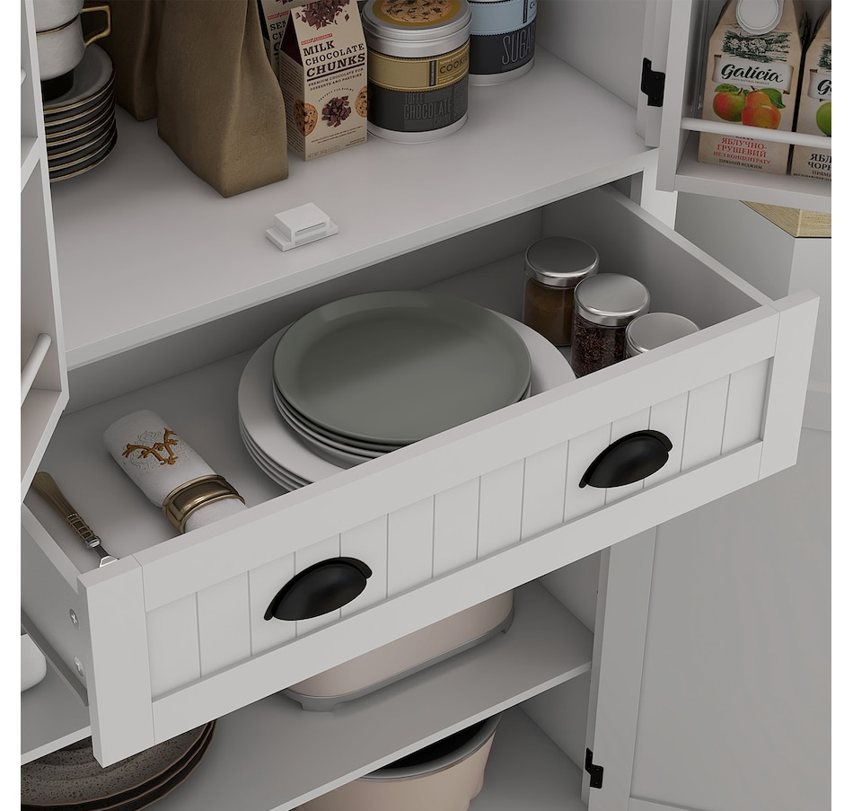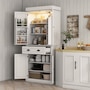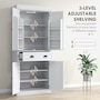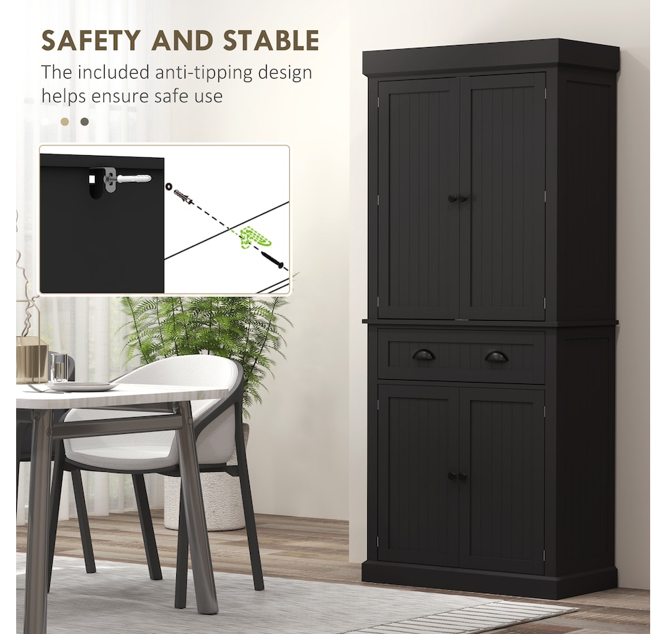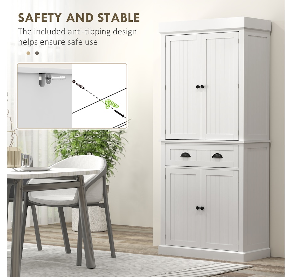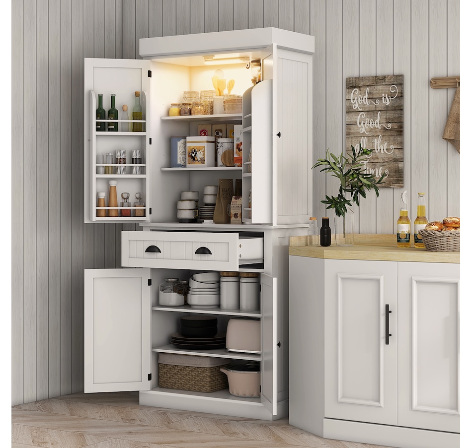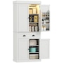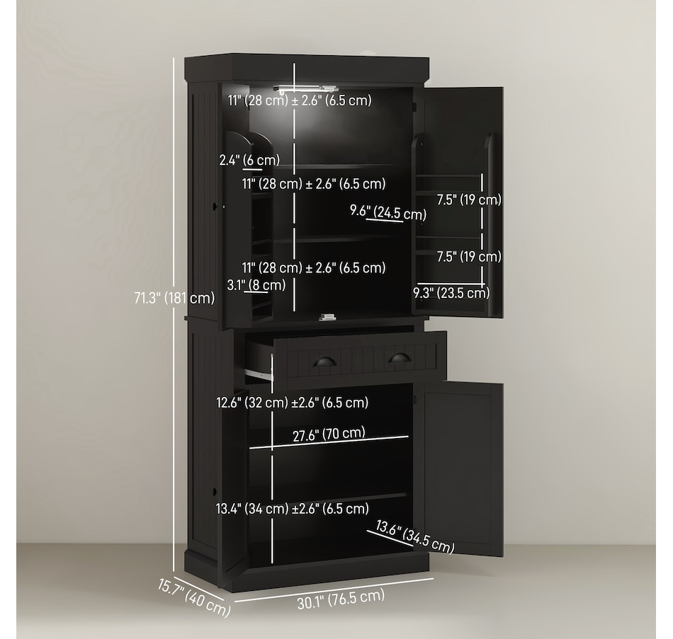 Light up your kitchen organization with the HOMCOM storage cabinet with doors and shelves! Featuring adjustable LED lights with motion and light sensors, this tall cabinet offers customizable illumination. Enjoy ample storage with a drawer, four adjustable shelves, and six side door racks, all secured with magnetic locks for seamless access. Transform your kitchen storage into a well-lit, functional space!