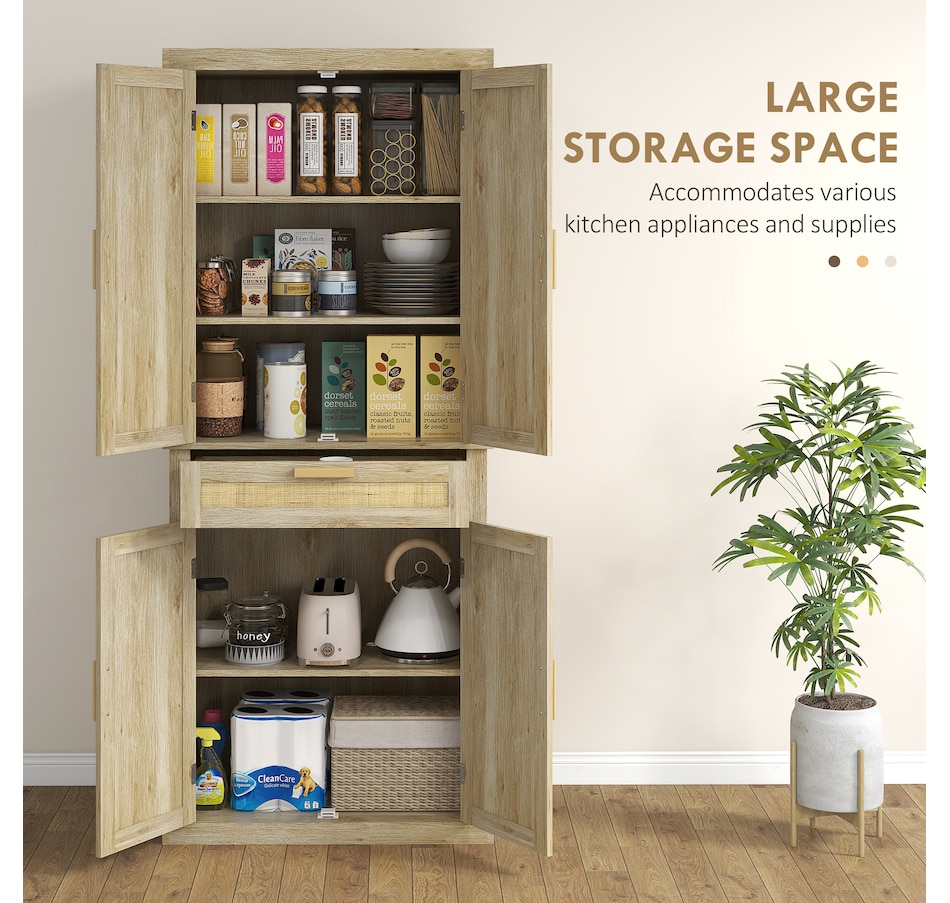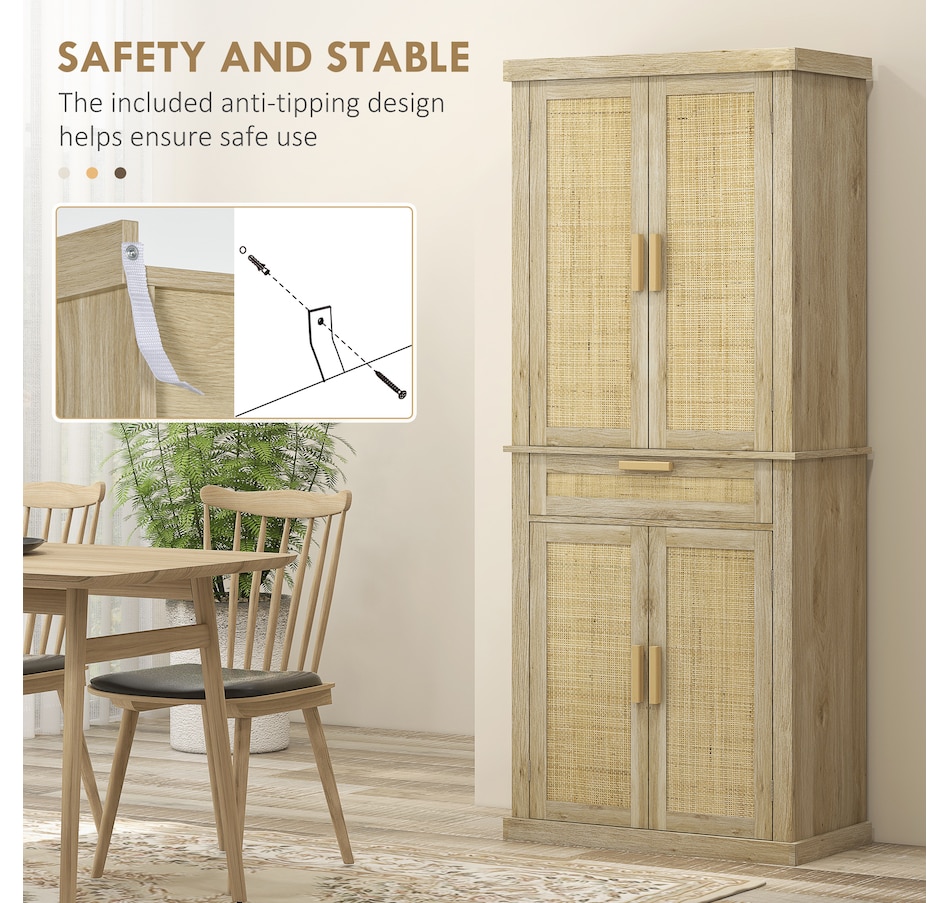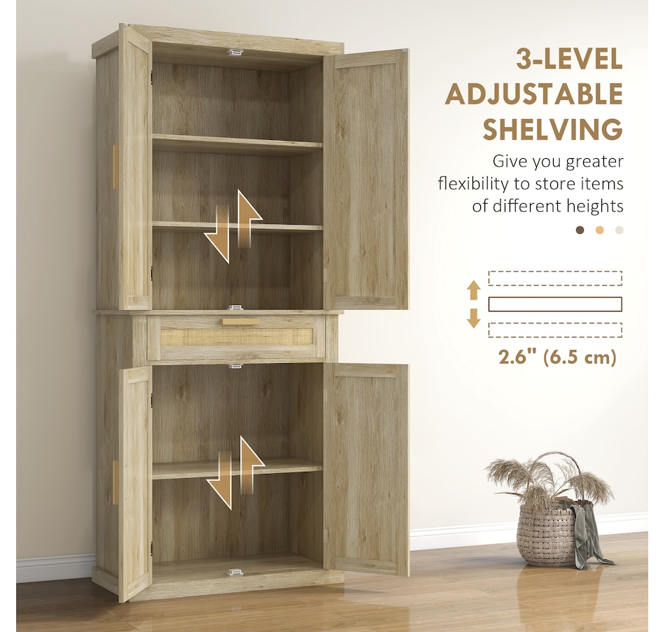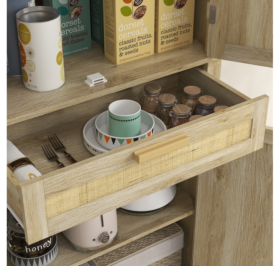 Upgrade your kitchen with the food pantry cabinet from HOMCOM. Featuring stylish rattan elemants and wood strip handles on chic oak finish body, this pantry storage cabinet adds flair to any space. With five tiers in two cabinets and a handy middle drawer, organize your kitchen essentials has never been easier. Besides, two 3-level adjustable shelves make it a versatile tall cabinet. Say hello to a clutter-free kitchen.Features: