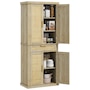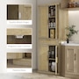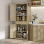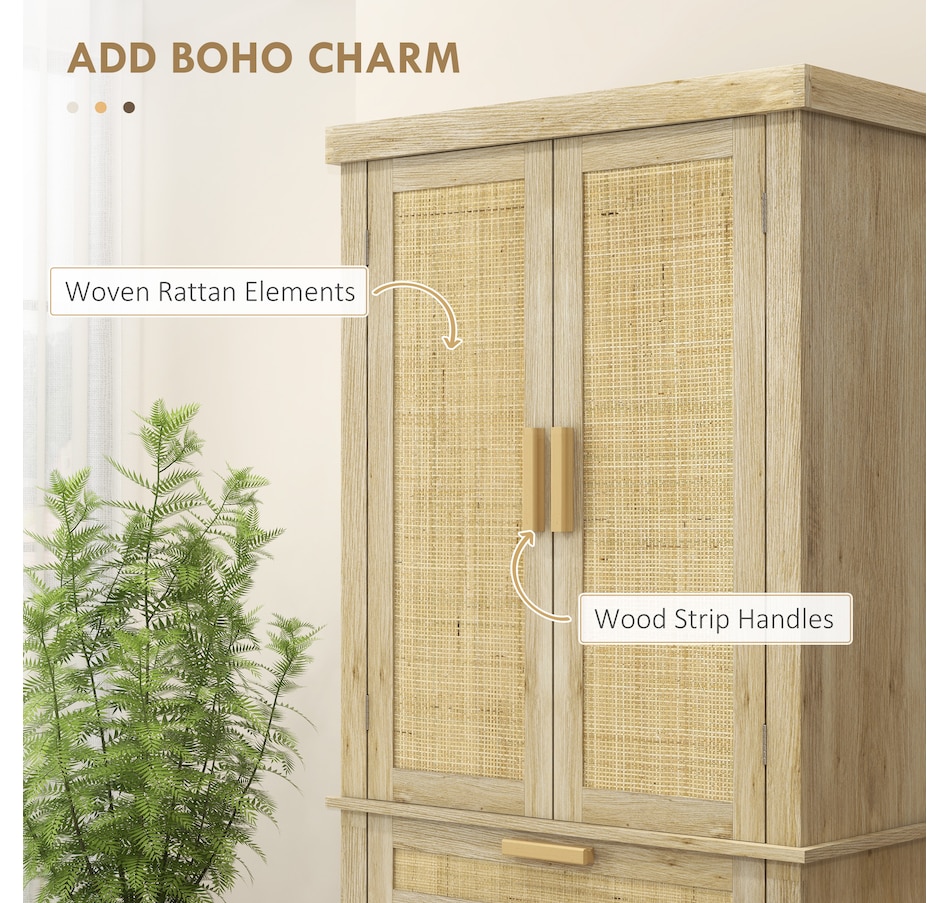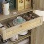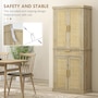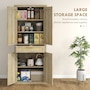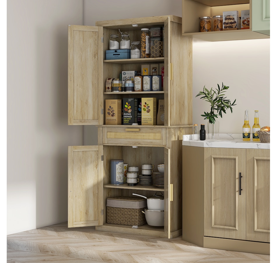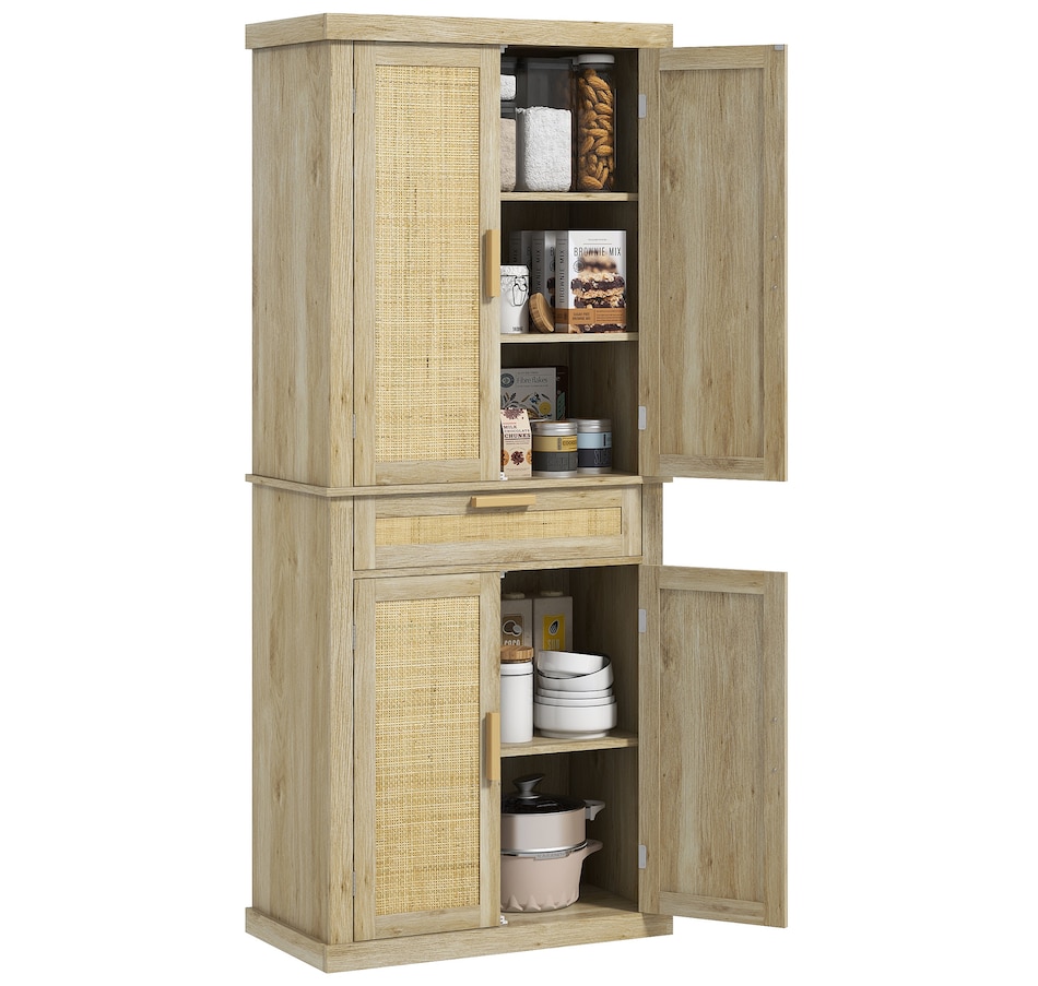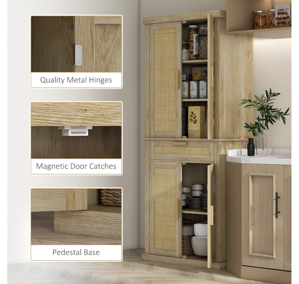 Upgrade your kitchen with the food pantry cabinet from HOMCOM. Featuring stylish rattan elemants and wood strip handles on chic oak finish body, this pantry storage cabinet adds flair to any space. With five tiers in two cabinets and a handy middle drawer, organize your kitchen essentials has never been easier. Besides, two 3-level adjustable shelves make it a versatile tall cabinet. Say hello to a clutter-free kitchen.Features: