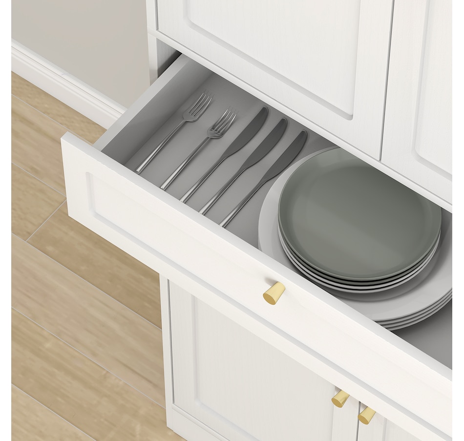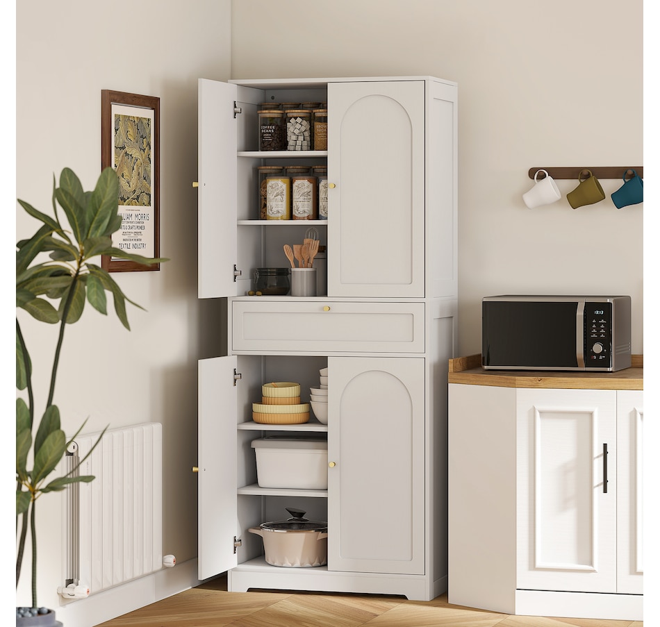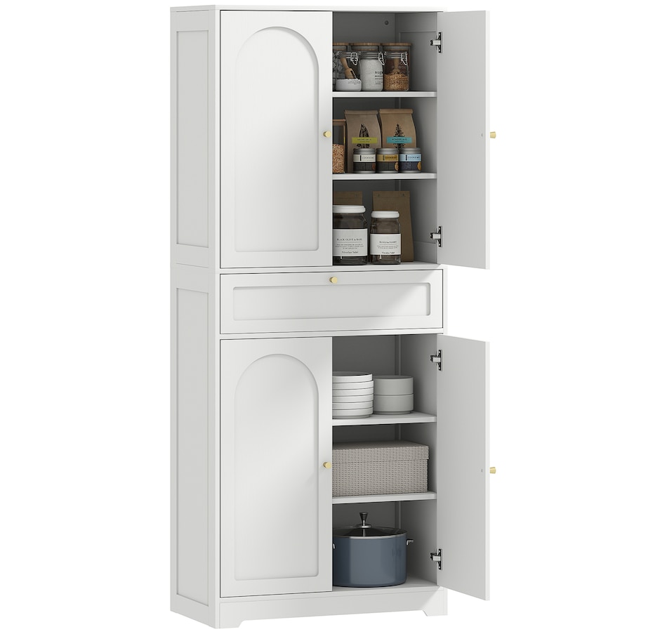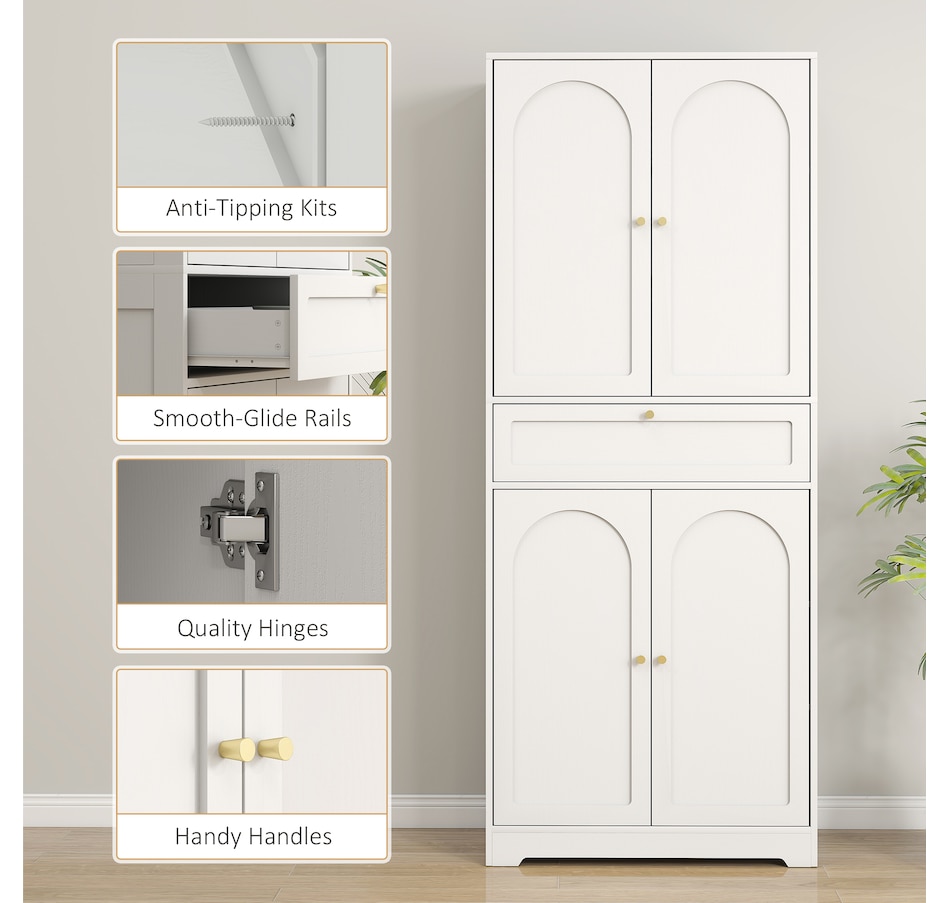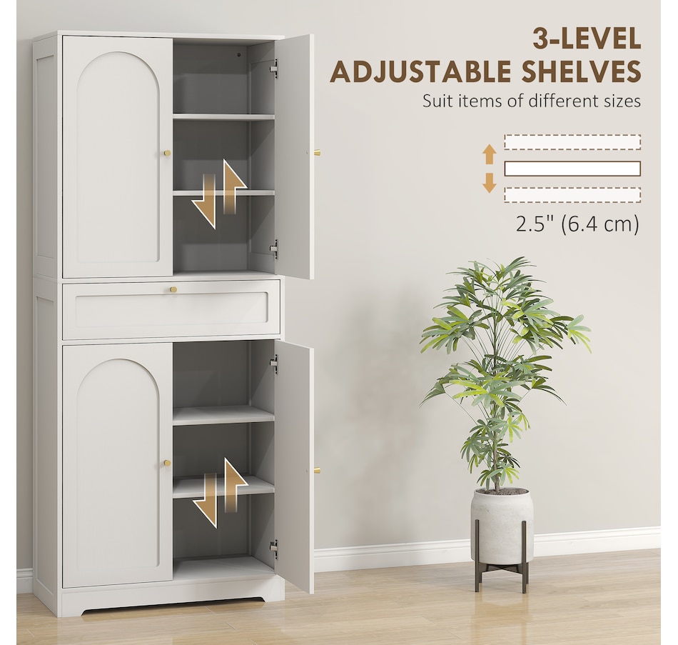 Discover the charm of organization with the HOMCOM kitchen pantry storage cabinet, your new partner in decluttering! This stylish kitchen cabinet features a handy drawer and two spacious cabinets, each with adjustable shelves to fit your needs. Gold handles and shaker-style door panels add a touch of elegance to any kitchen pantry or dining area.Features: