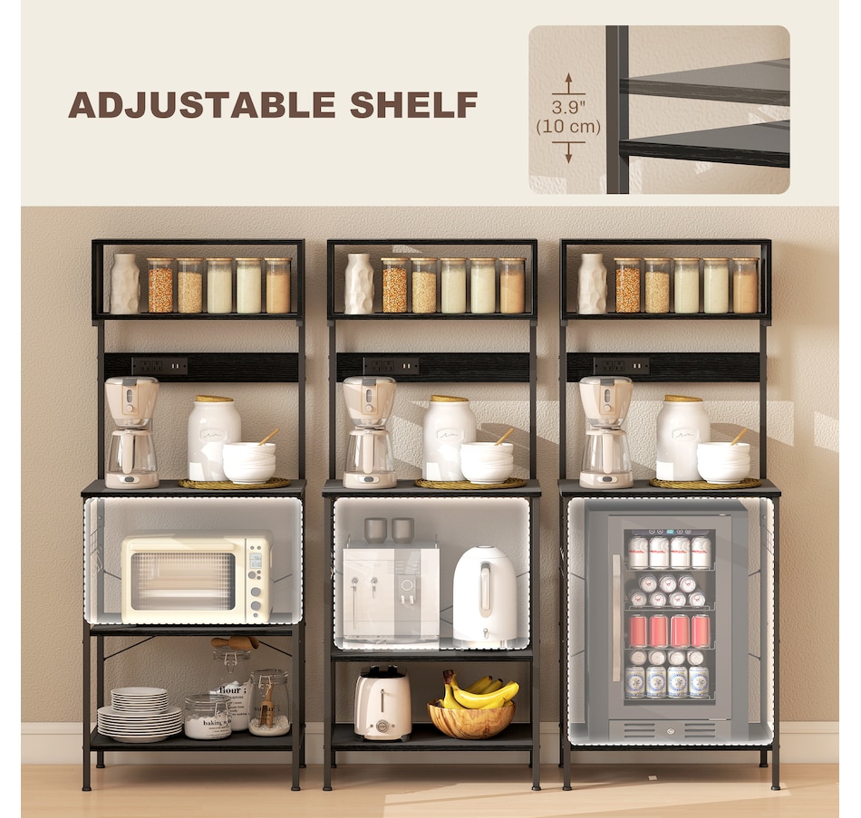 Discover your kitchen's untapped potential with our kitchen shelving unit. Stylish and versatile, it can transform any space into an organized culinary paradise. Master the art of hosting with the coffee bar setup, while the built-in power outlet ensures your favourite appliances are always ready for action. Boasting storage space, our industrial microwave stand helps declutter countertops, giving you room to unleash your inner chef. Make your house a home with HOMCOM.