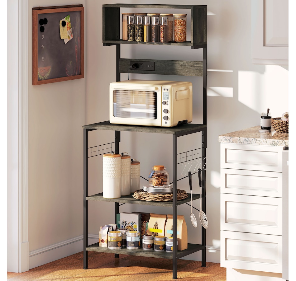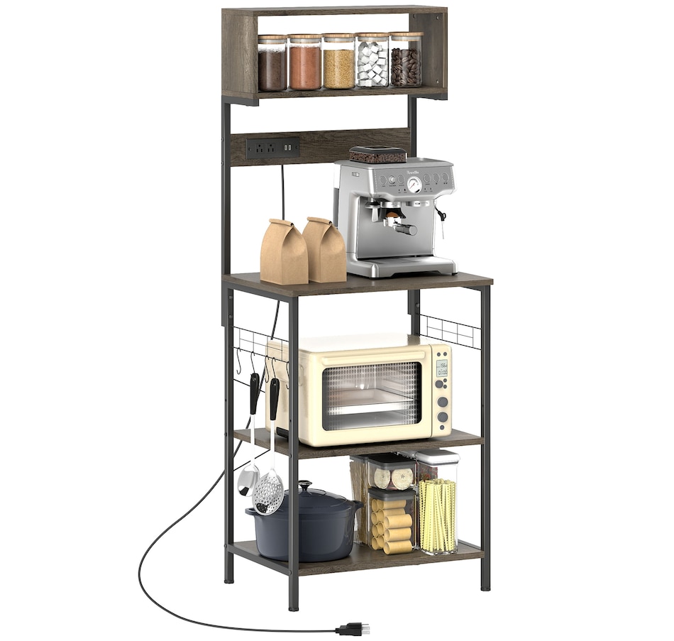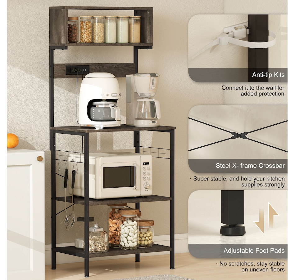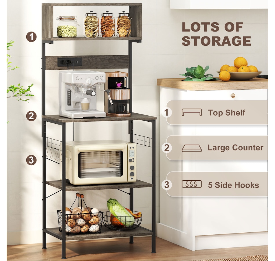 Baker's Rack with Power Outlet, USB Charger, Microwave Stand, Grey