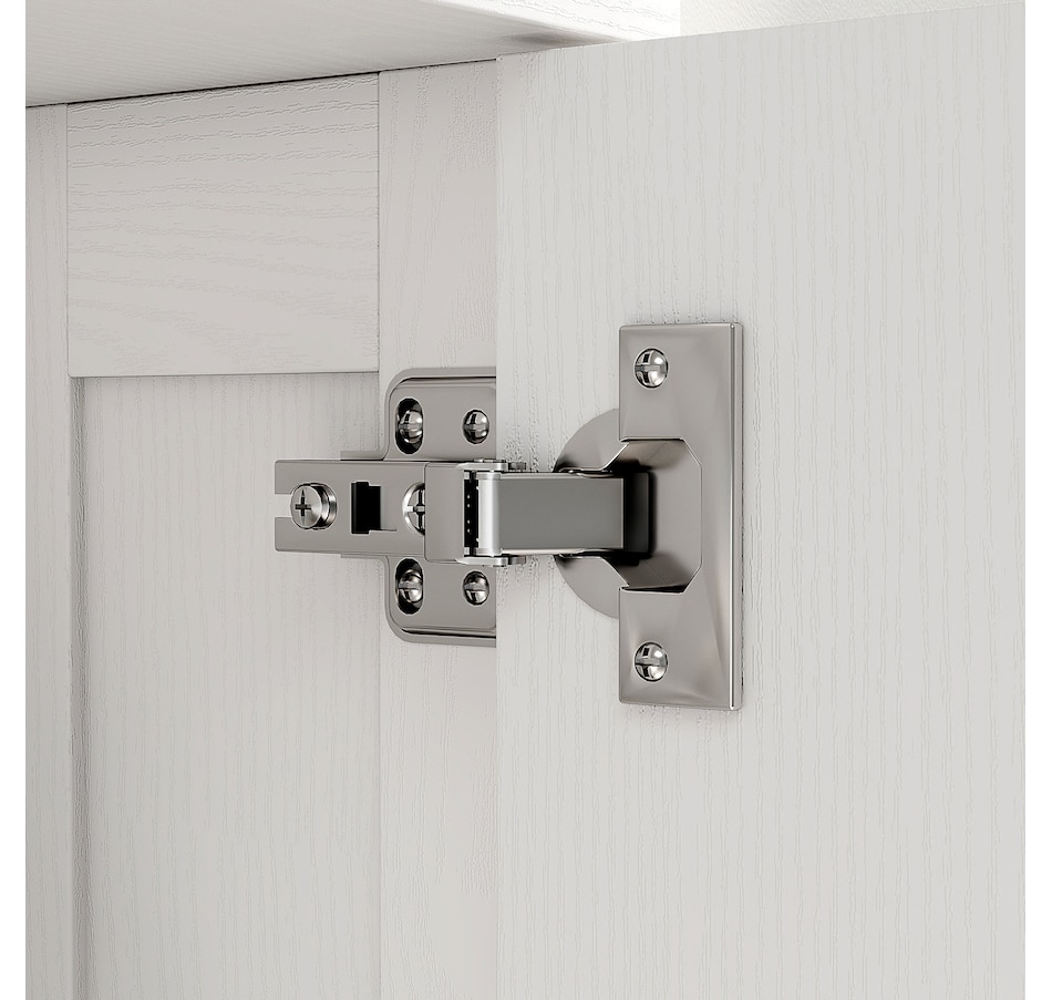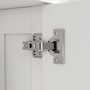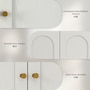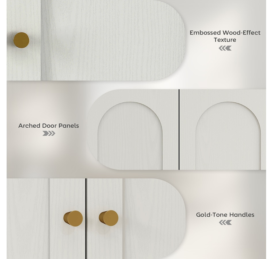 ● Gold metal handles with white embossed wood finish and arched door panels create a modern style;