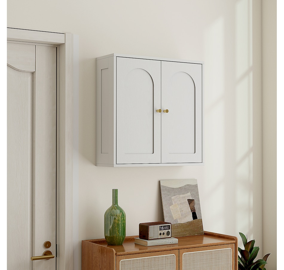 ● Dual shelves behind two doors organize essentials, enhancing daily routines effortlessly;