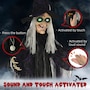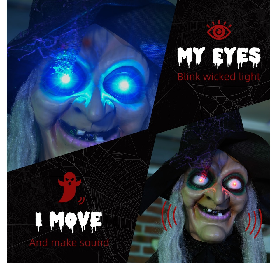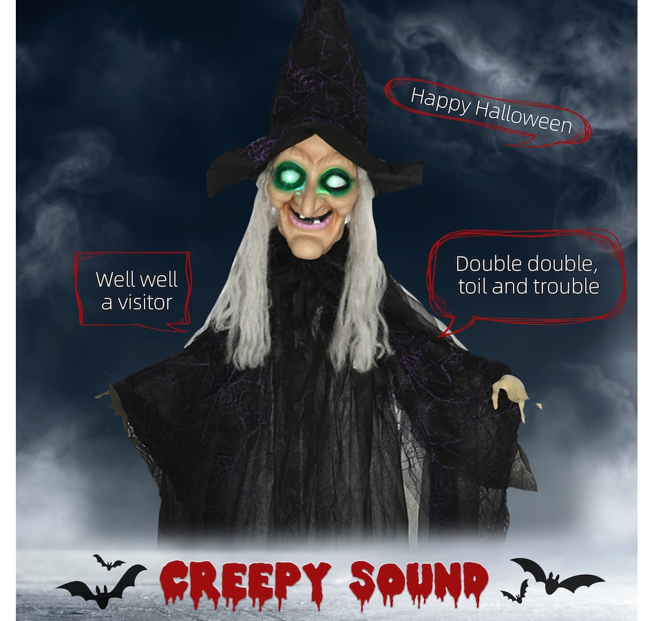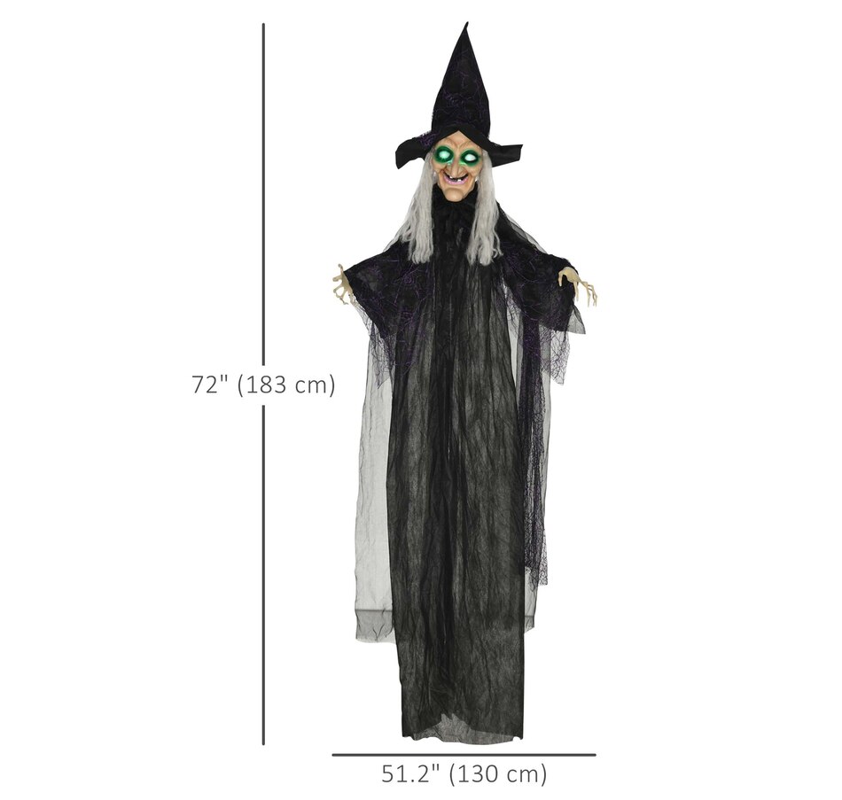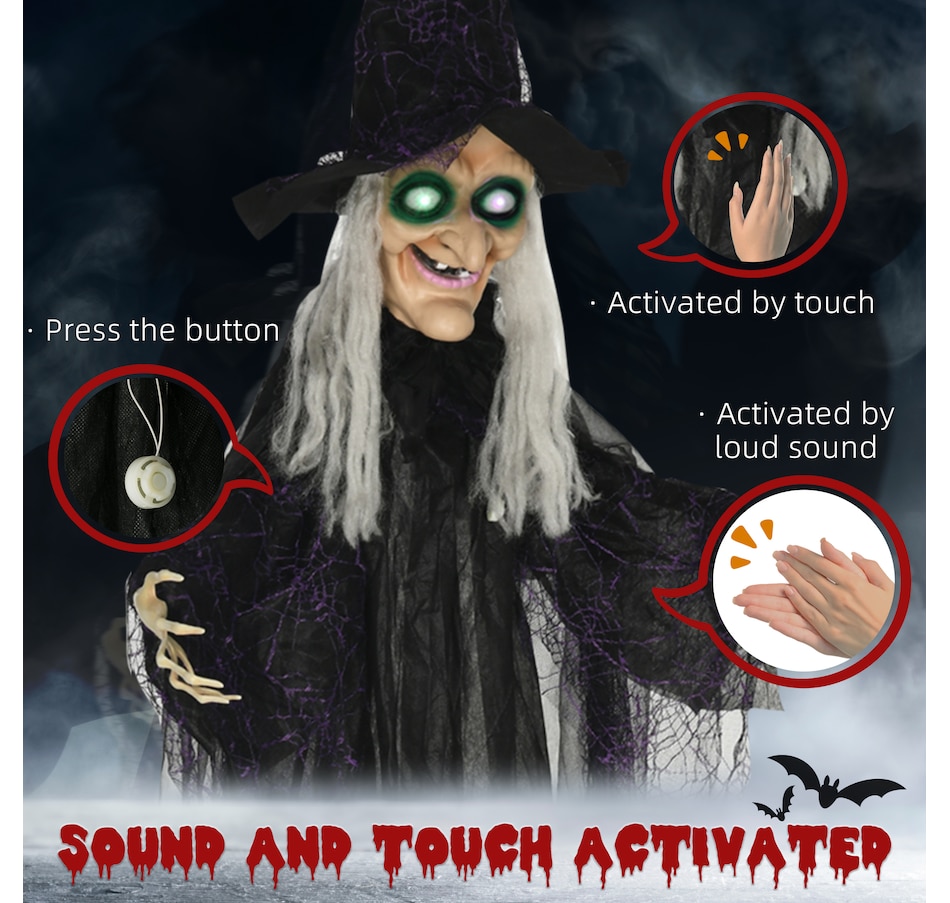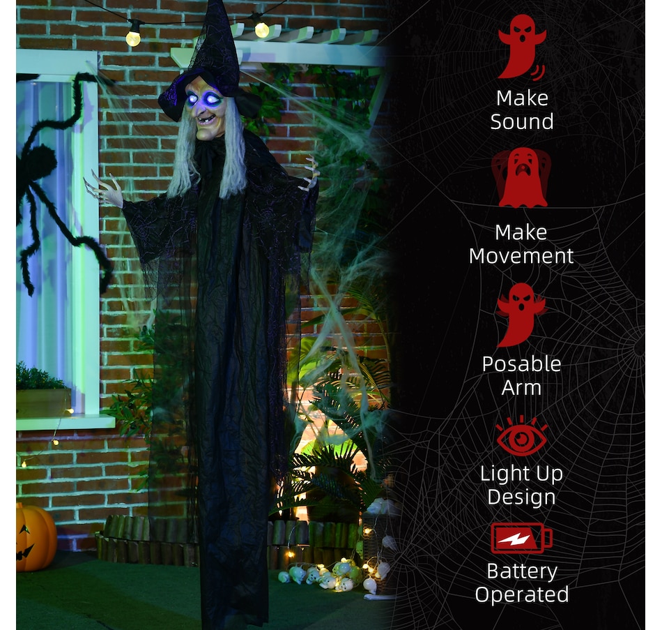 Unleash spine-chilling thrills with the HOMCOM Halloween Prop, featuring a black witch with white hair and hands. Triggered by touch or piercing screams, this fiendish figure boasts eerie colorful glowing eyes and witch speaking voice, making it a standout Halloween outdoor decoration for any haunted house or outdoor Halloween decor.Features: