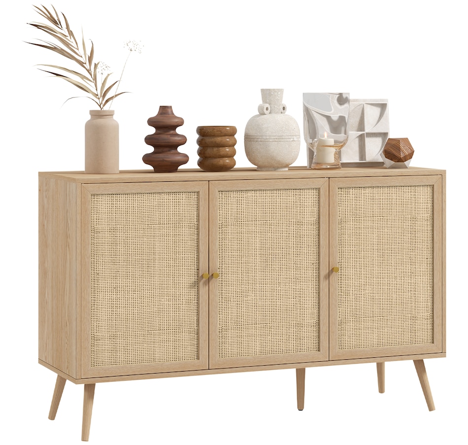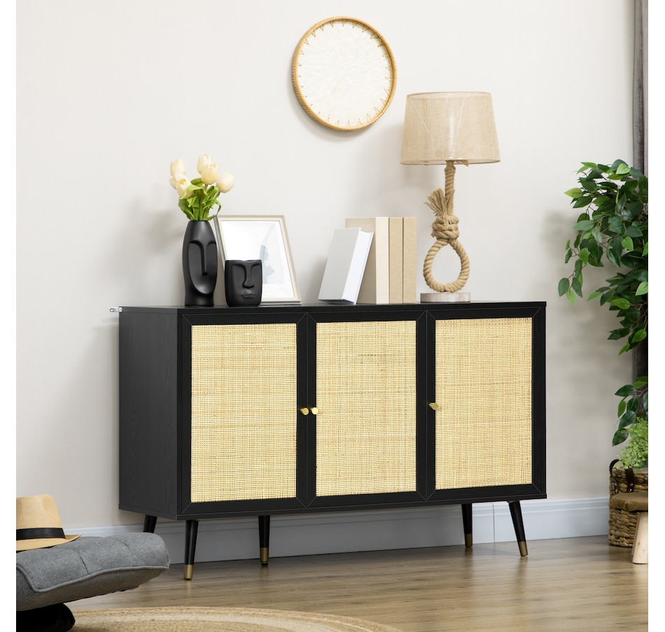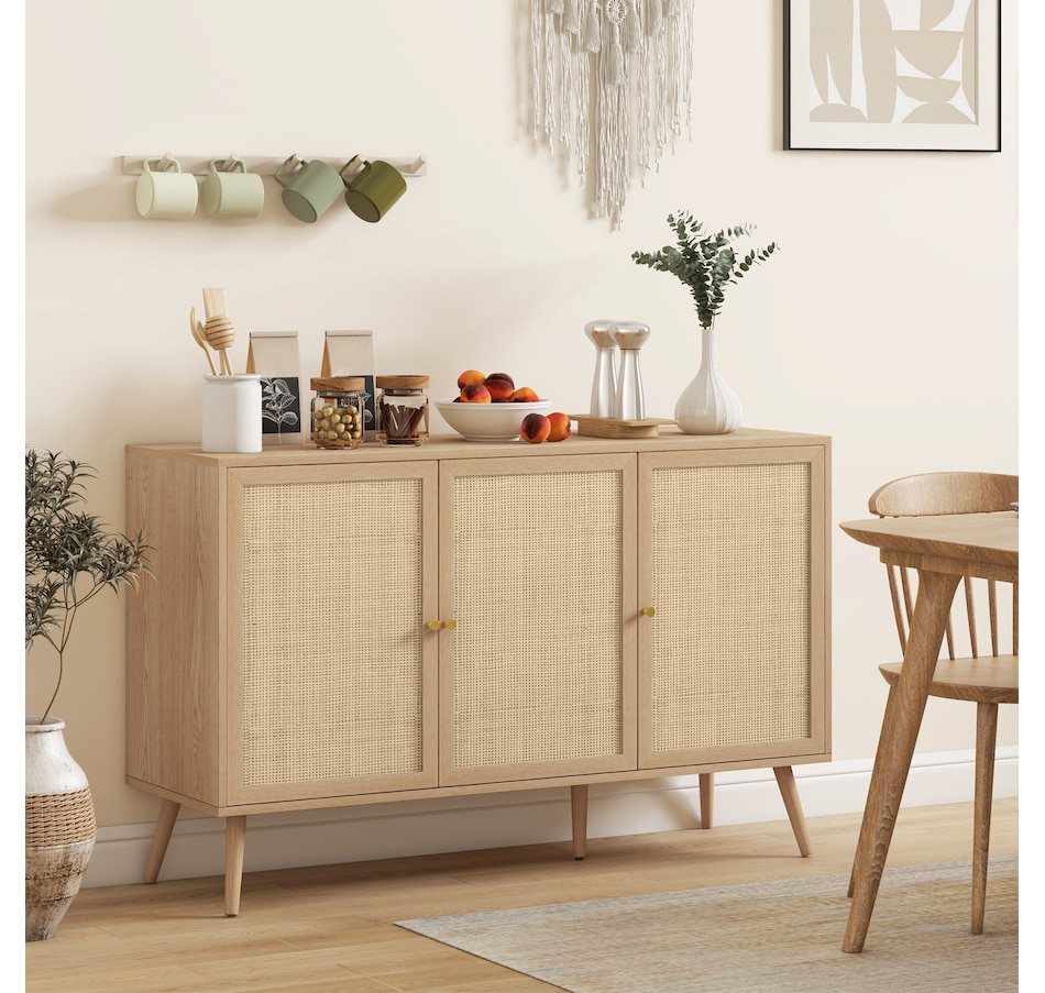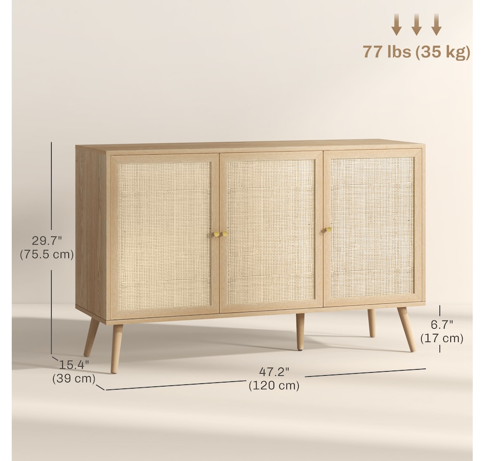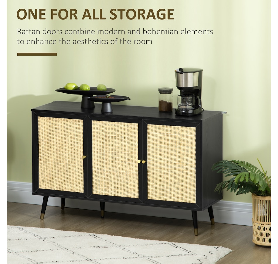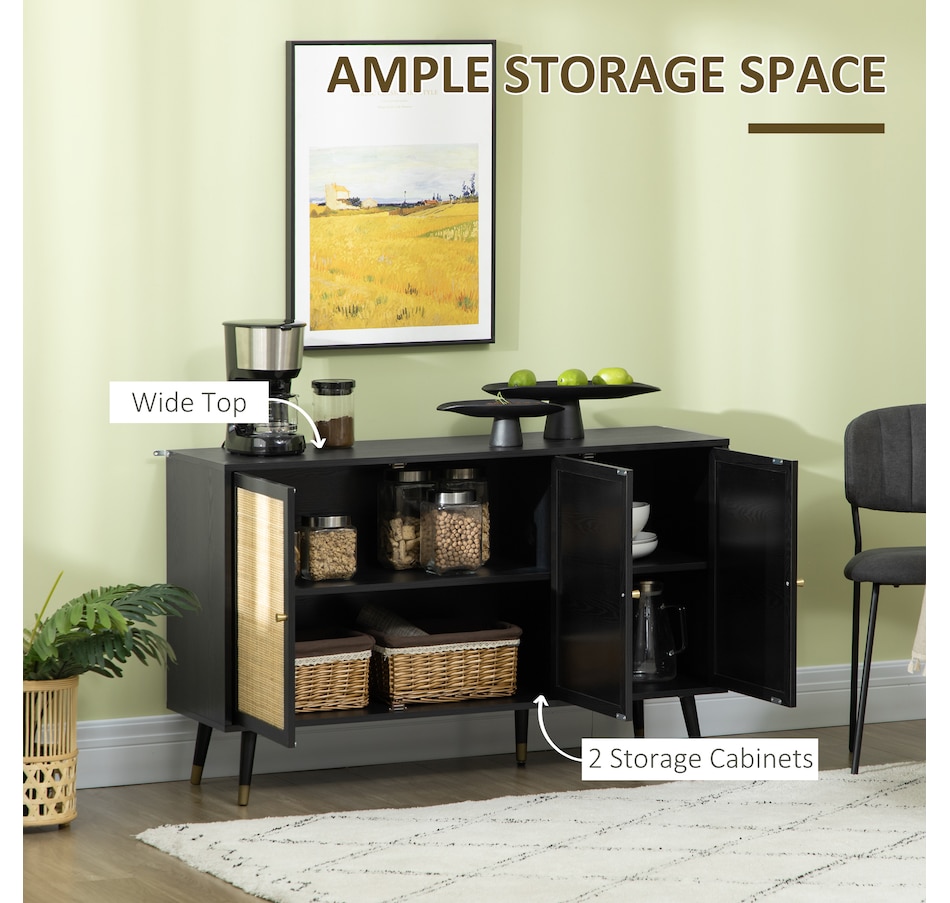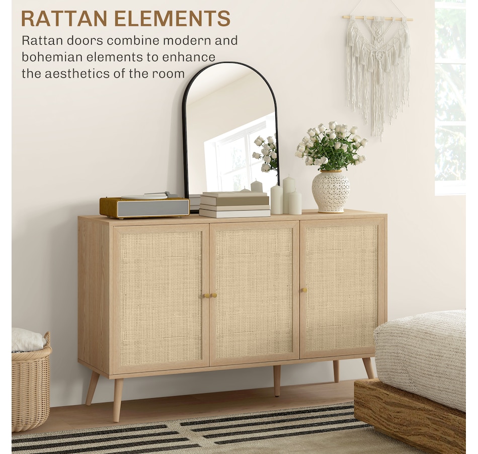 Quickly add that needed storage and get kitchen supplies clutter-free with HOMCOM kitchen storage cabinet. Natural woven rattan panel keeps the item without dust and brings boho chic vibe to your home. The rattan cabinet with two storage cabinets and a tabletop provides a versatile storage solution. Complete with five eucalyptus legs for strong support. This sideboard from HOMCOM is a great choice.Features: