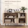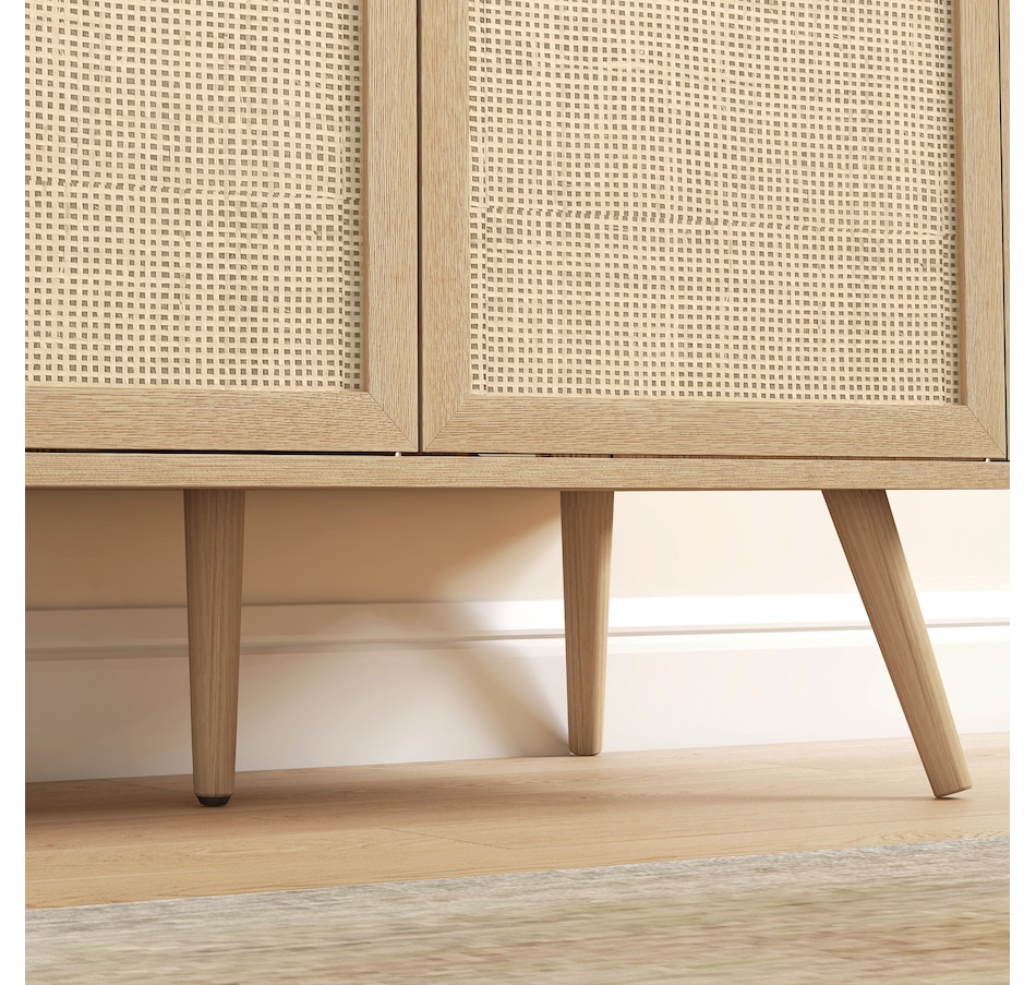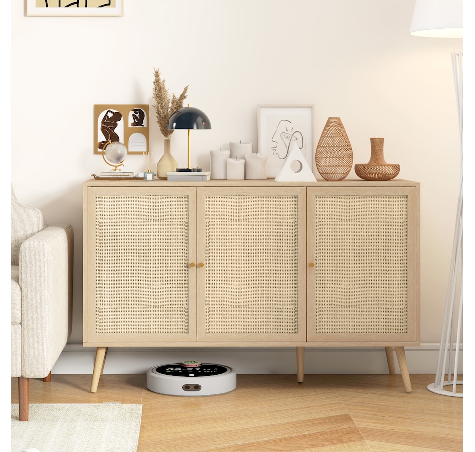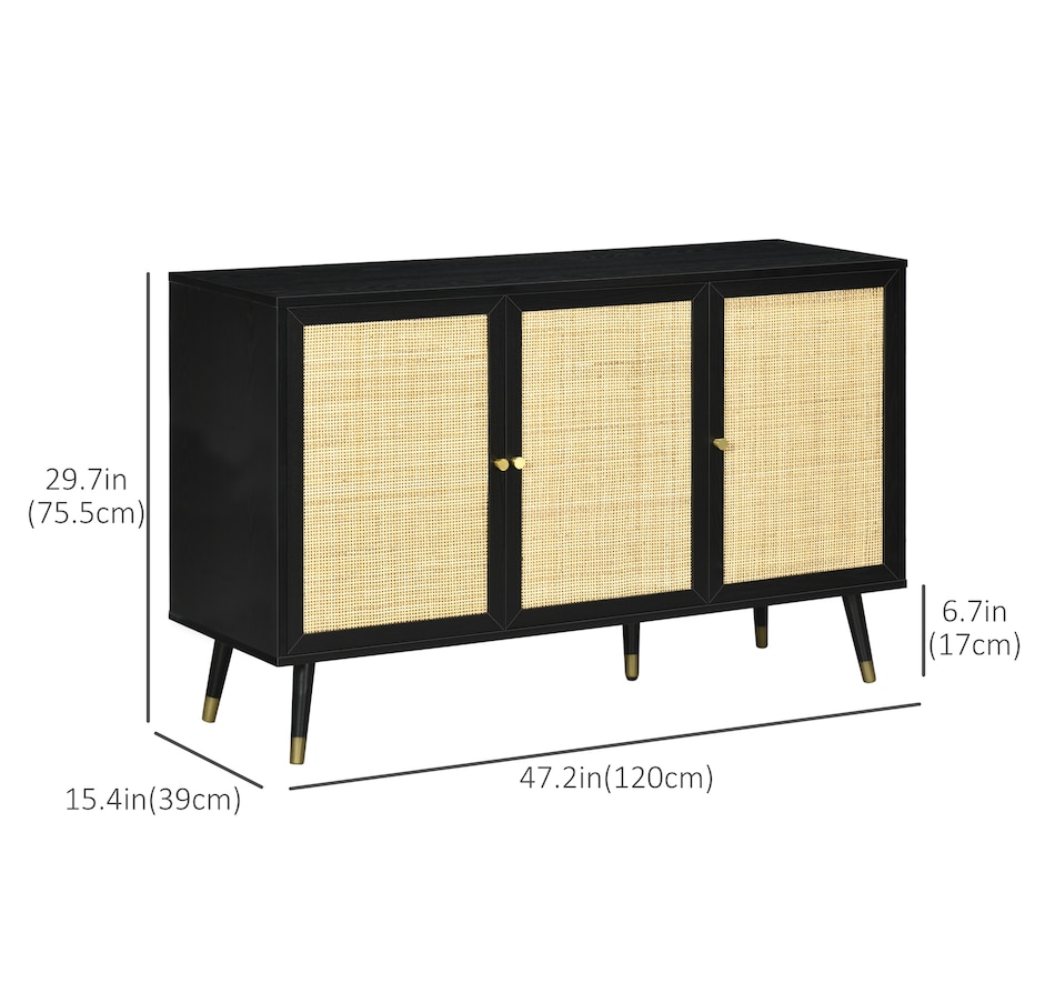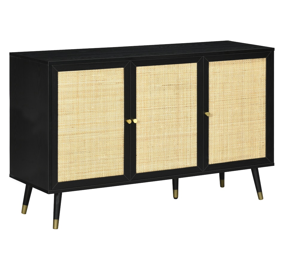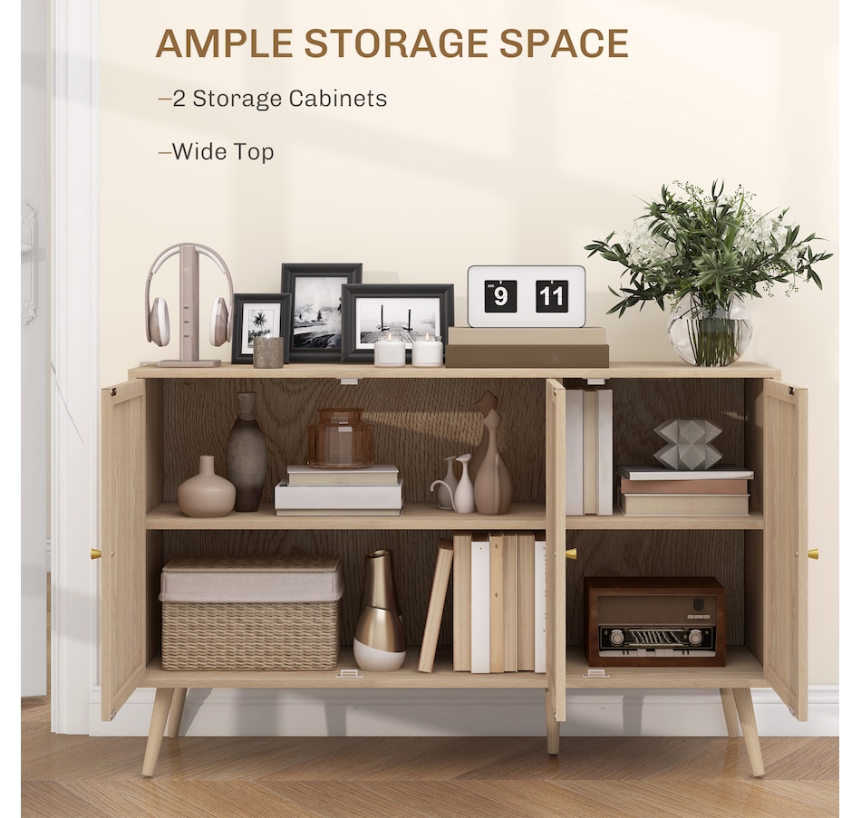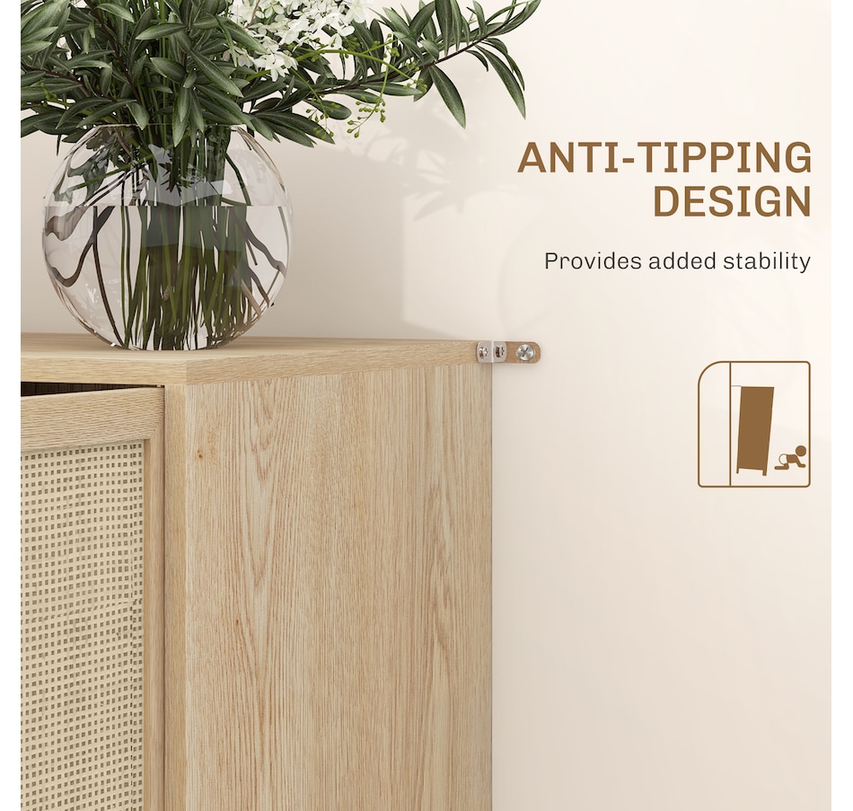 Quickly add that needed storage and get kitchen supplies clutter-free with HOMCOM kitchen storage cabinet. Natural woven rattan panel keeps the item without dust and brings boho chic vibe to your home. The rattan cabinet with two storage cabinets and a tabletop provides a versatile storage solution. Complete with five eucalyptus legs for strong support. This sideboard from HOMCOM is a great choice.Features: