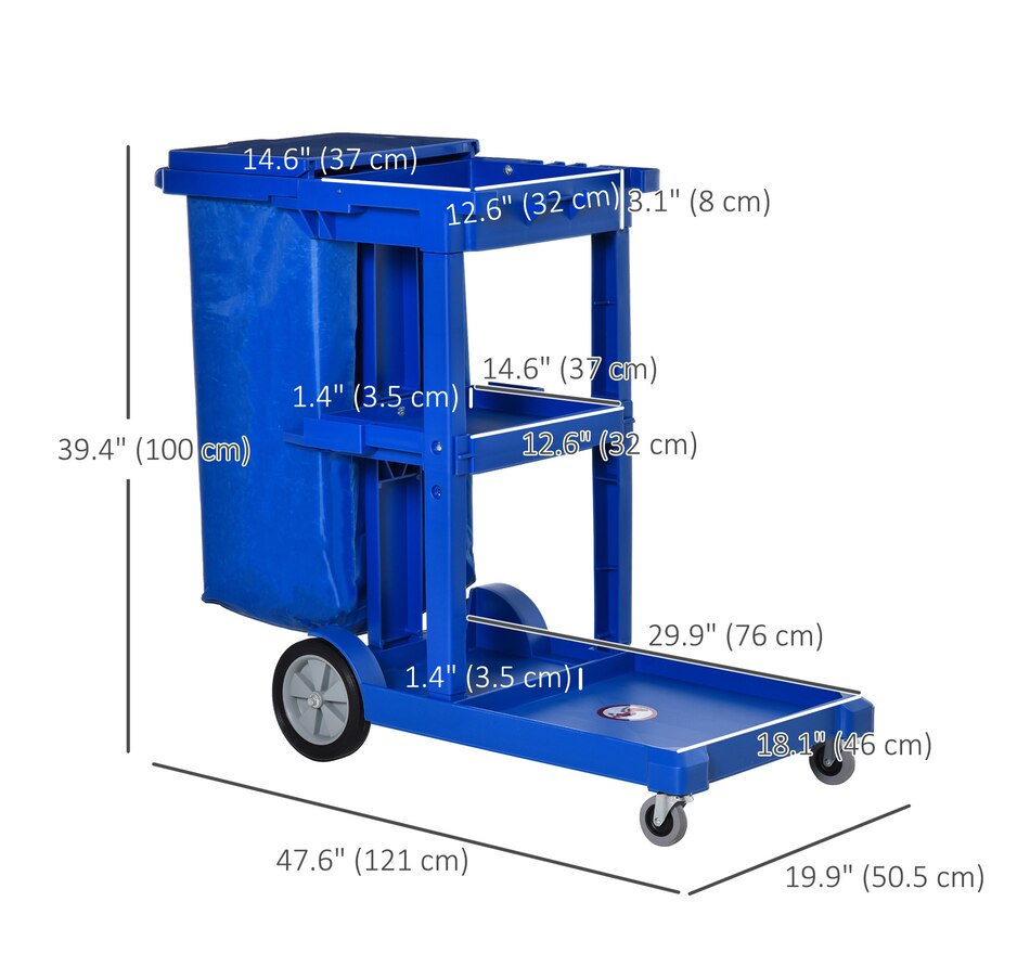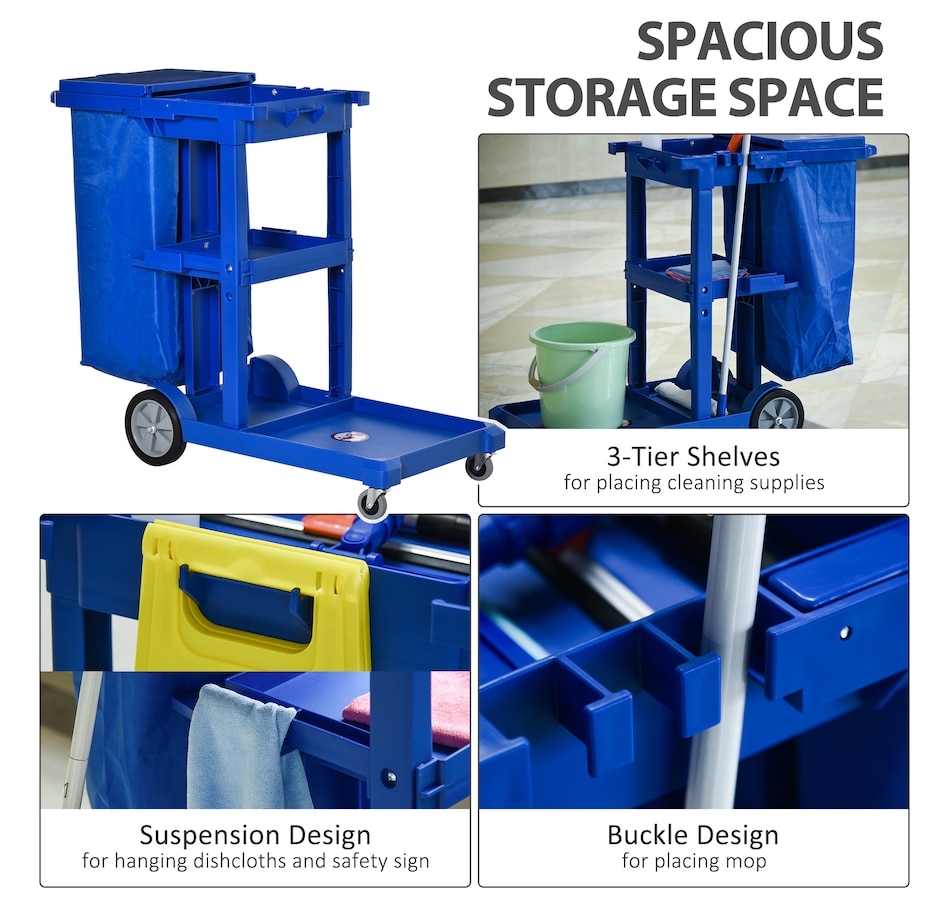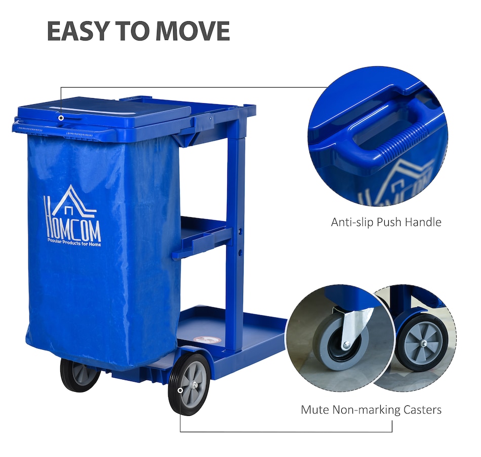 Make your cleaning effective with our janitorial carts on wheels from HOMCOM, it offers a commercial-grade cleaning solution for use at hotels, restaurants, offices etc. The rolling cleaning caddy is made of PP plastic, easy to clean. Non-marking casters and anti-slip push handle make this cart simple to move around without noise. With 3-tier shelves, a large PVC trash bag and buckle design, providing professional style quality to make your work easier and cleaner.Features: